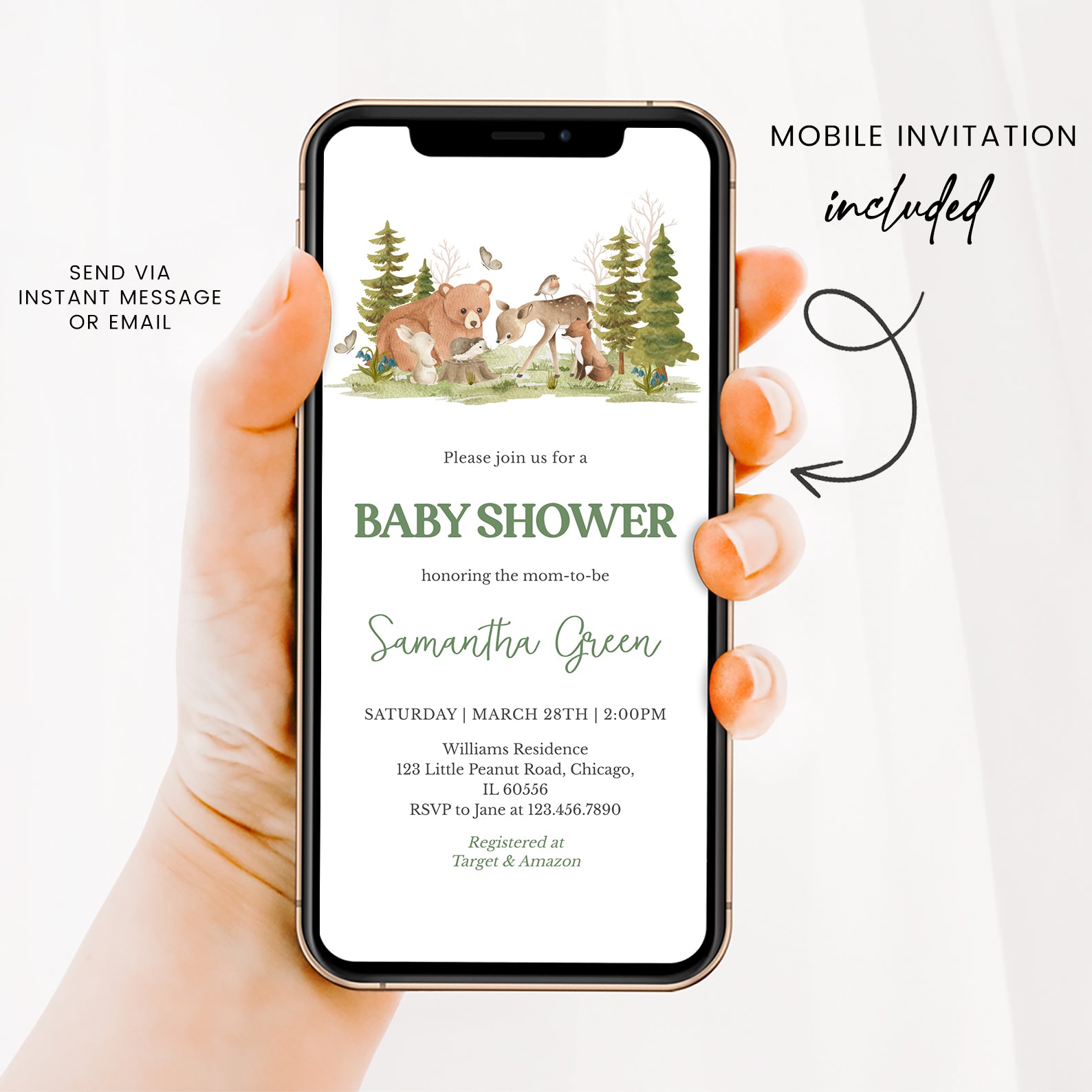 Celebrate the joy of new beginnings with our enchanting evergreen baby shower digital invitation, featuring adorable forest animals like a playful bear, a curious rabbit, a charming hedgehog, and a gentle deer with a bird perched on its back. This whimsical design is beautifully complemented by a clever fox and fluttering butterflies, creating a delightful woodland scene that sets the perfect tone for your special gathering. Invite your loved ones to share in the magic of this memorable occasion with a touch of nature's charm.