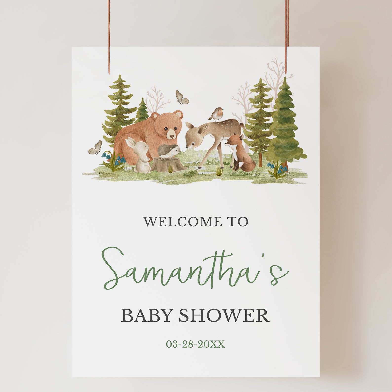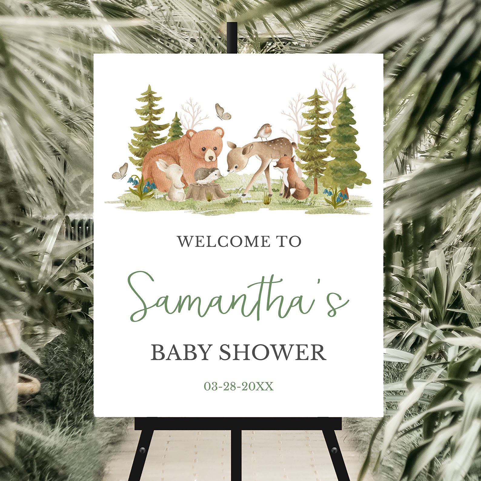 Welcome guests to your baby shower with this adorable woodland-themed sign. Featuring charming forest animals, fluttering butterflies, and a whimsical nature-inspired design, it sets the perfect tone for a cozy and memorable celebration!