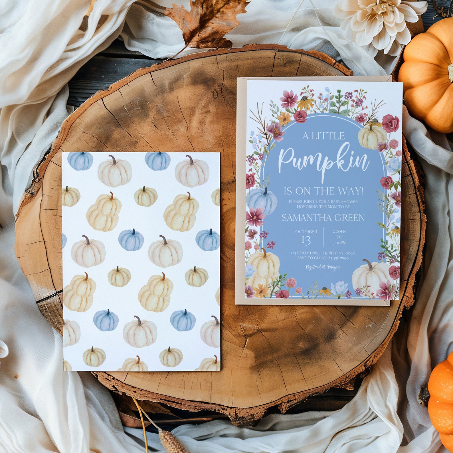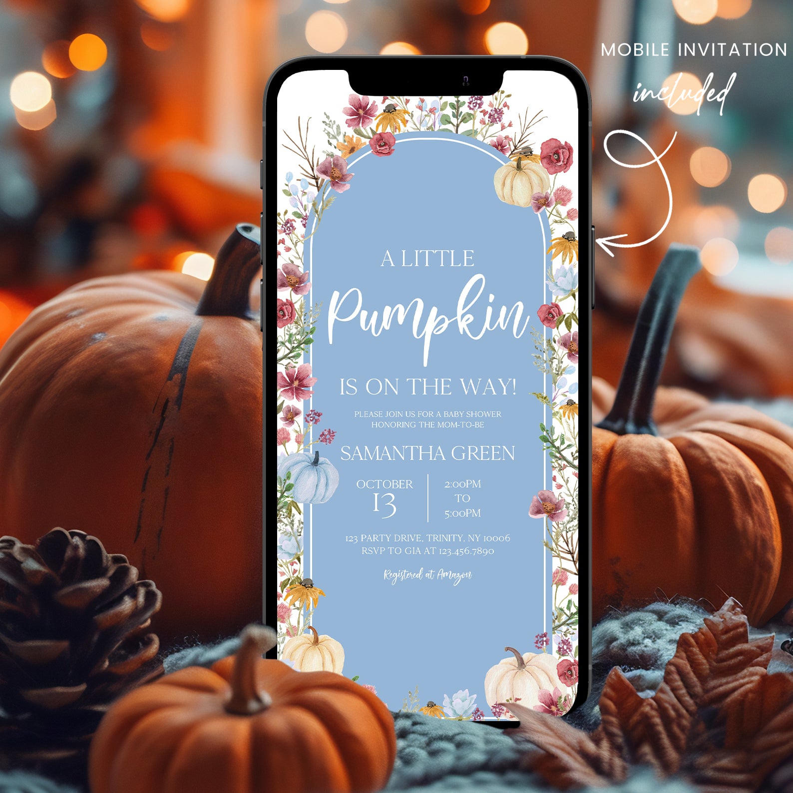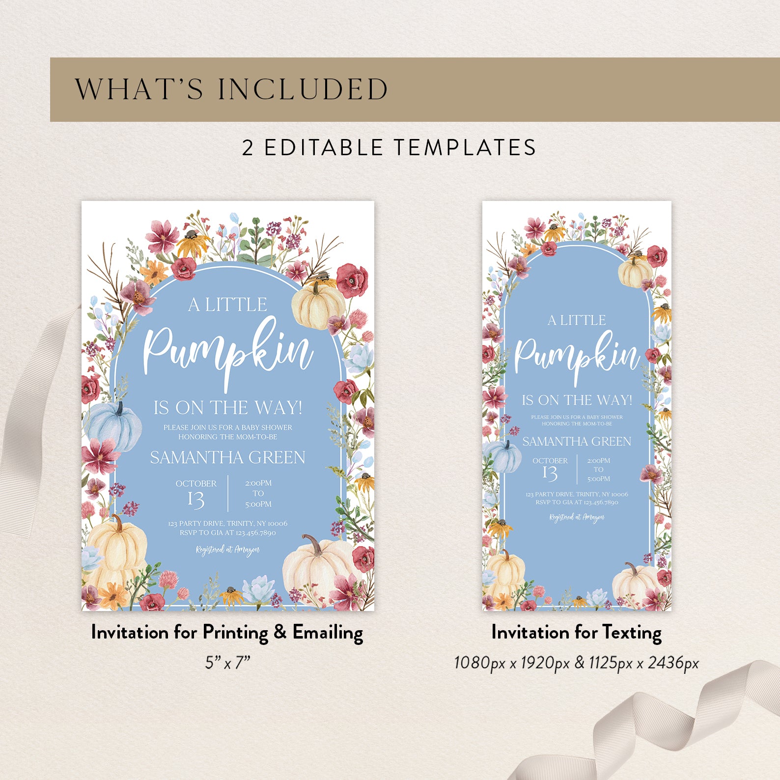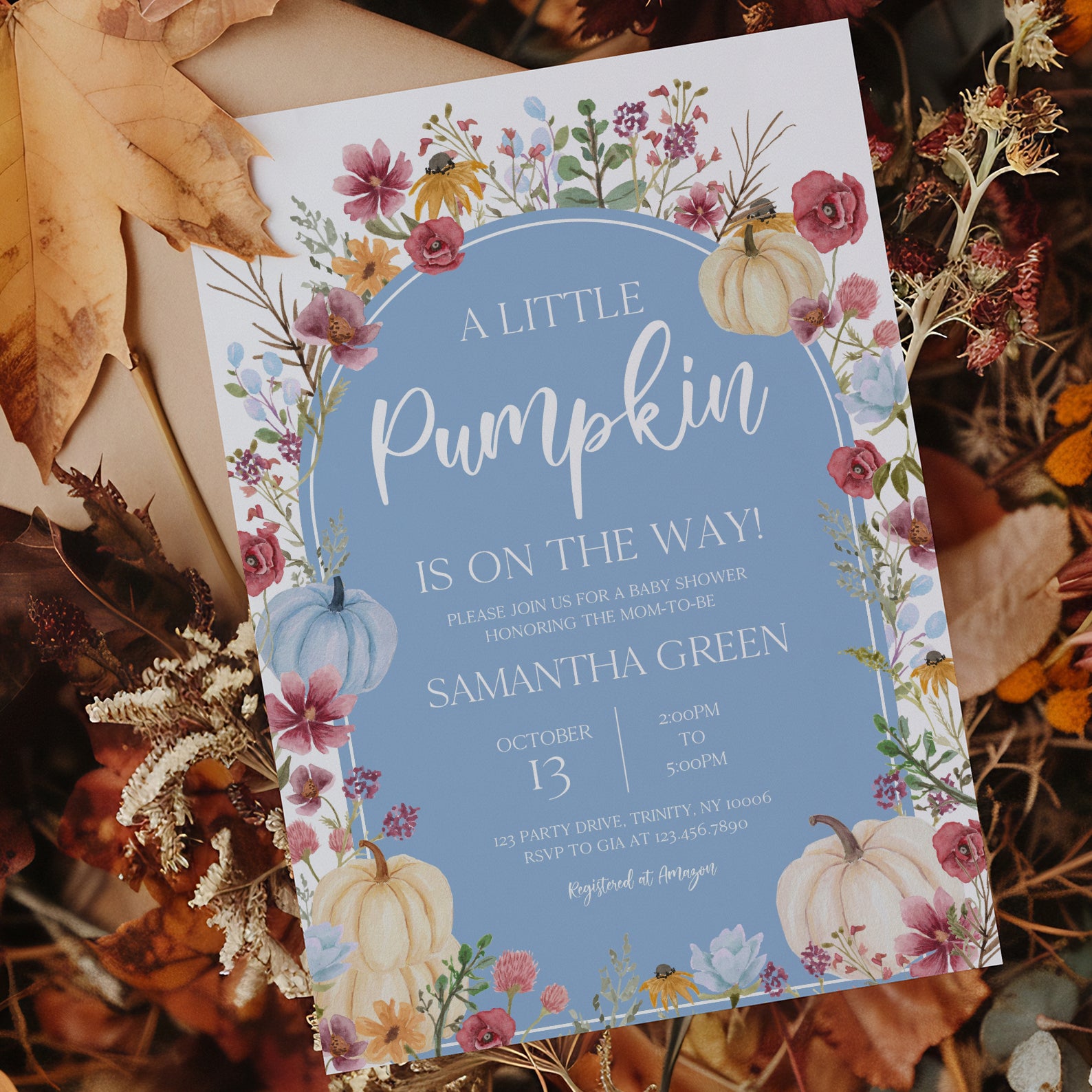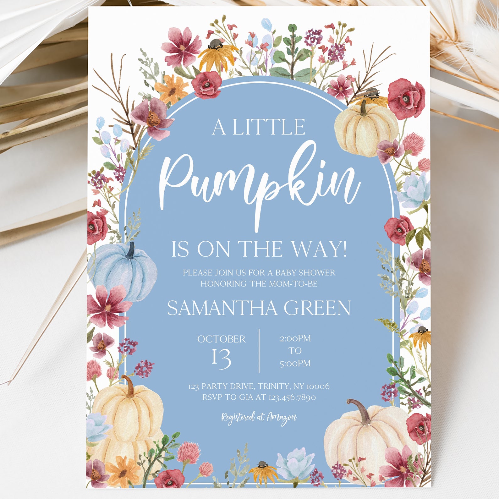 - Purchase this Fall Baby Shower Blue Invite: Pumpkin & Wildflowers Arch template