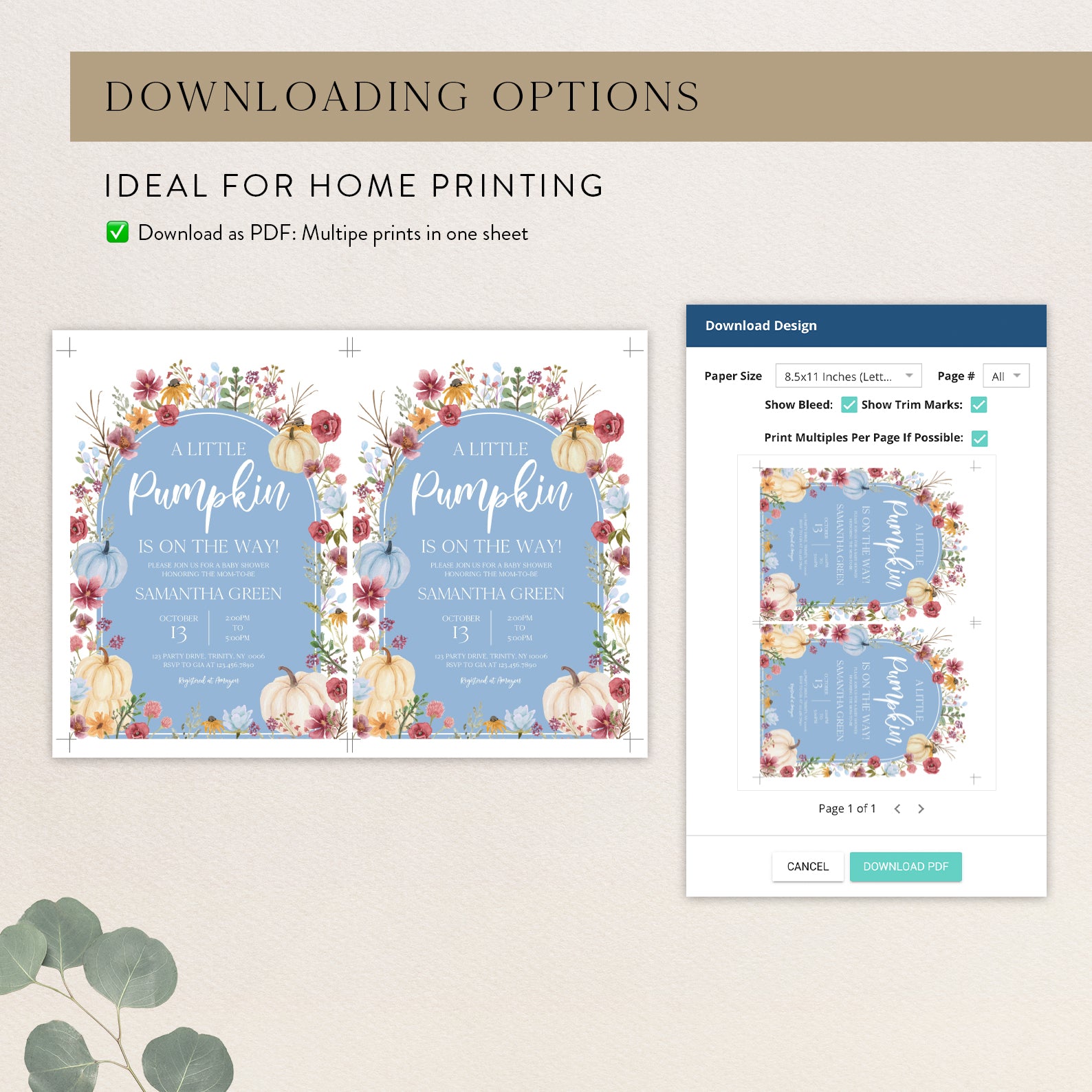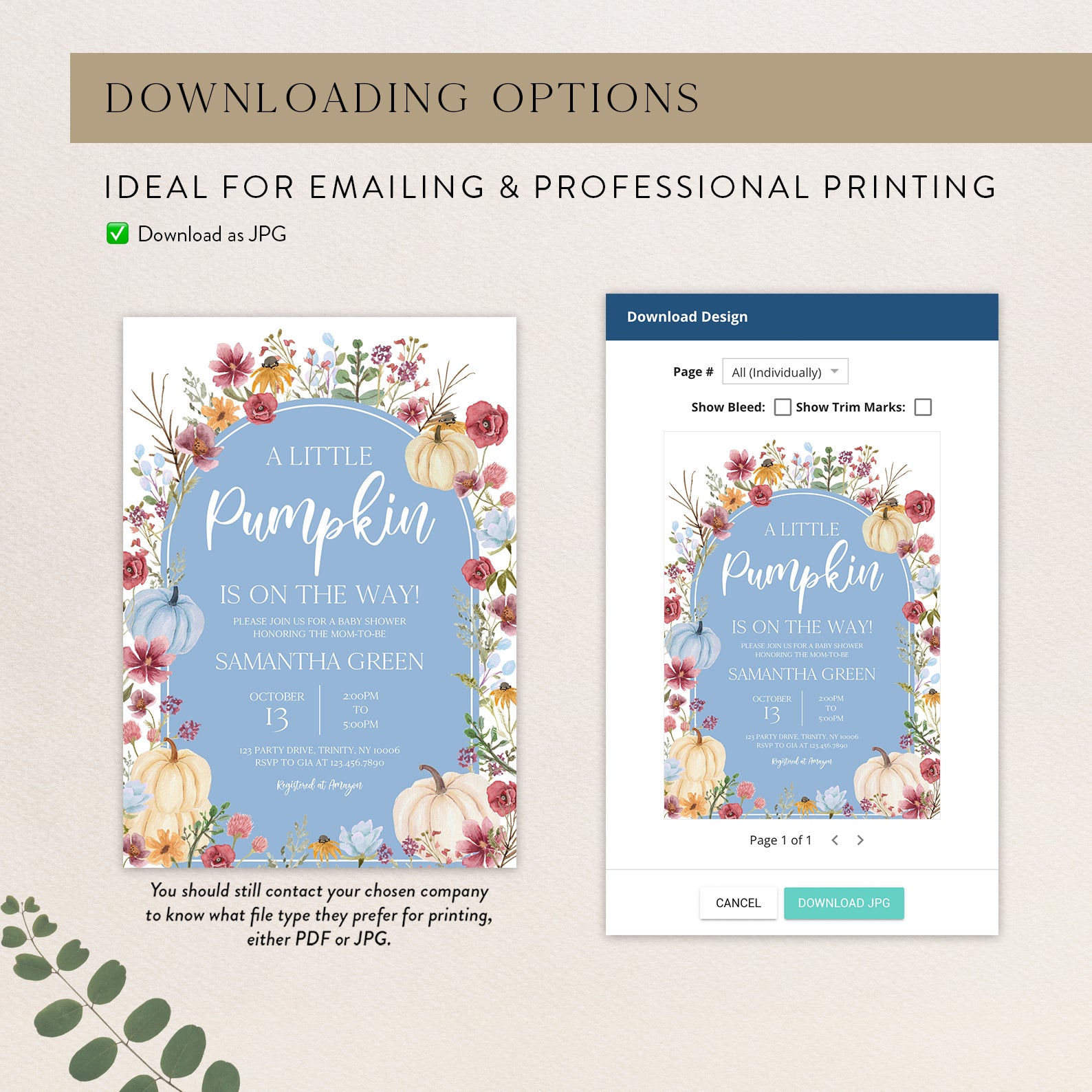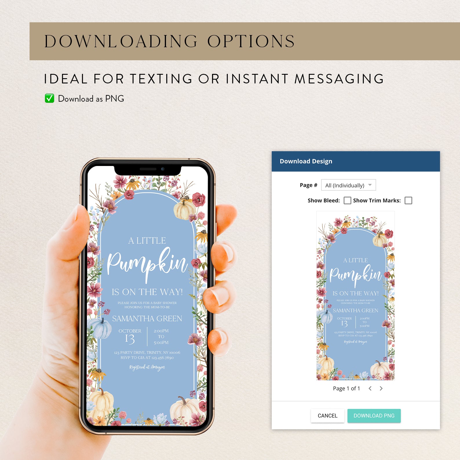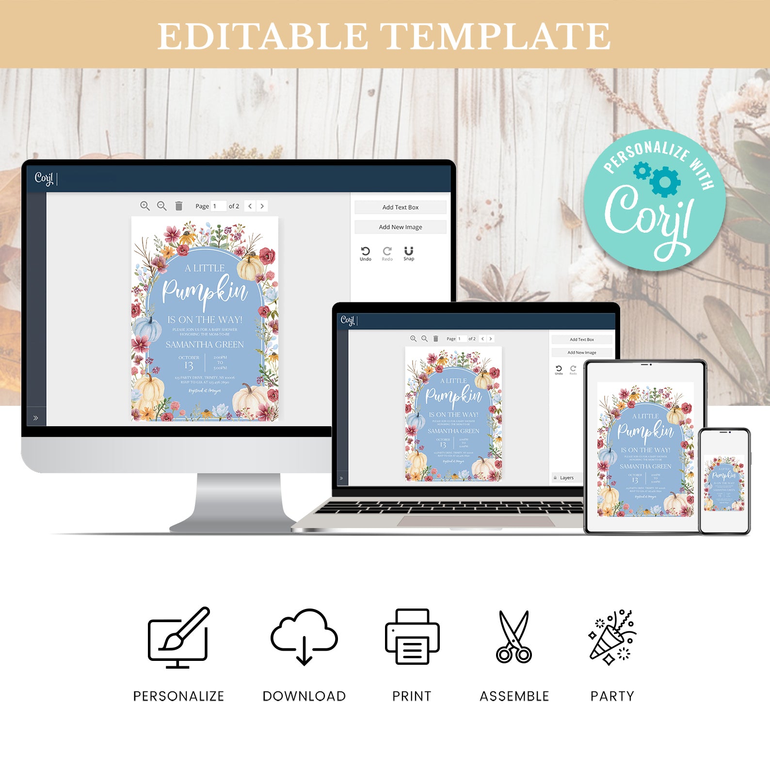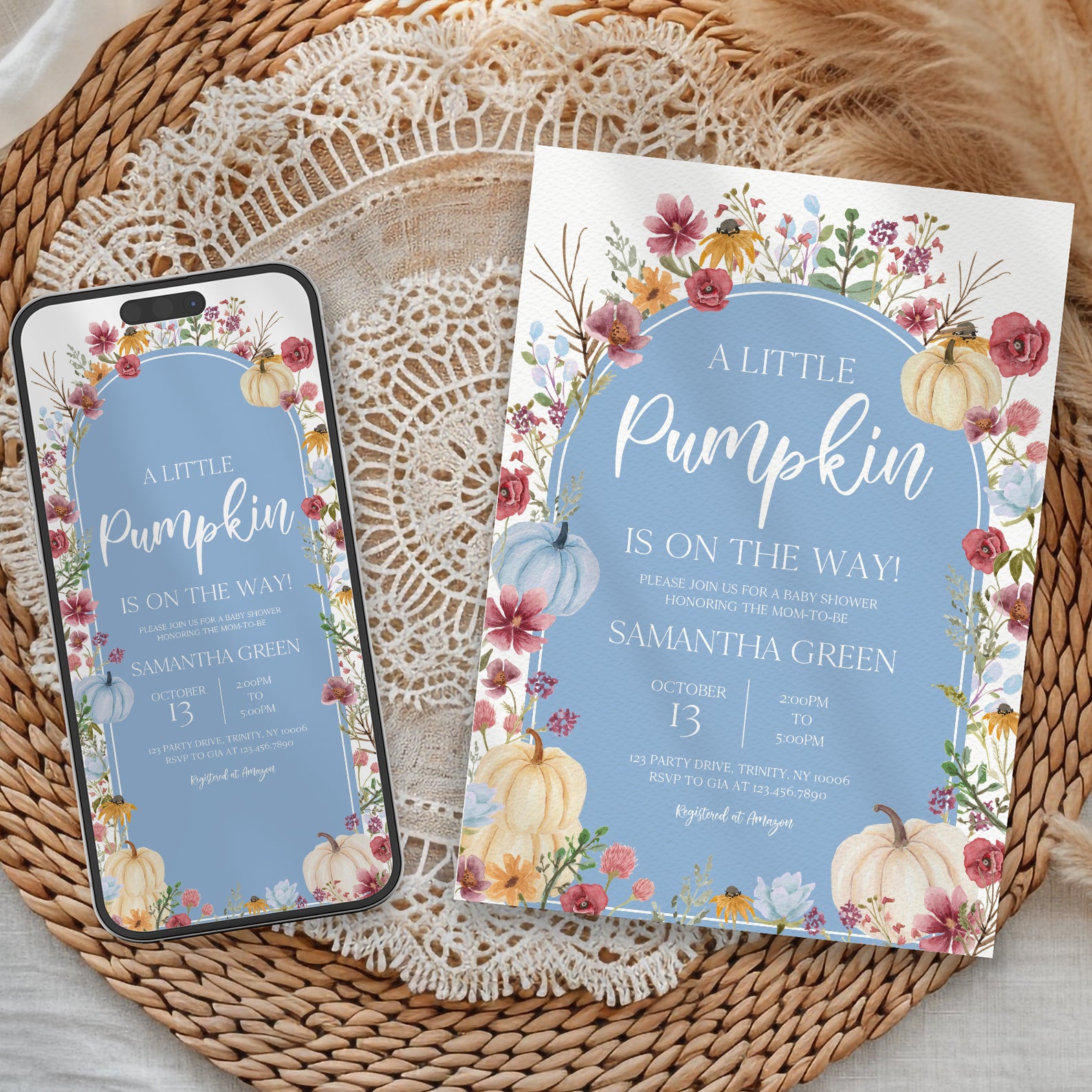 - Purchase this Fall Baby Shower Blue Invite: Pumpkin & Wildflowers Arch template