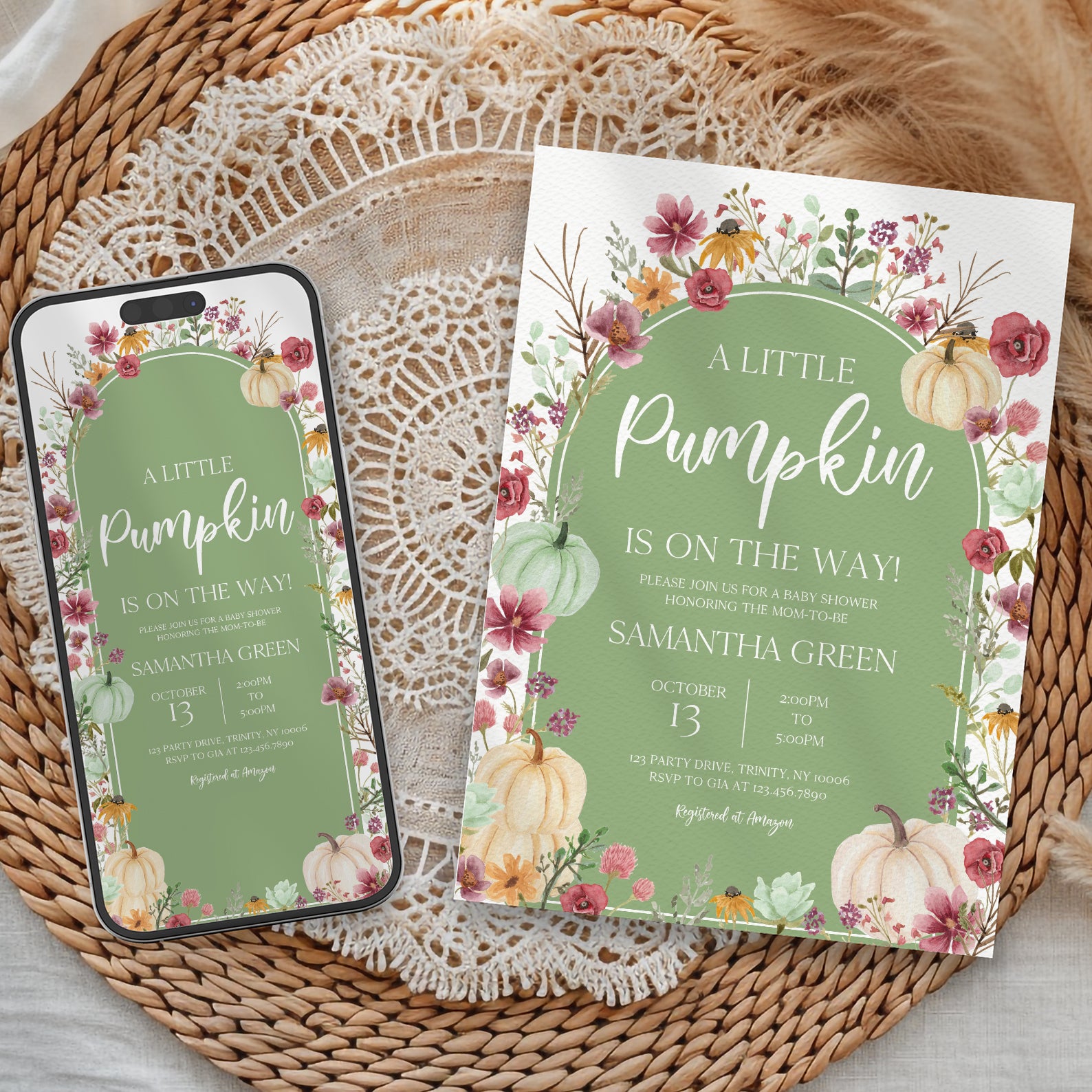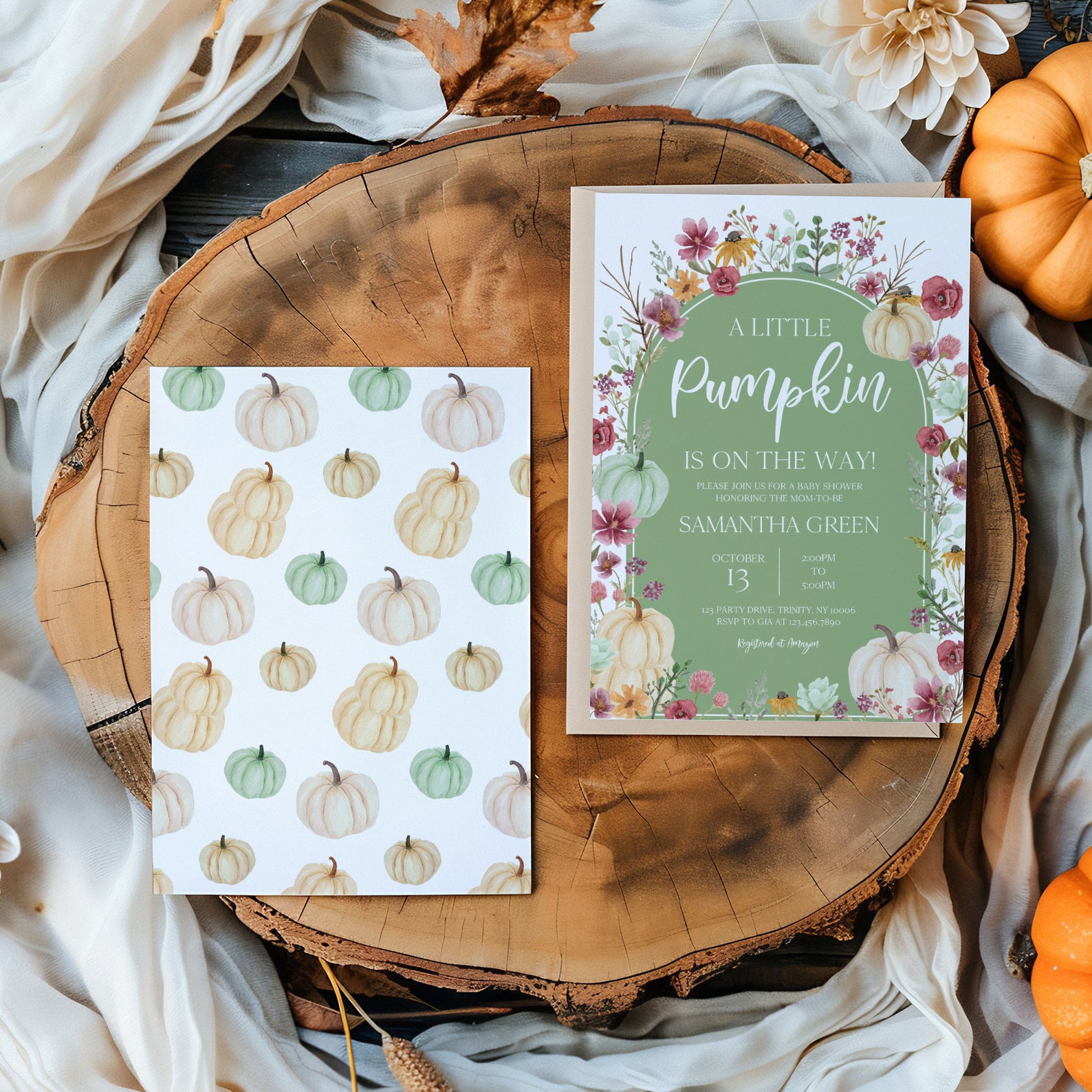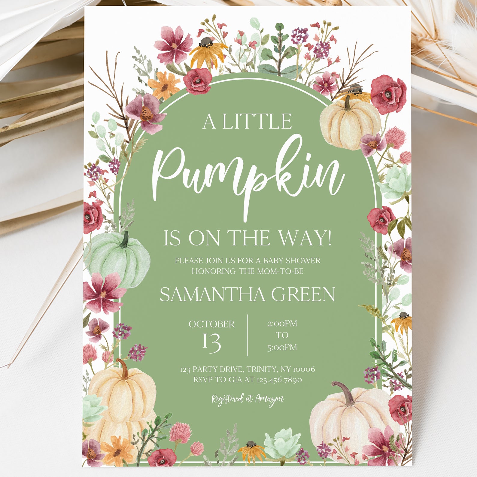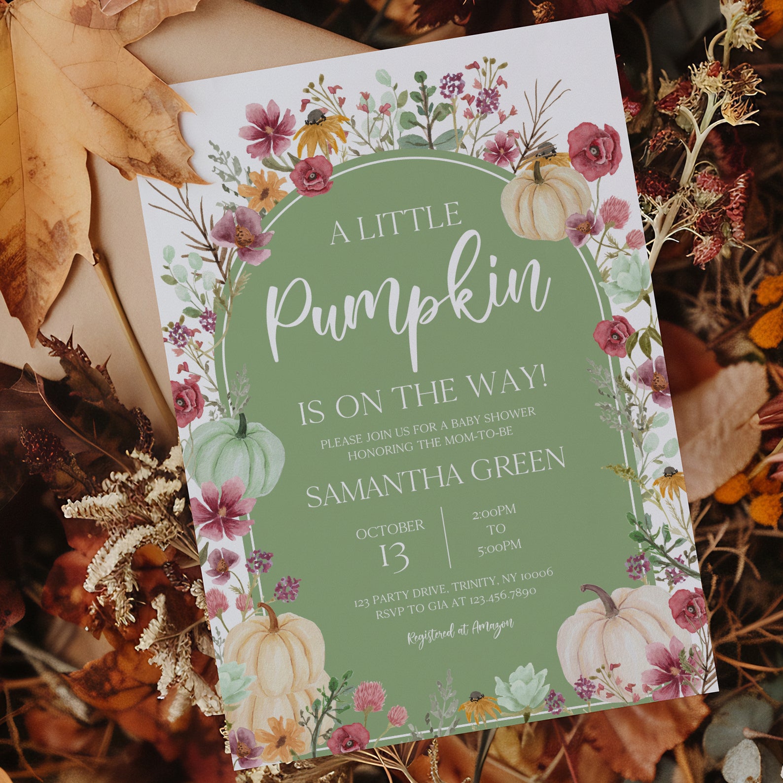 - Purchase this Fall Baby Shower Green Invite: Pumpkin & Wildflowers Arch template