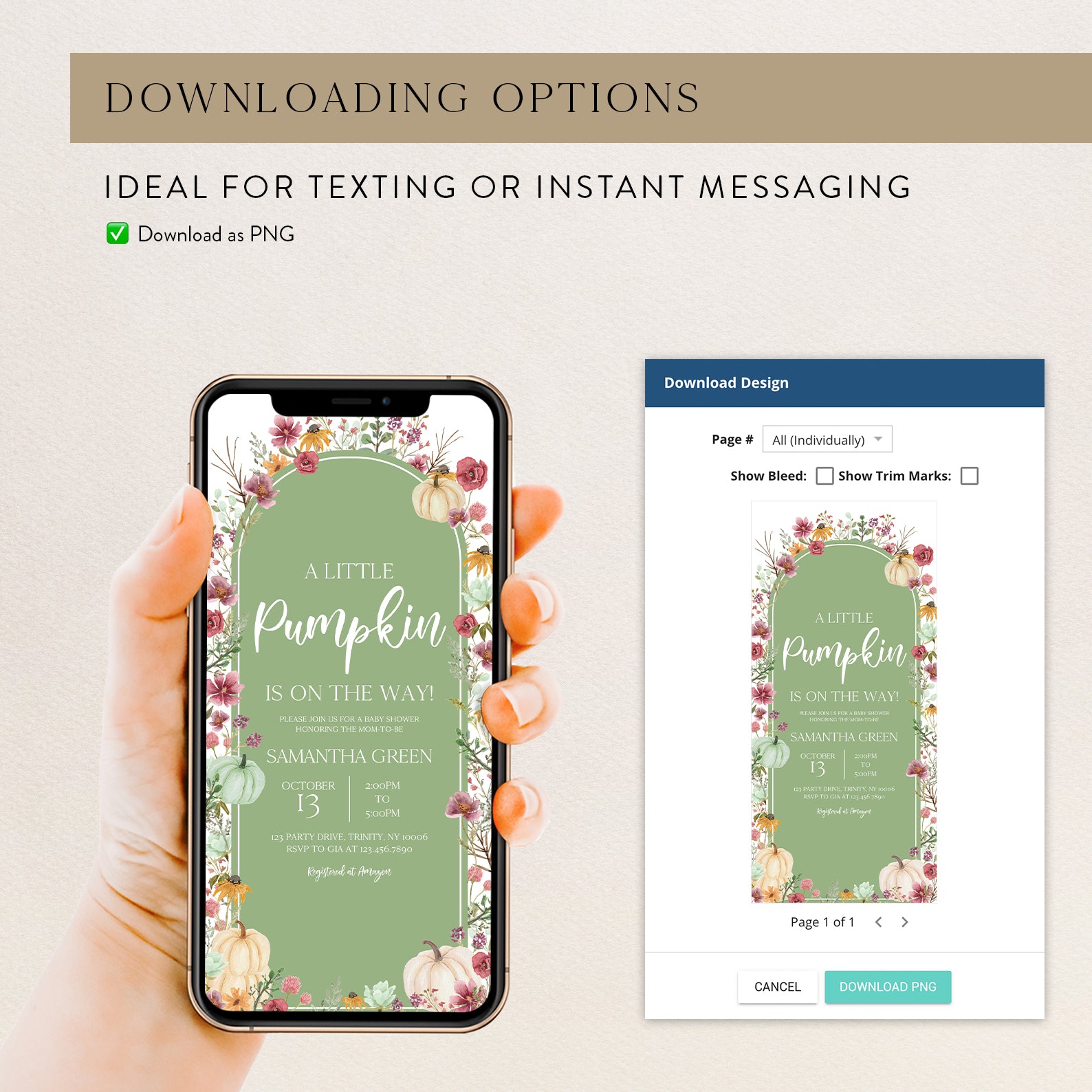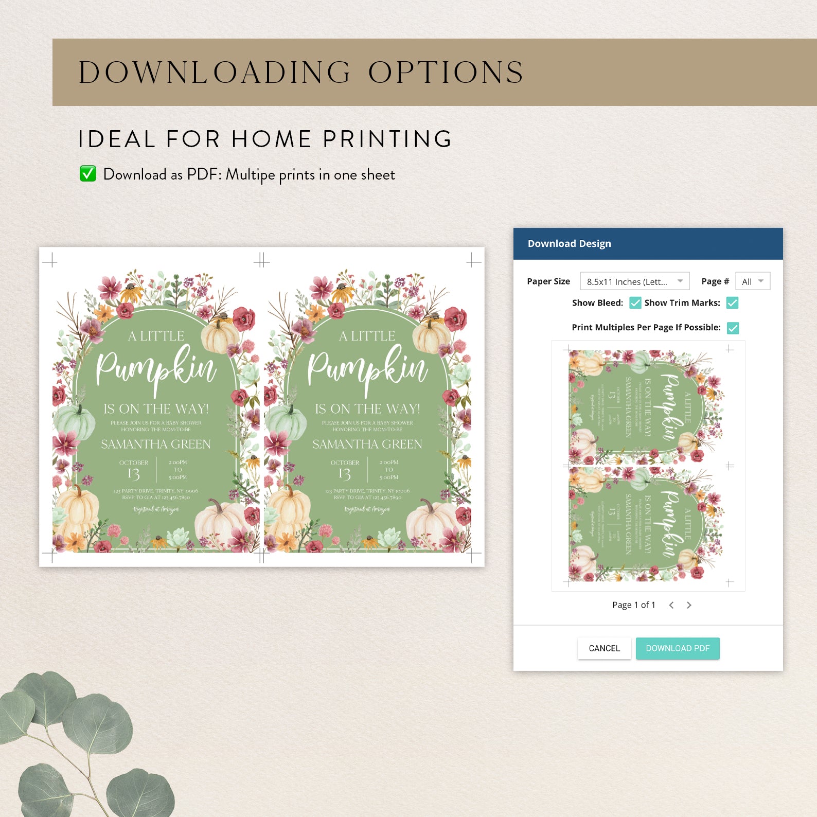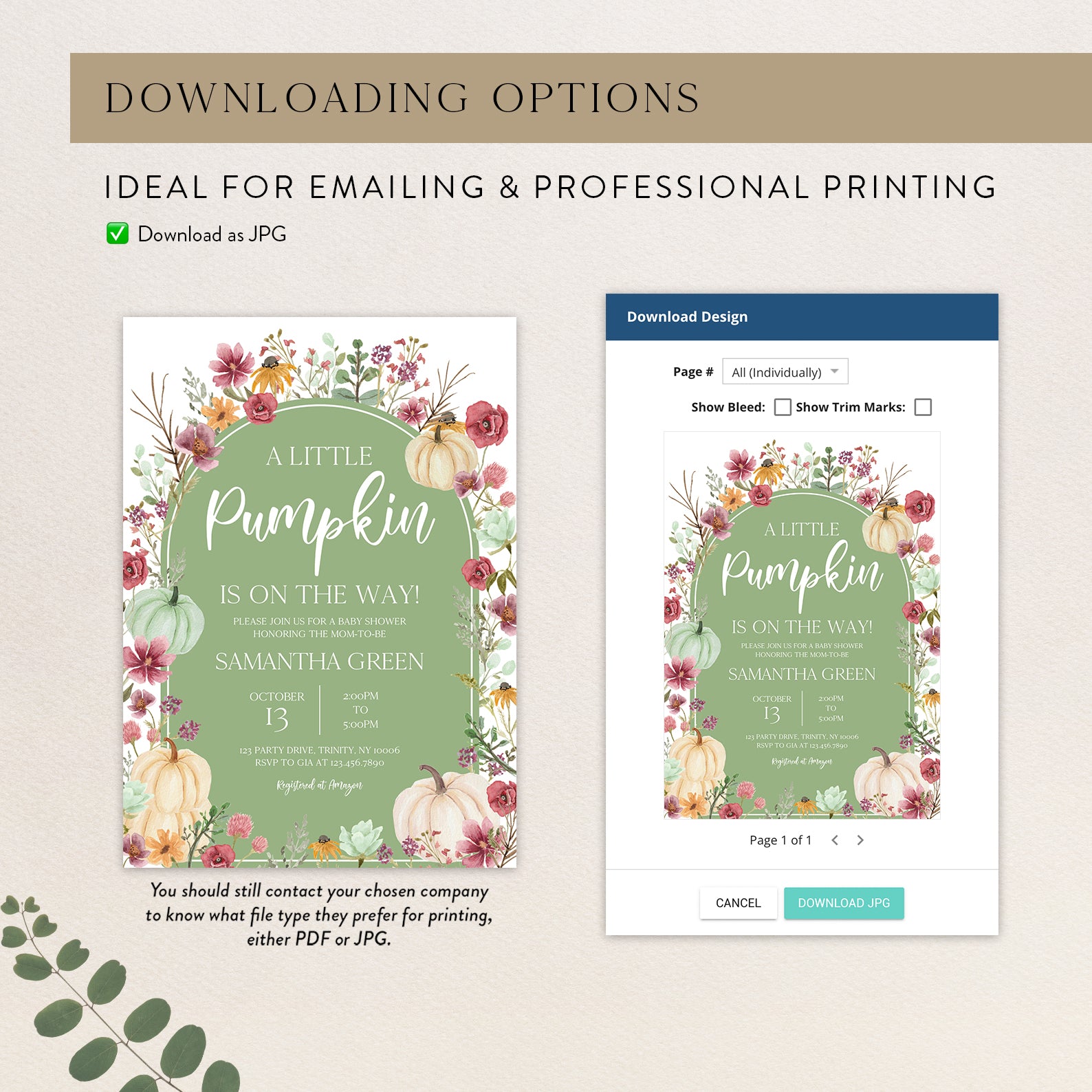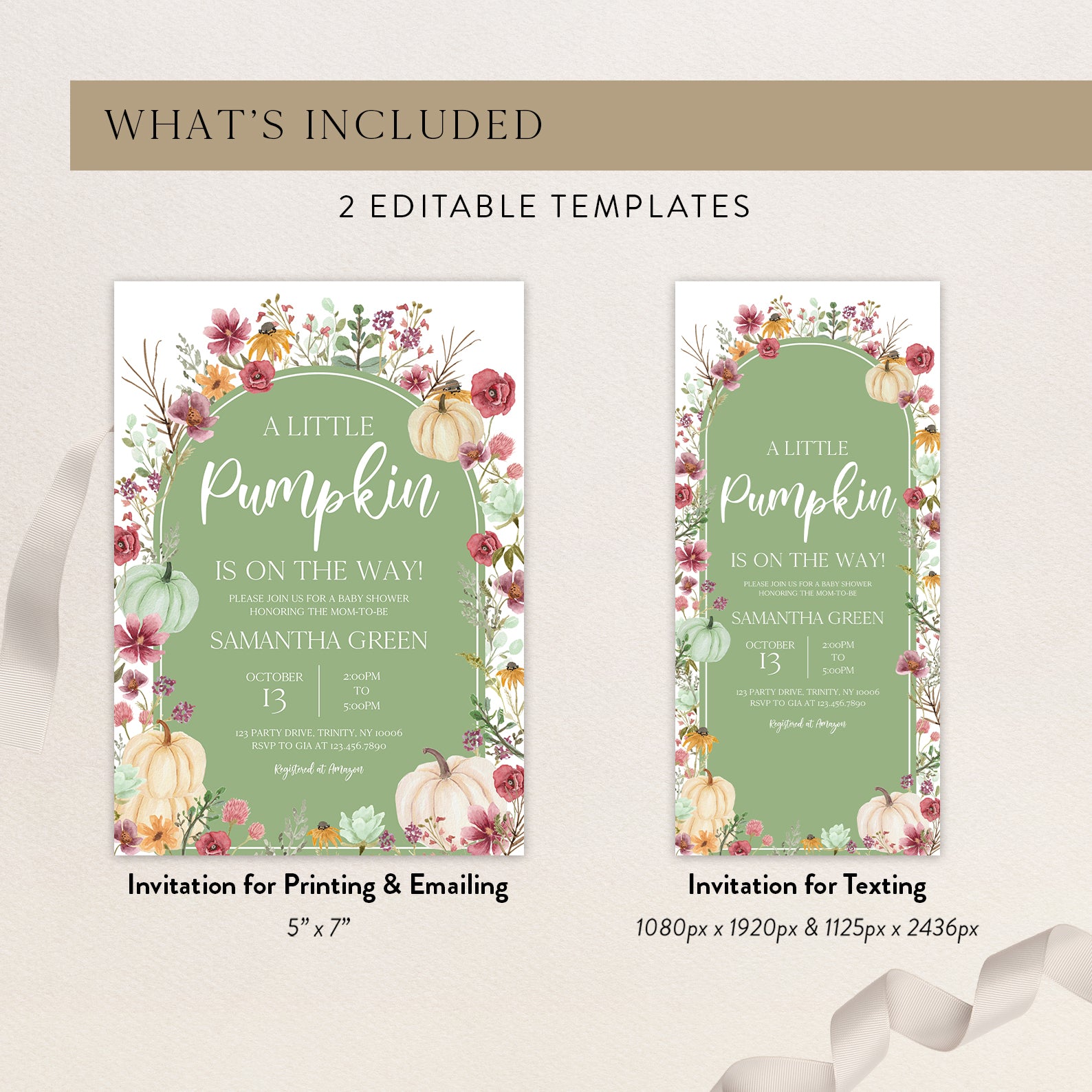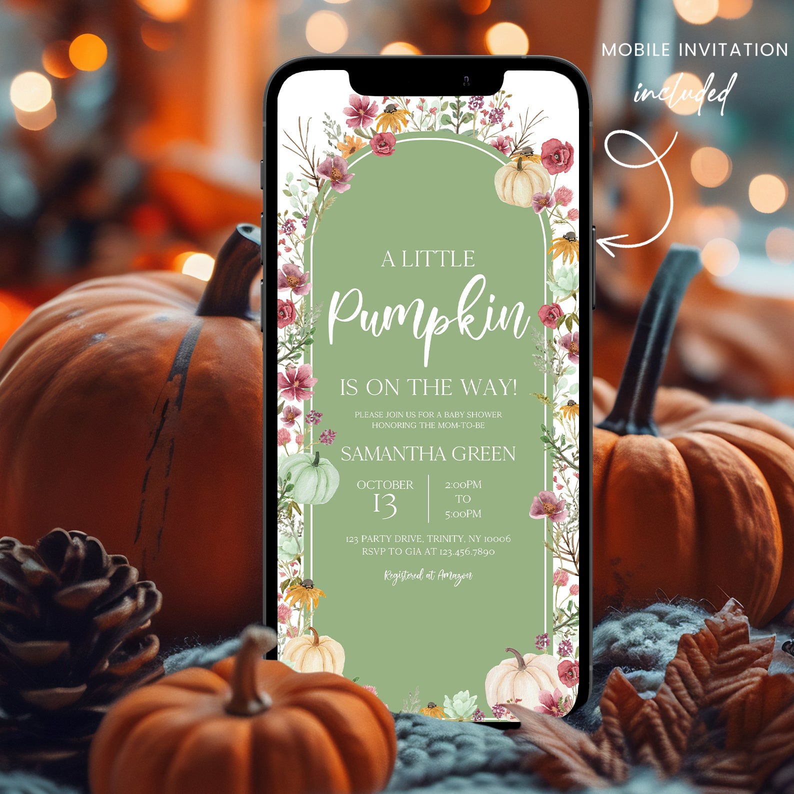 - Purchase this Fall Baby Shower Green Invite: Pumpkin & Wildflowers Arch template