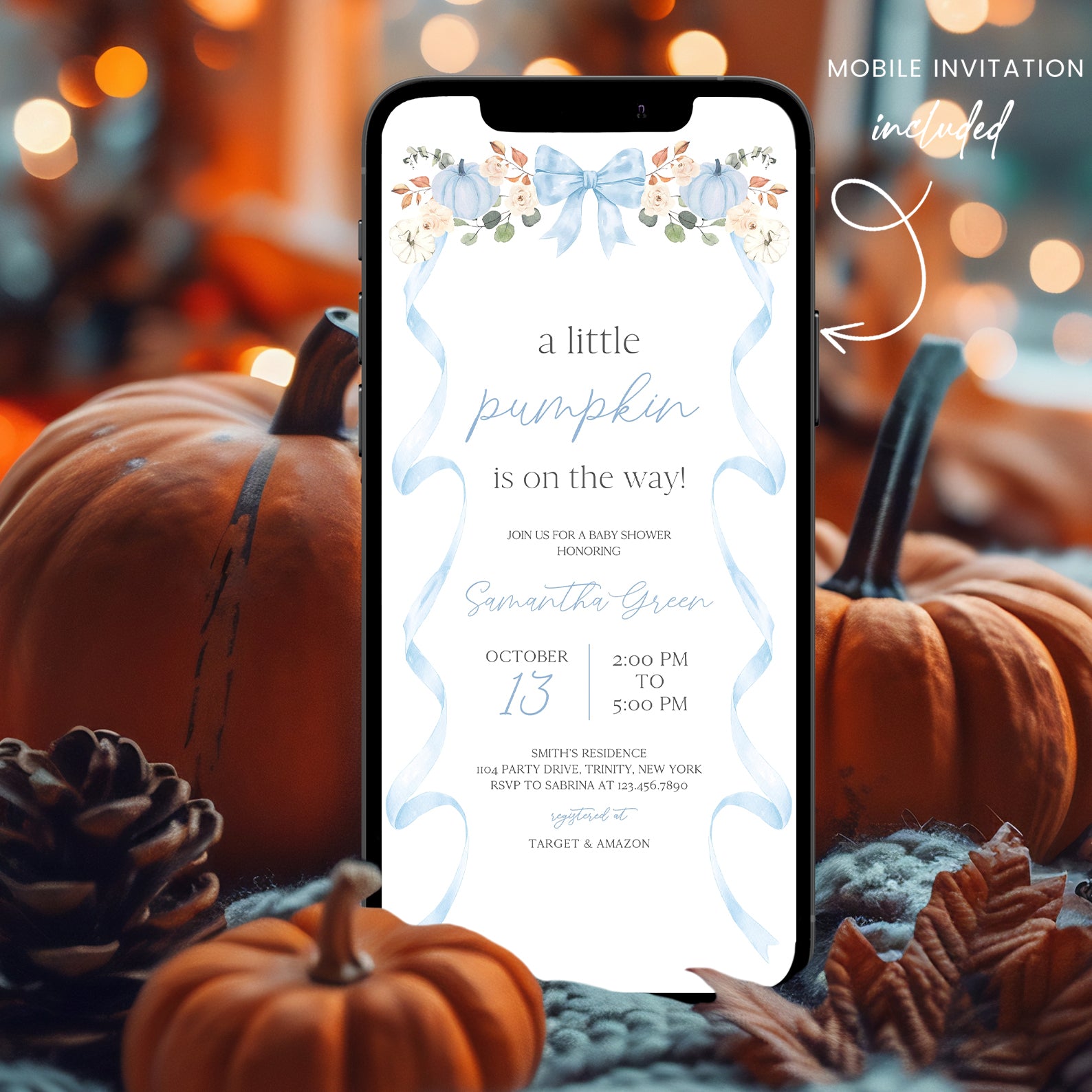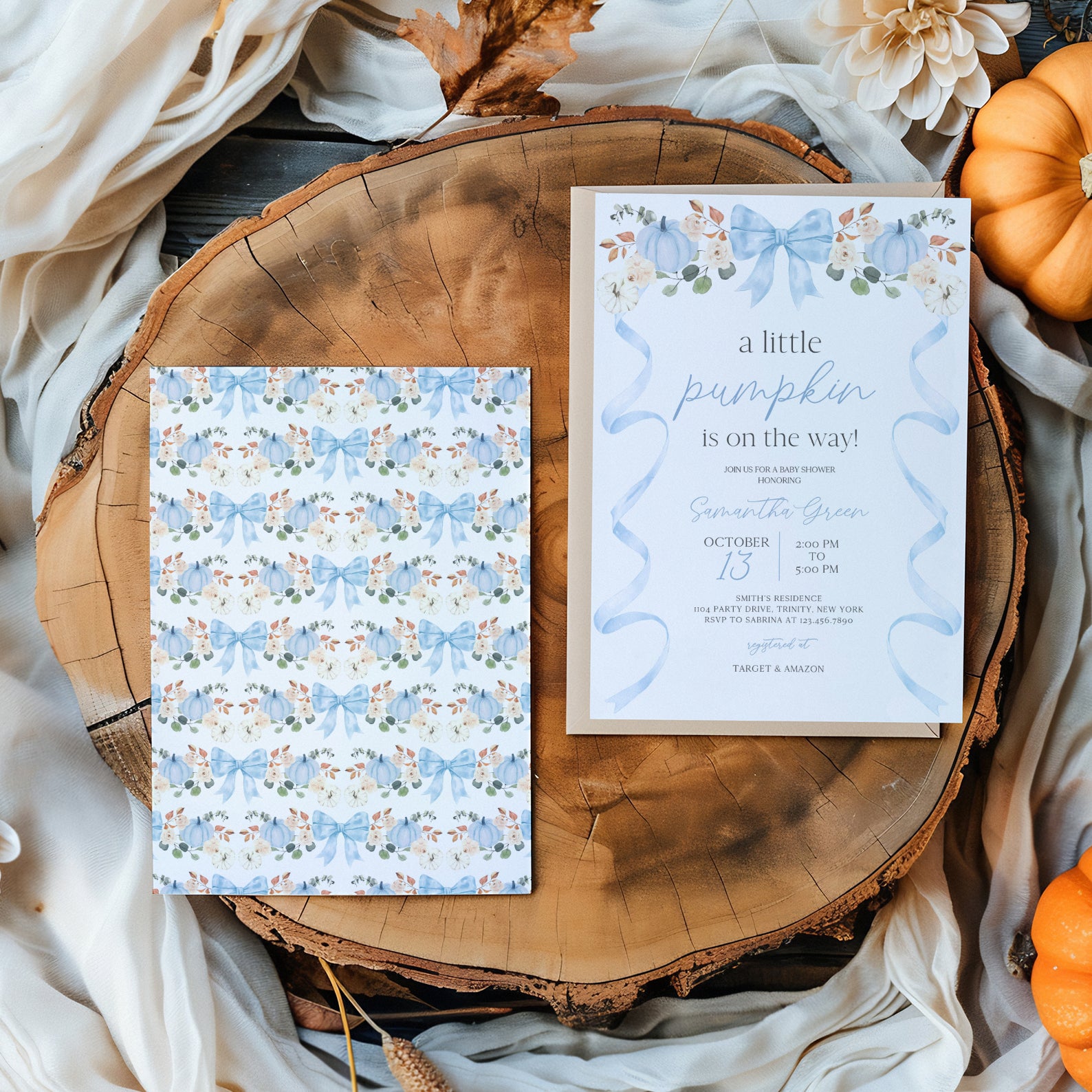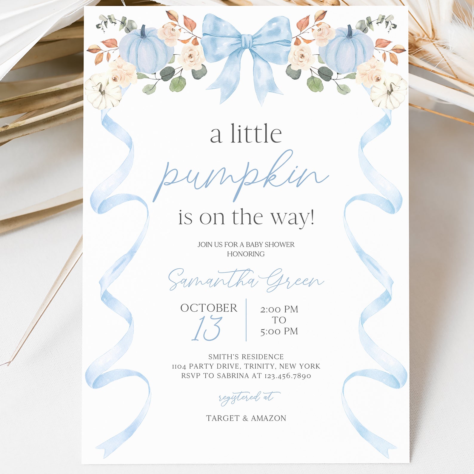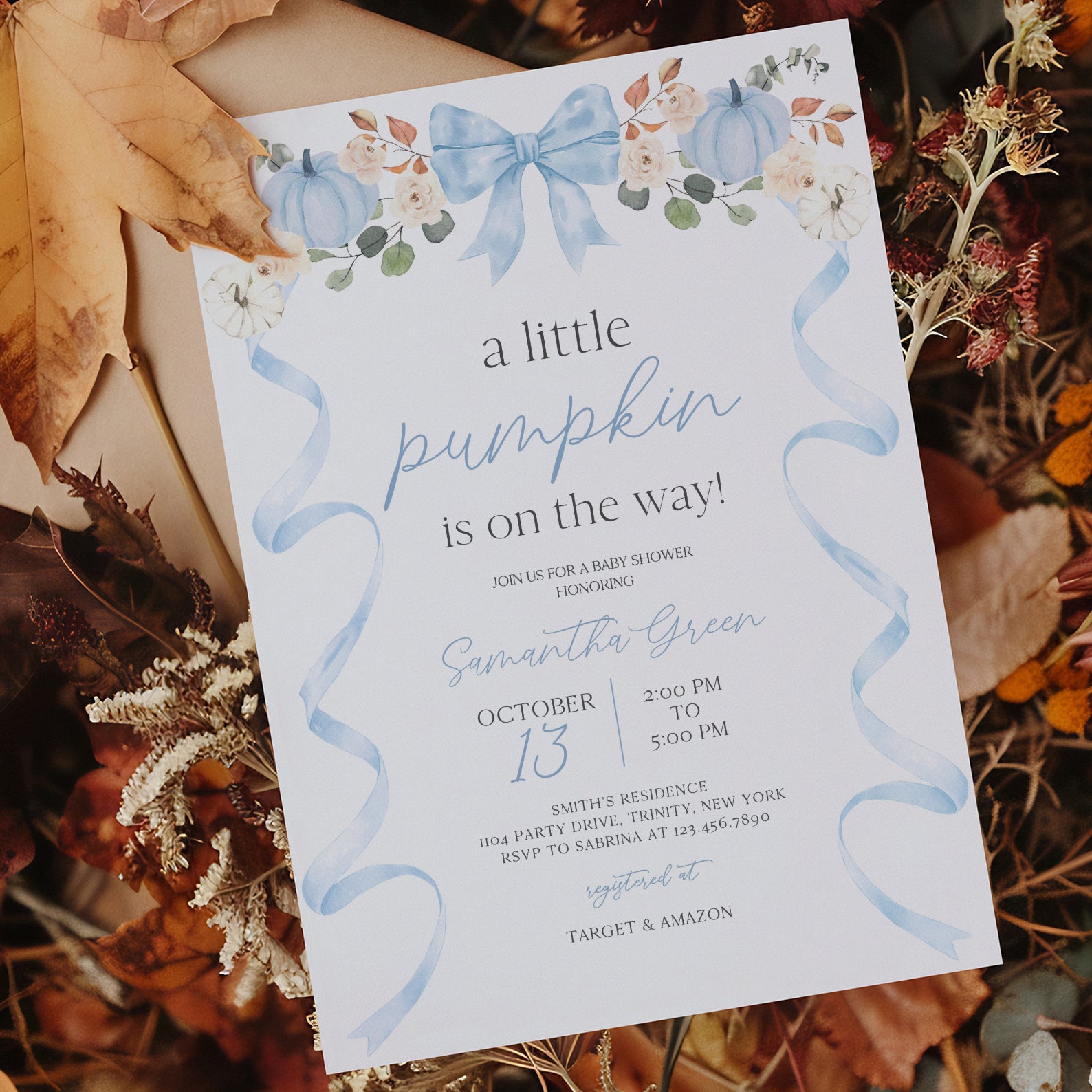 - Purchase this Fall Baby Shower Invite: Blue Ribbon Frame with Pumpkin & Florals template