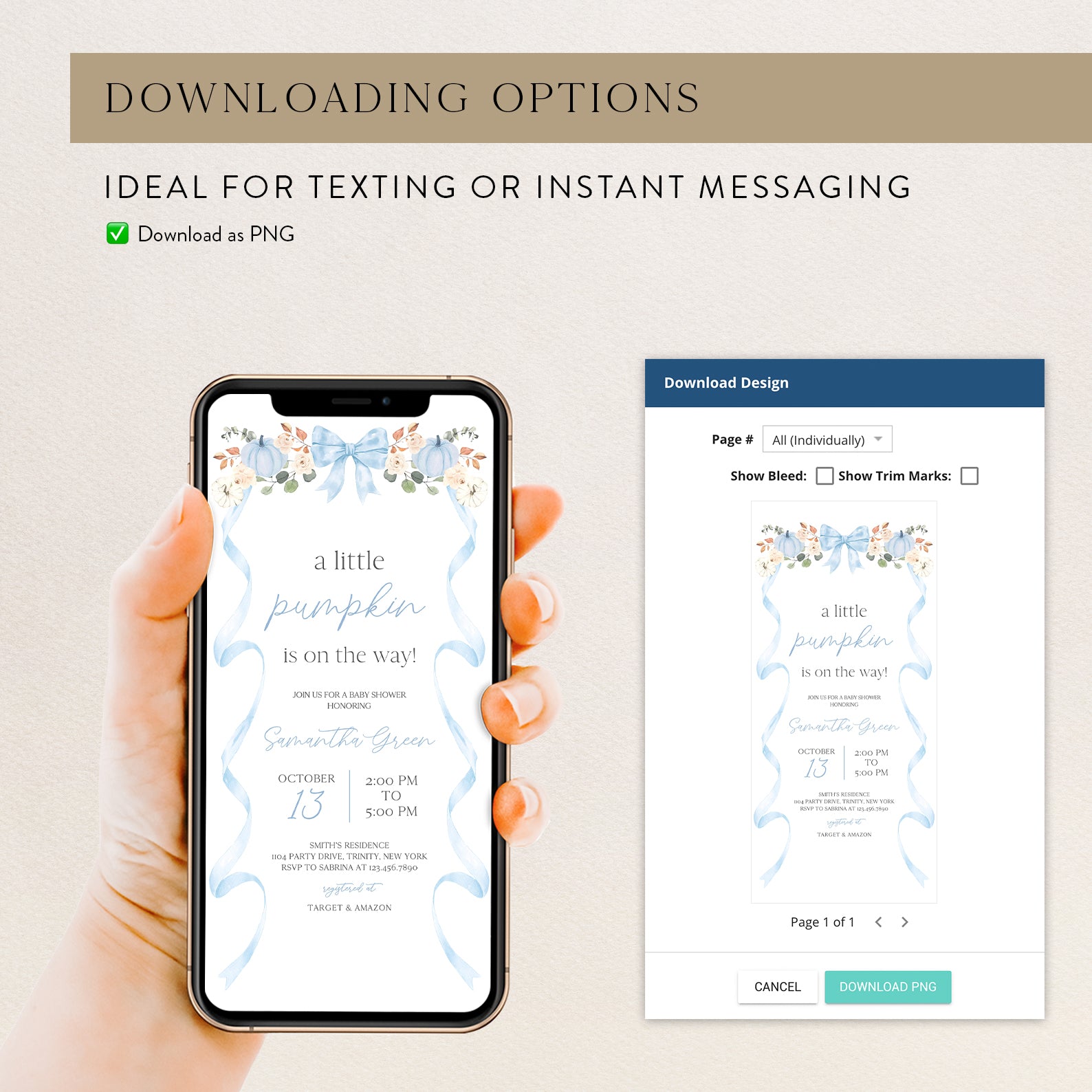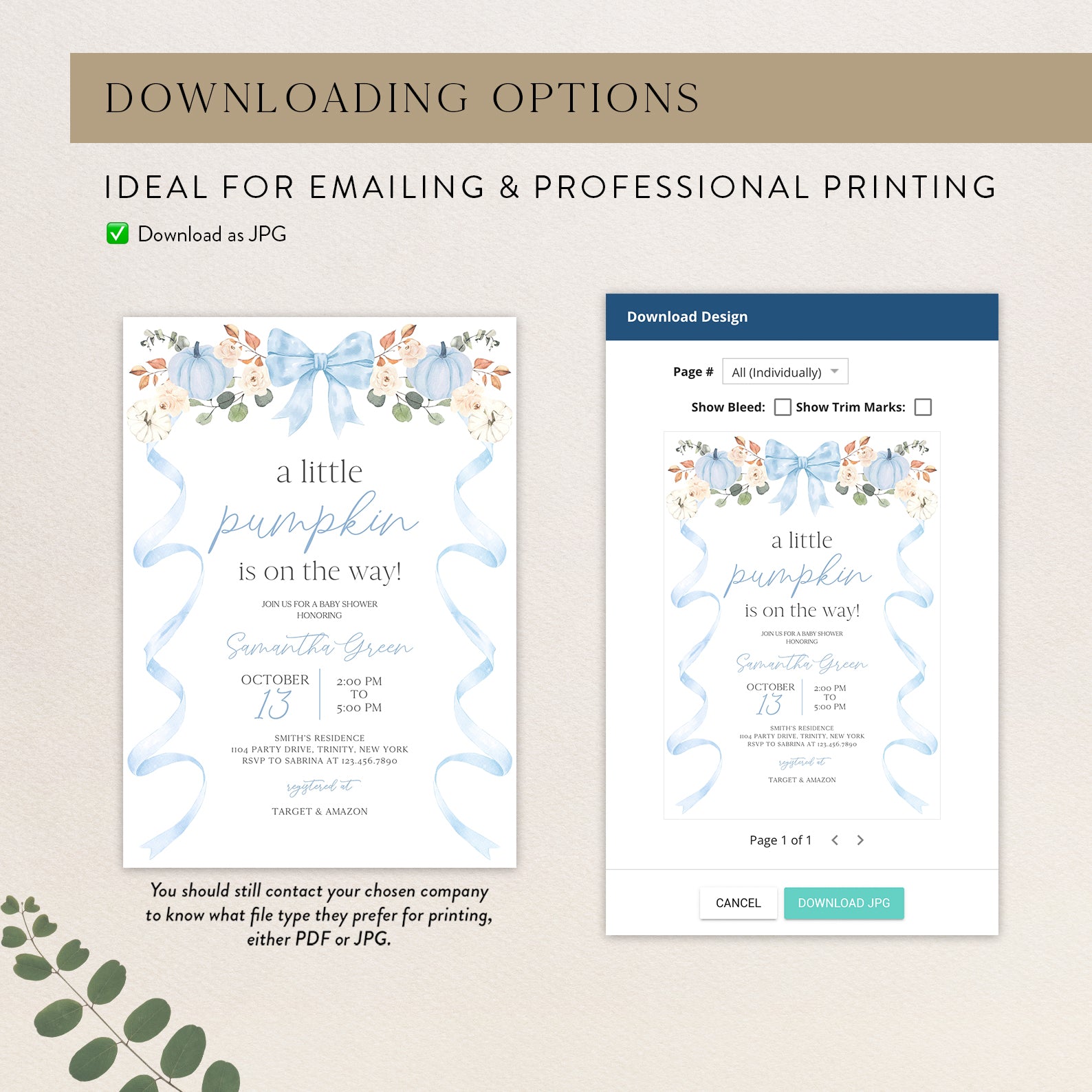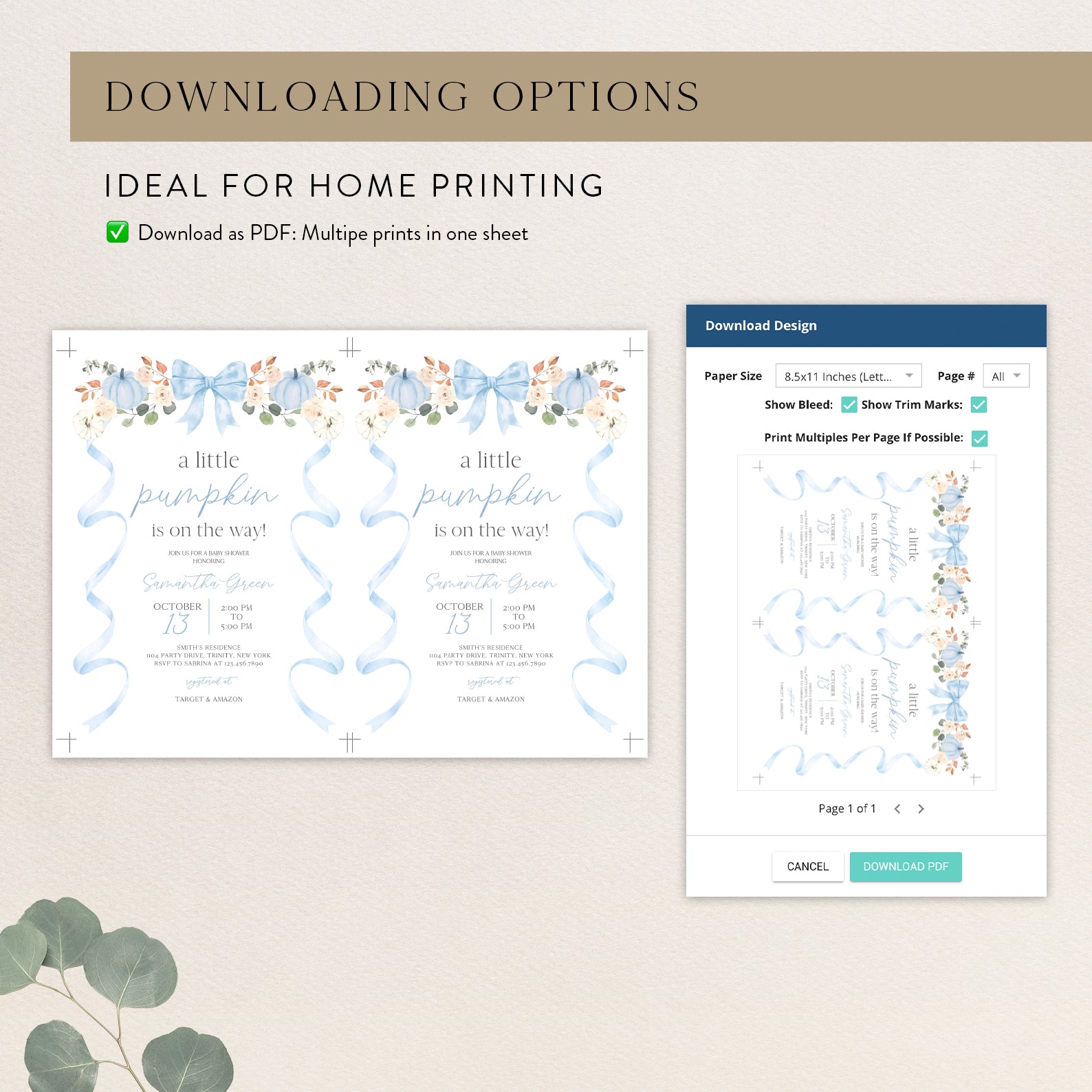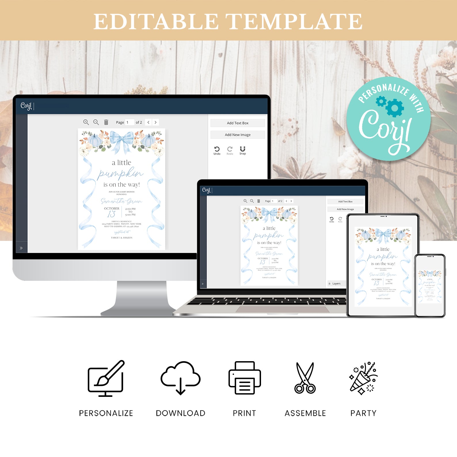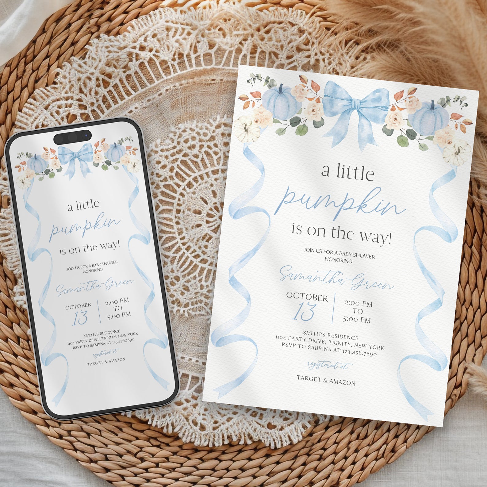 - Purchase this Fall Baby Shower Invite: Blue Ribbon Frame with Pumpkin & Florals template