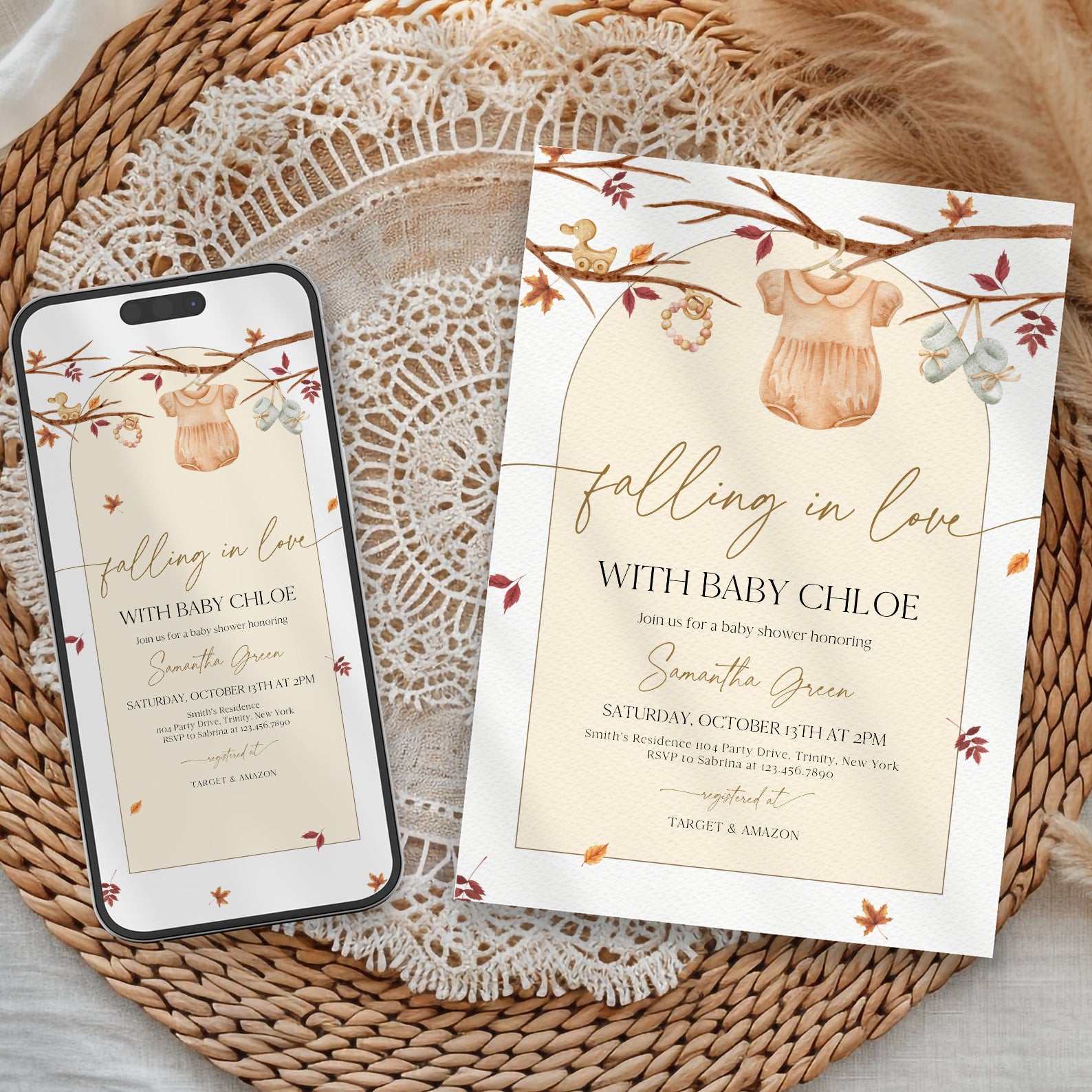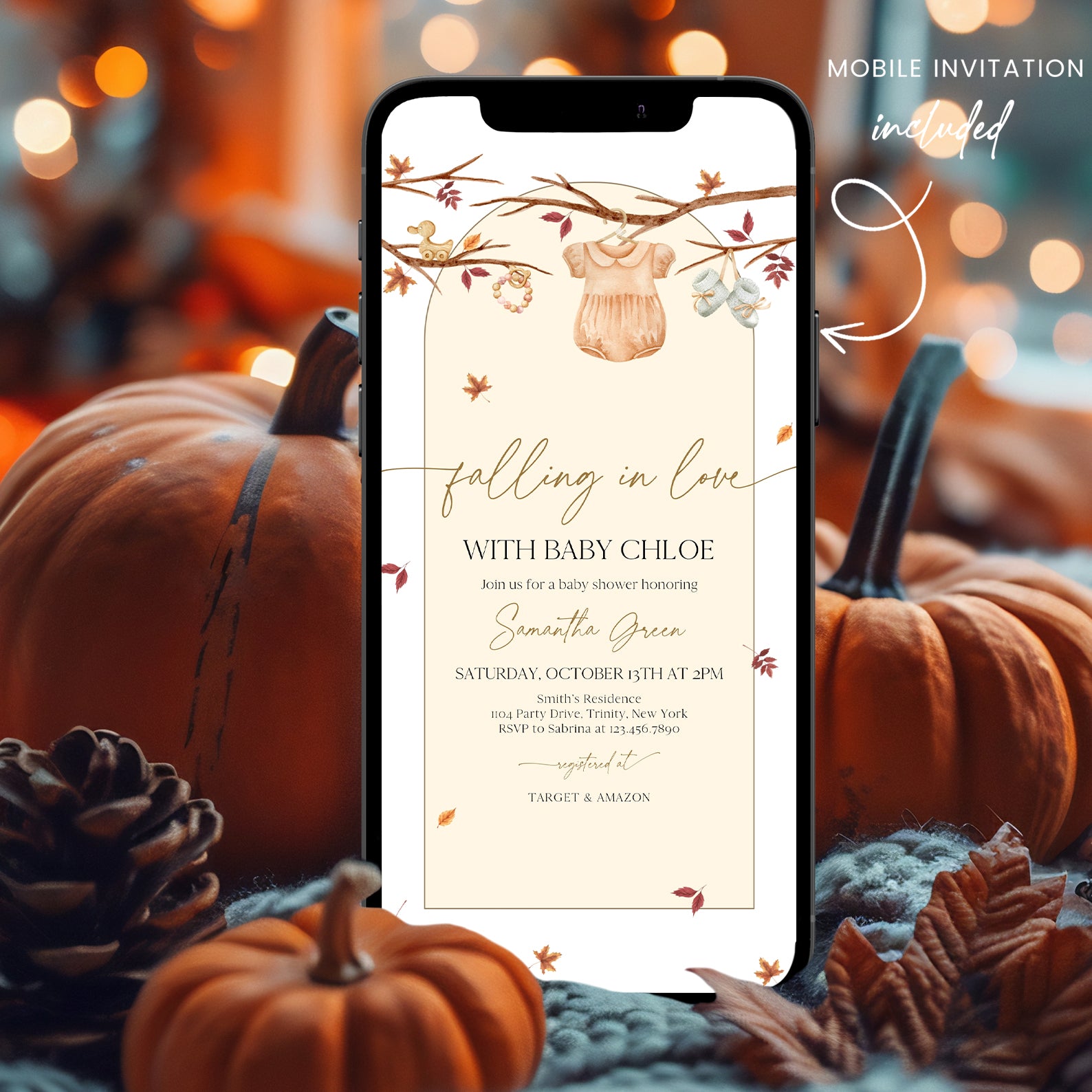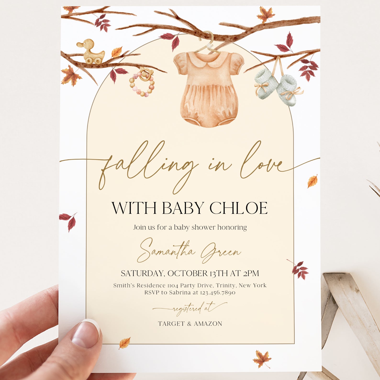 Celebrate the arrival of your little one with our charming Fall Baby Shower Digital Invitation! Featuring a delightful white background adorned with whimsical fall tree branches, this invitation showcases adorable elements like a hanging orange baby dress, playful baby teether beads, a wooden duck push toy, and sweet baby shoes tied with an orange ribbon, all surrounded by falling autumn leaves. The centerpiece is a soft, pastel orange arch that beautifully frames your event details, making it the perfect way to invite friends and family to share in your joy. Embrace the warmth of the season and set the tone for a memorable celebration with this enchanting design!