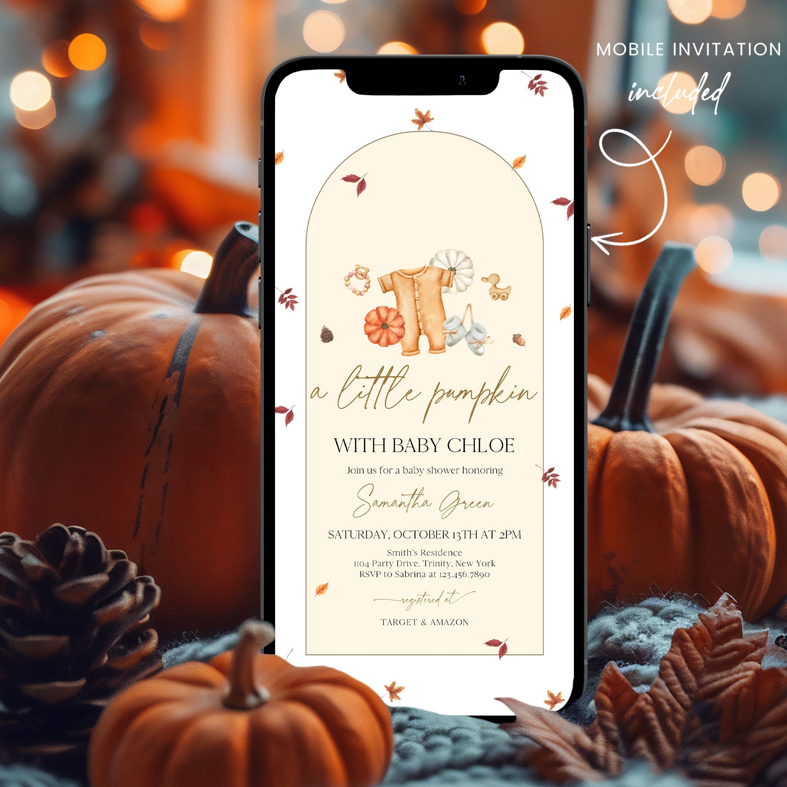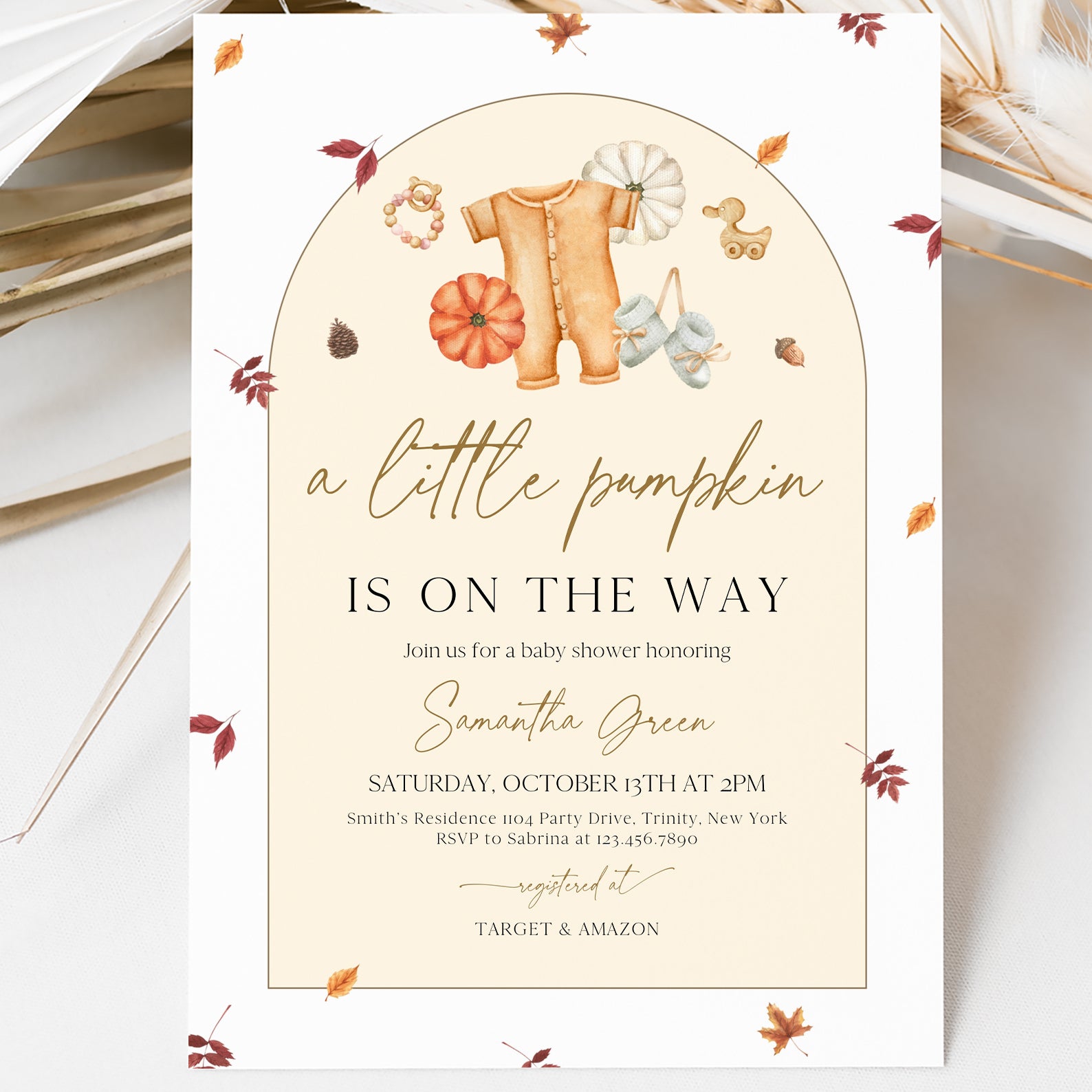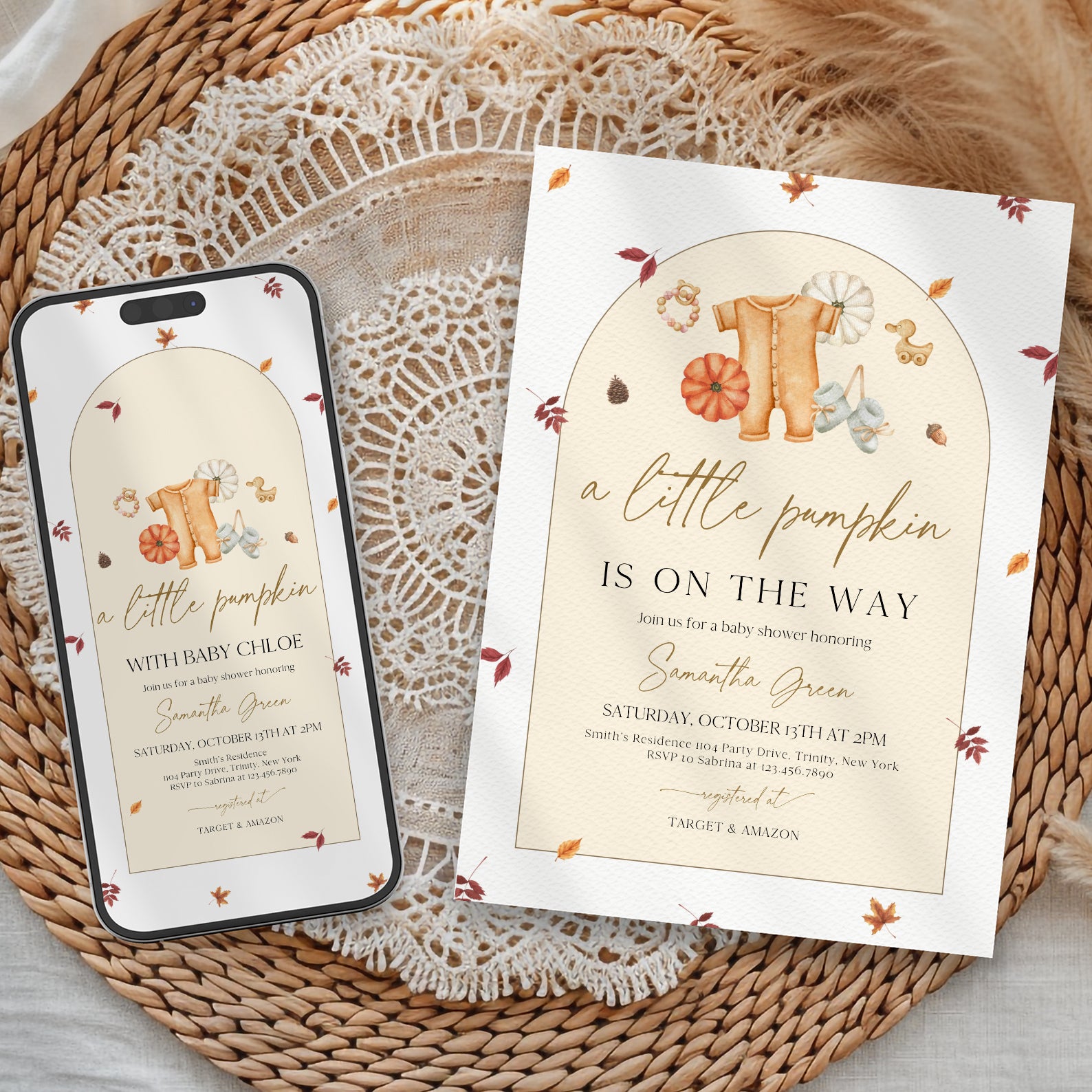 Celebrate the upcoming arrival of your little one with our charming Fall Baby Shower Digital Invitation, "A Little Pumpkin is on the Way." This delightful design features a crisp white background adorned with falling leaves and a soft pastel orange arch that beautifully frames your event details. Accented with adorable illustrations of an orange baby suit, cute baby shoes tied with an orange ribbon, playful teether beads, a whimsical wood duck push toy, and a cheerful orange and white pumpkin, this invitation sets the perfect tone for your autumn celebration. Easy to customize and send, it’s the ideal way to gather friends and family for a memorable occasion!