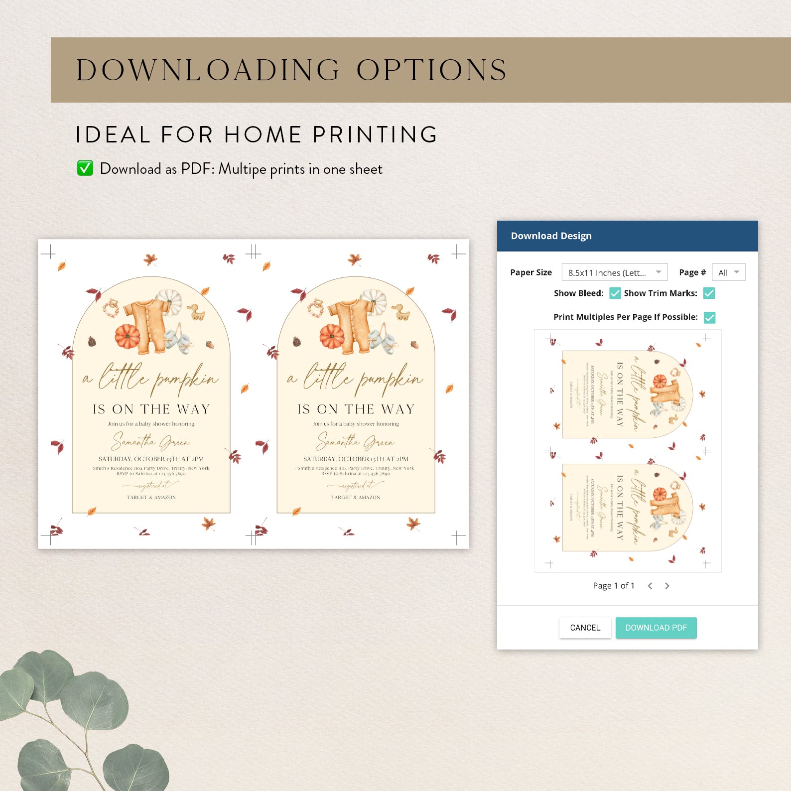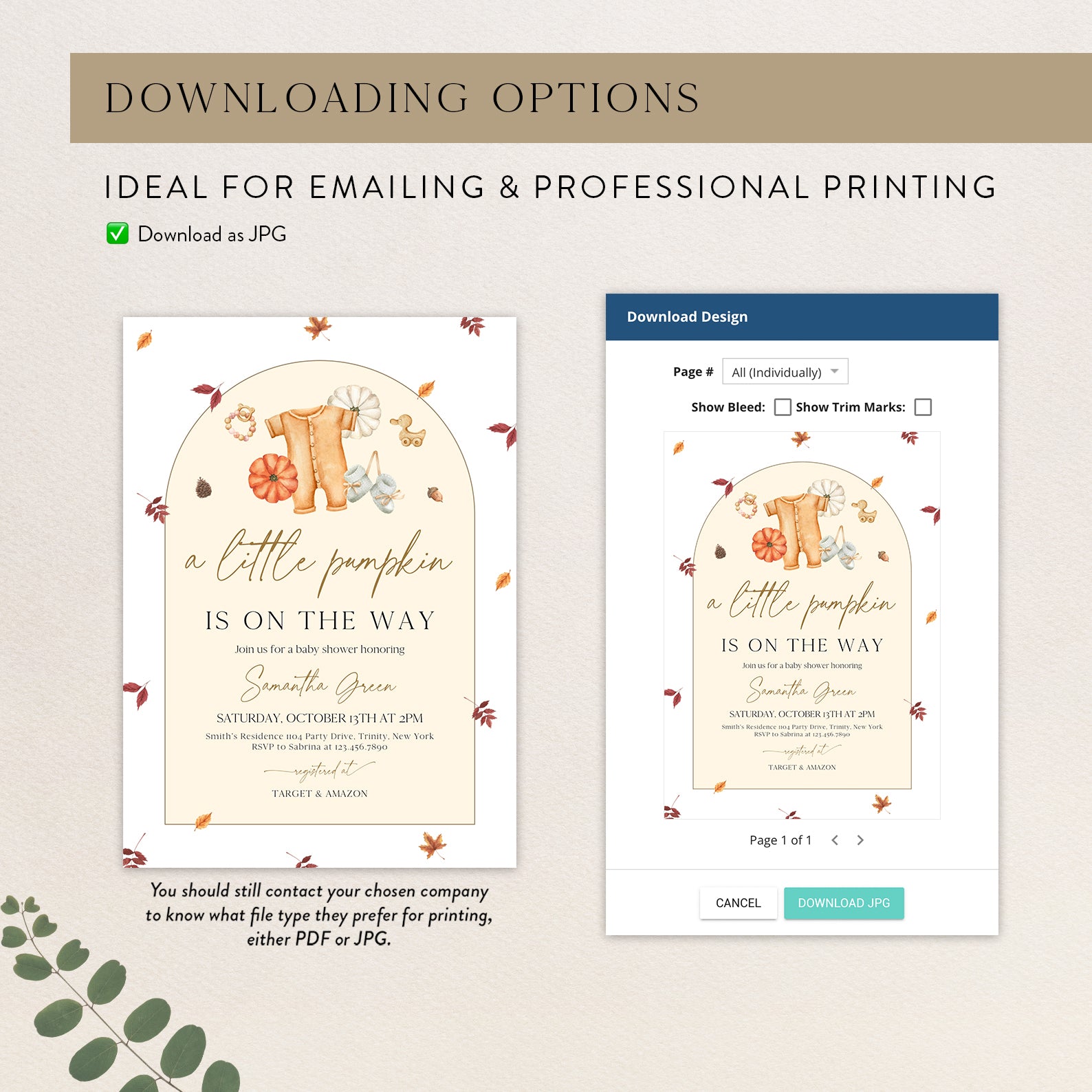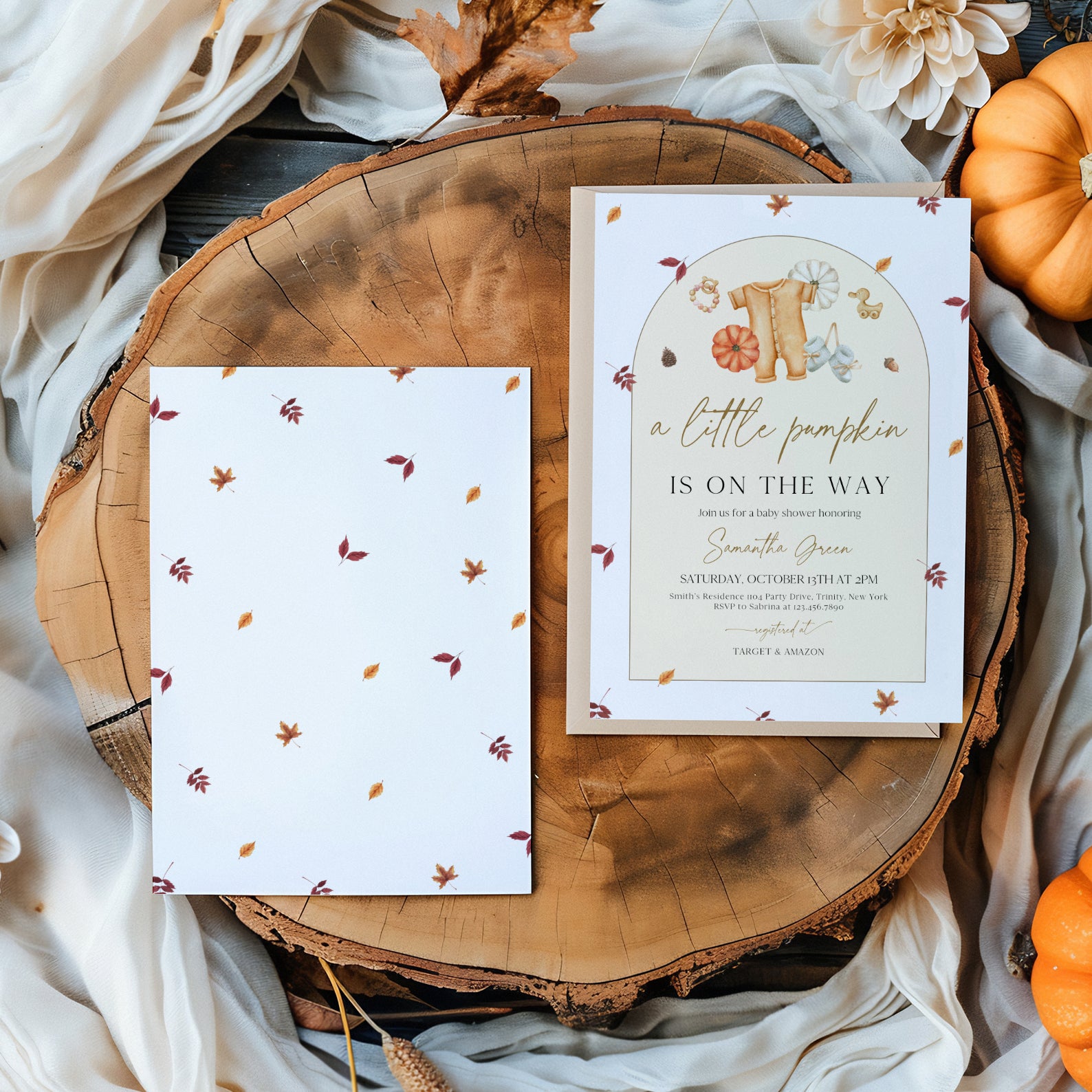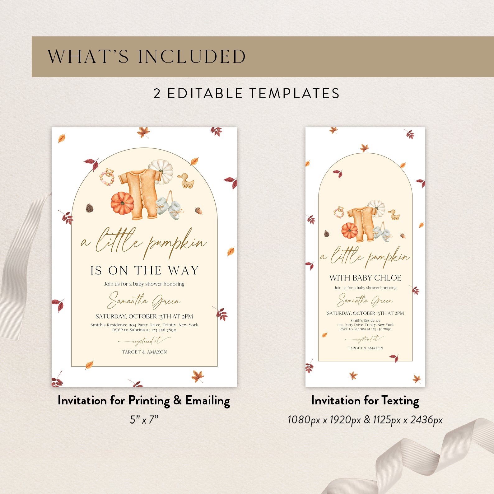 - Purchase this Fall Baby Shower Invite: Orange Baby Suit & Pumpkins template