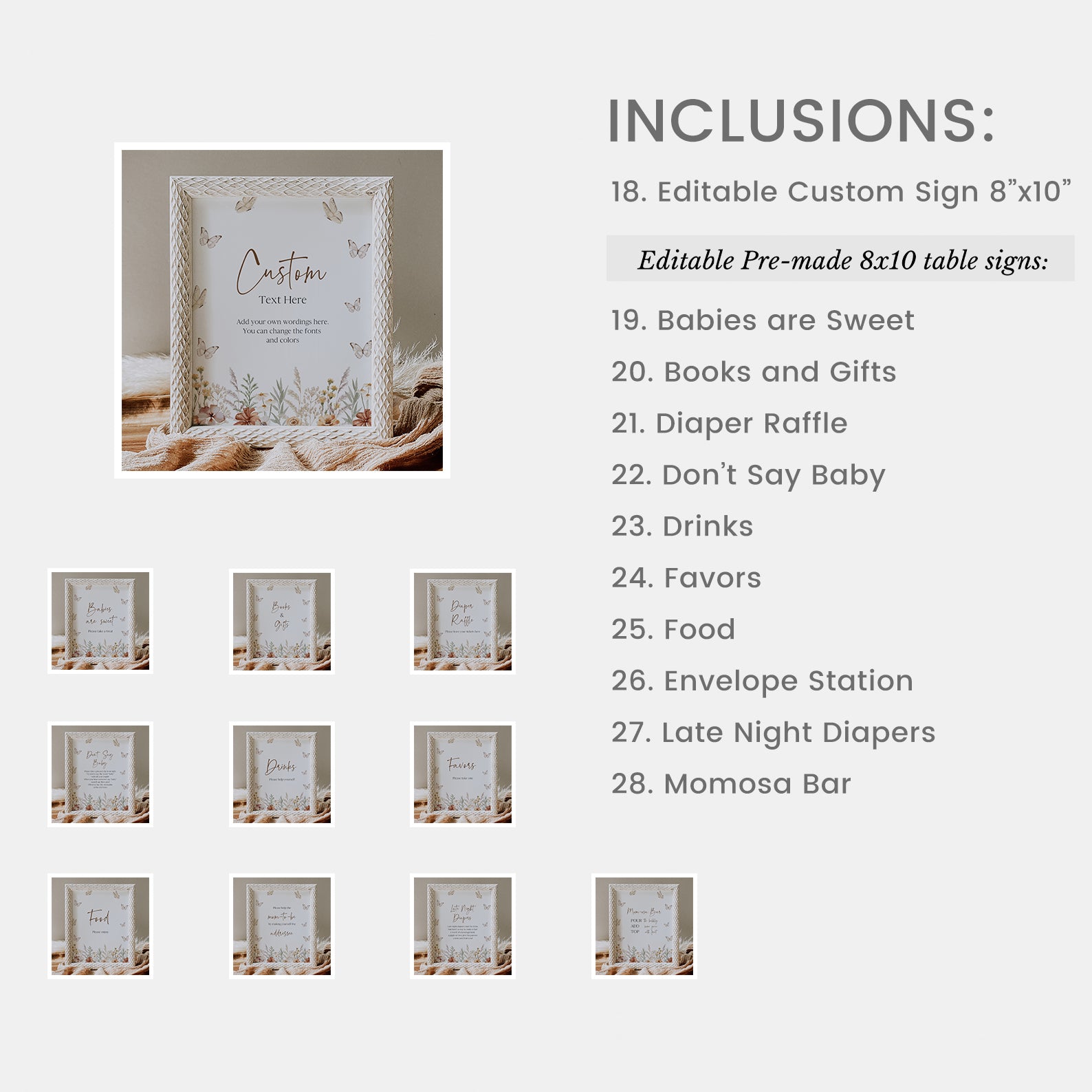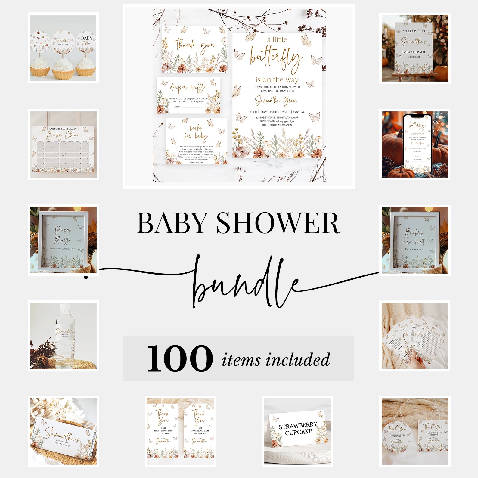 Celebrate your baby shower in style with our whimsical fall-themed mega bundle featuring 100 beautifully coordinated items. From invitations and thank you cards to editable games, signs, labels, and party decor, every piece is adorned with fluttering butterflies and blooming wildflowers in warm autumn hues. This thoughtfully designed collection adds charm, color, and a nature-inspired touch to your celebration making it easy to host a cohesive and memorable event from start to finish.