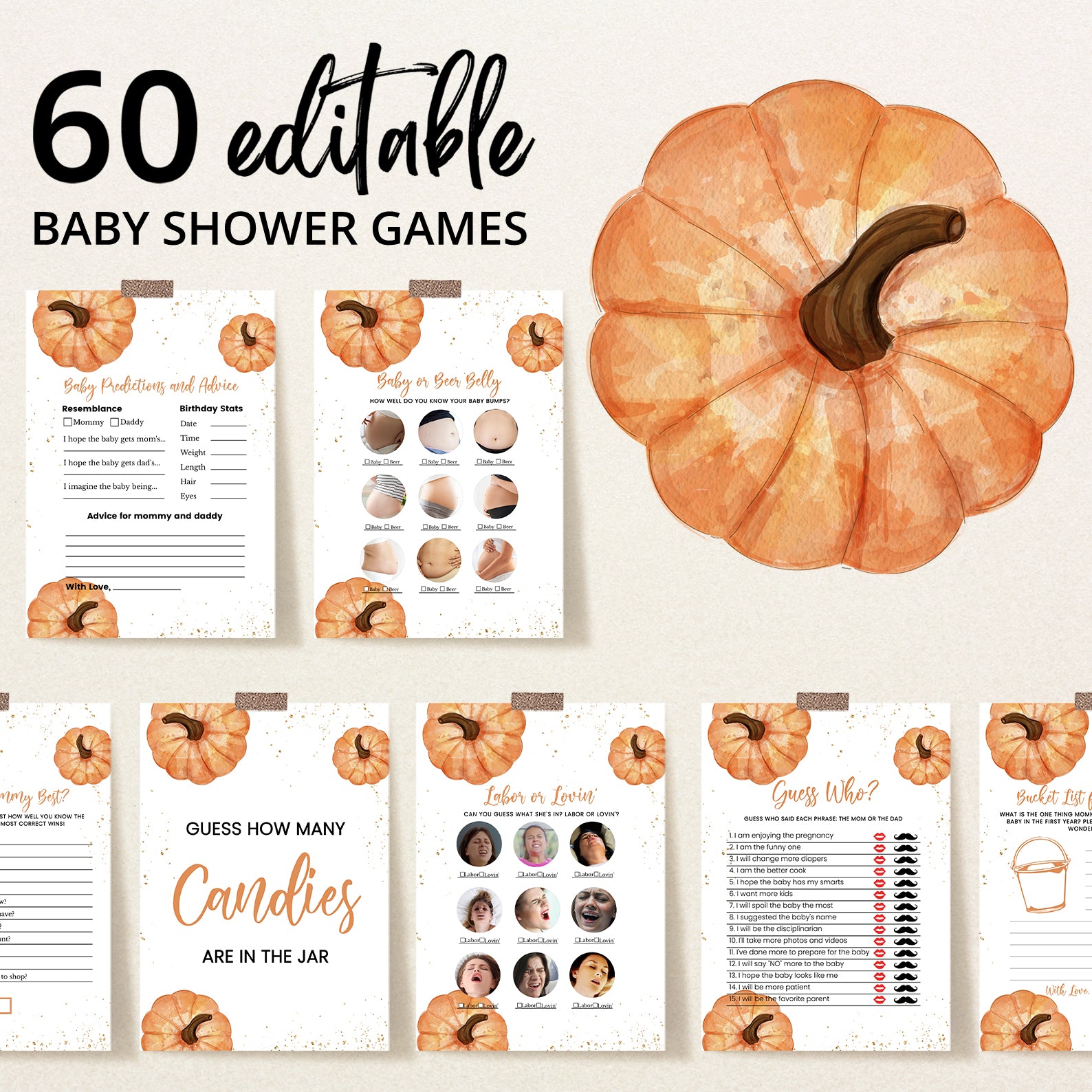 Entertain your guests with 60 editable baby shower games featuring watercolor pumpkins, golden sparkles, and warm fall tones. From classic guessing games to modern favorites, each design fits seamlessly into your autumn celebration. Whether indoors or outside, these coordinated games add laughter, fun, and festive spirit to your baby shower while keeping the pumpkin-perfect theme going strong.
