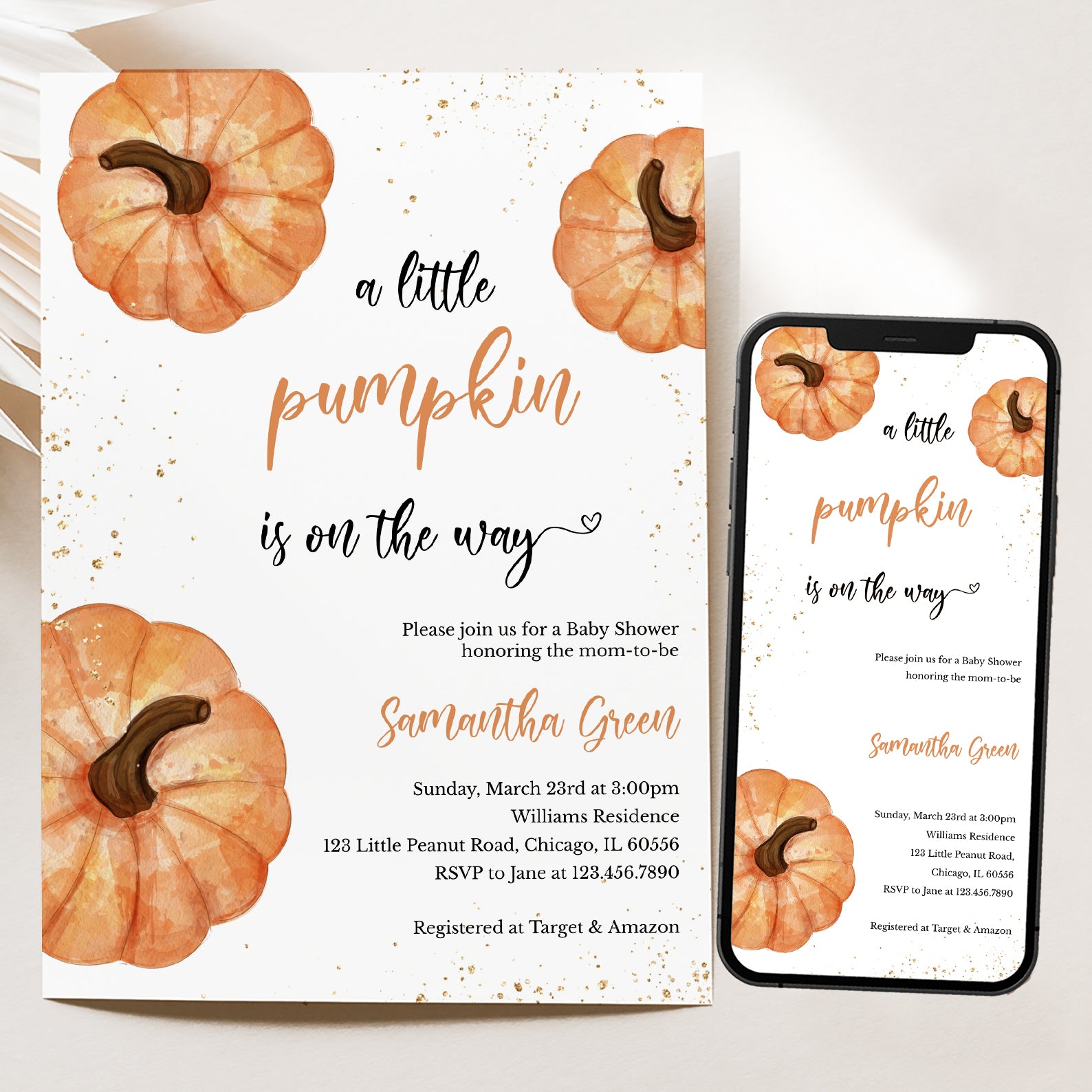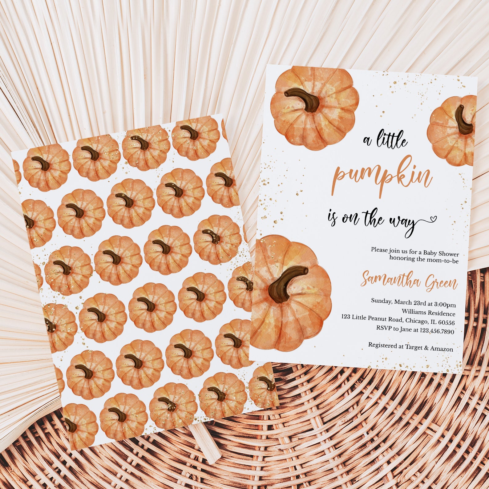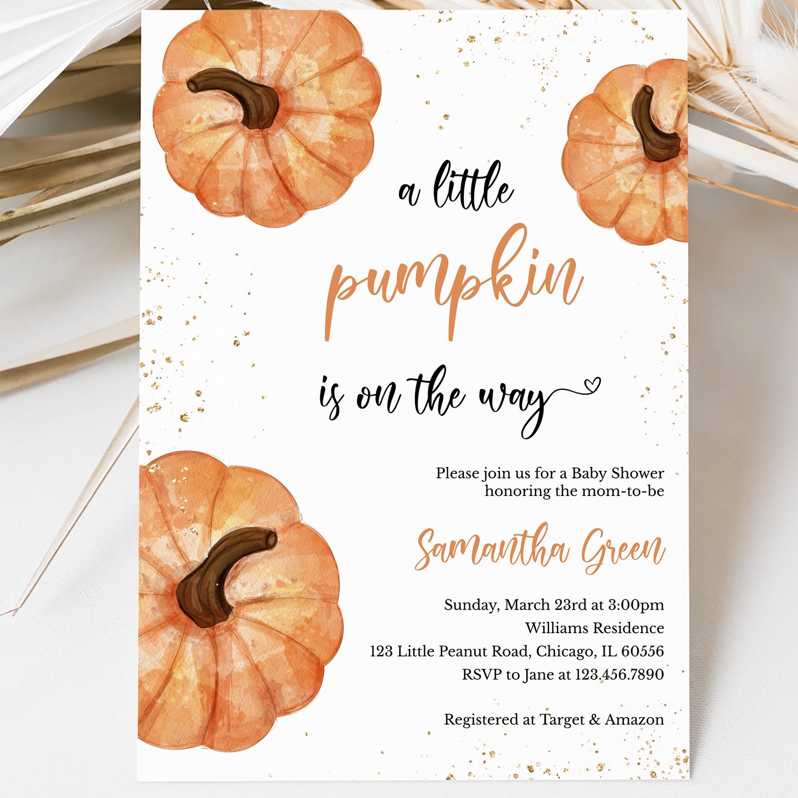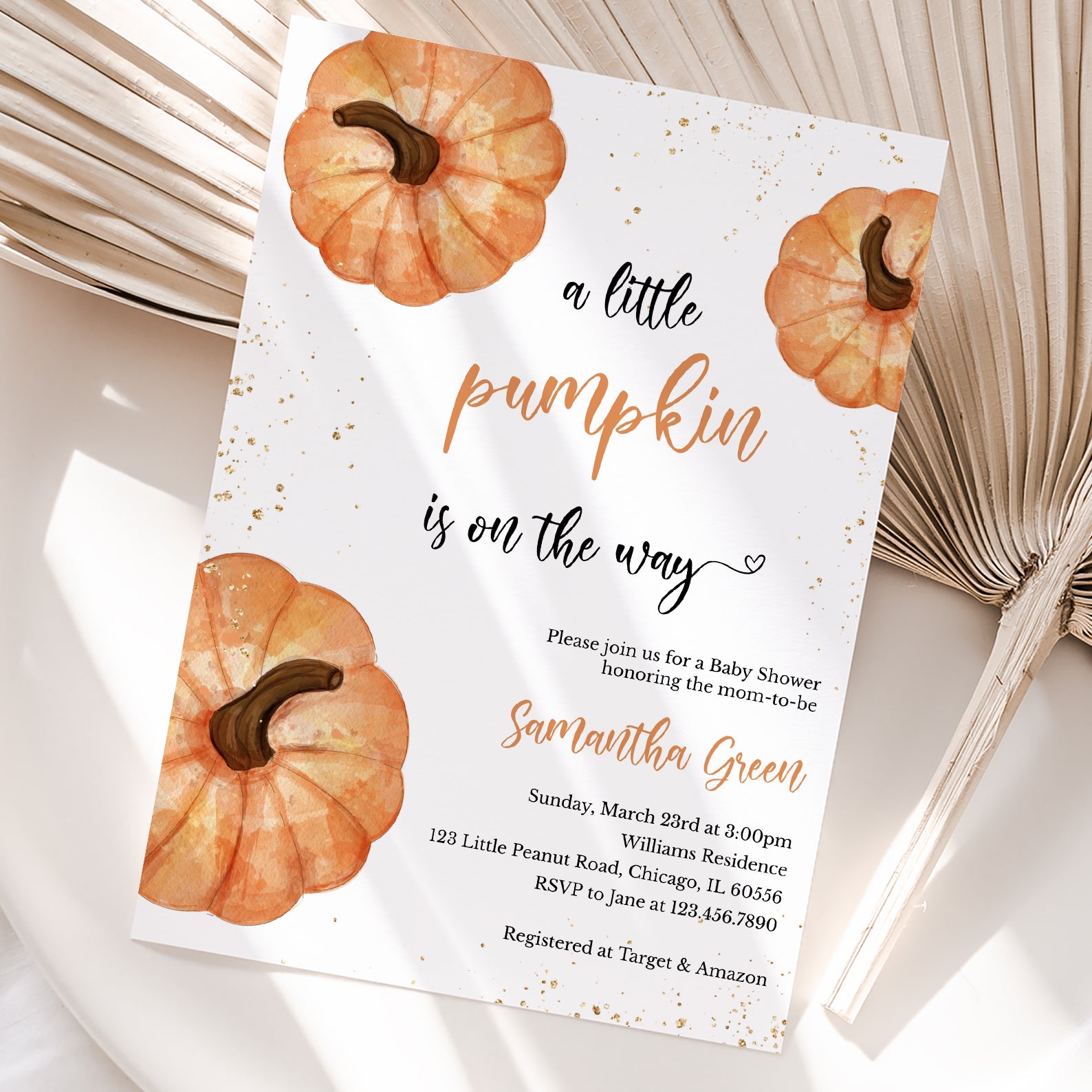 1. Purchase this A Little Pumpkin Fall Baby Shower Invite with Gold & Pumpkins template