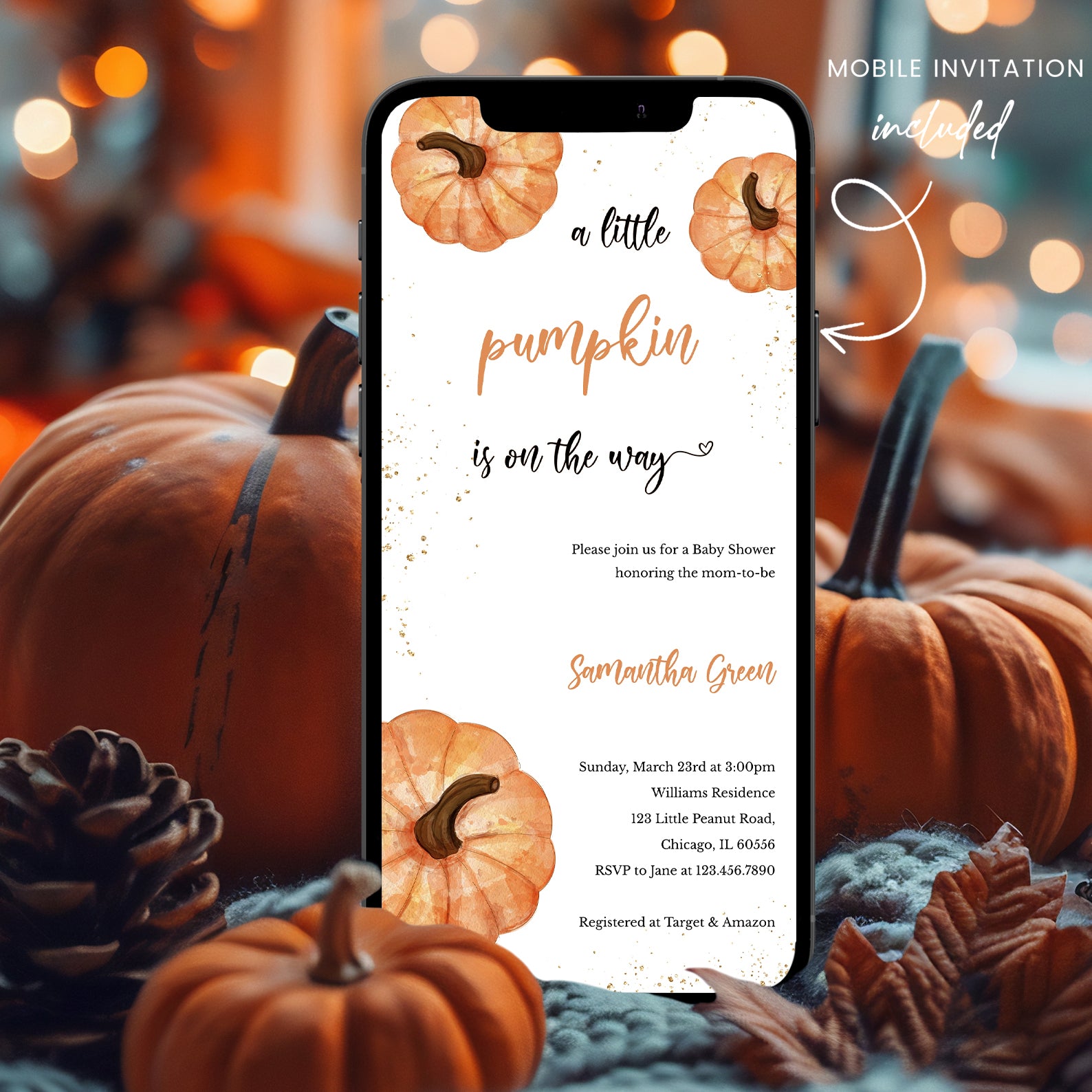 Celebrate the upcoming arrival of your little one with our charming fall baby shower digital invitation! Featuring delightful watercolor orange pumpkins with shimmering gold accents, this autumn-themed invitation perfectly captures the essence of a cozy, pumpkin-filled celebration. Ideal for a pumpkin-themed or fall baby shower, this customizable invite brings warmth and elegance to your special gathering. Share the joy and excitement of your growing family with this enchanting autumn baby shower invitation.