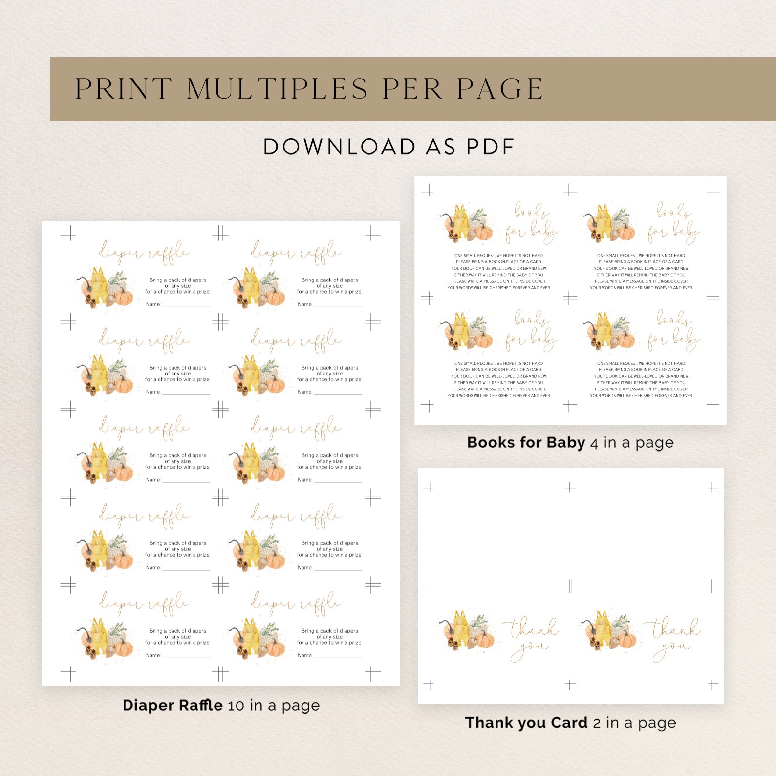 Prepare for your little one’s arrival with our fall baby shower invitation bundle. This set includes a digital invitation, mobile invite, diaper raffle, books for baby, and thank you card. Featuring a charming orange pumpkin, baby jumper suit, tiny shoes, and a floral basket with gold glitter, it adds a whimsical and elegant touch to your autumn celebration.