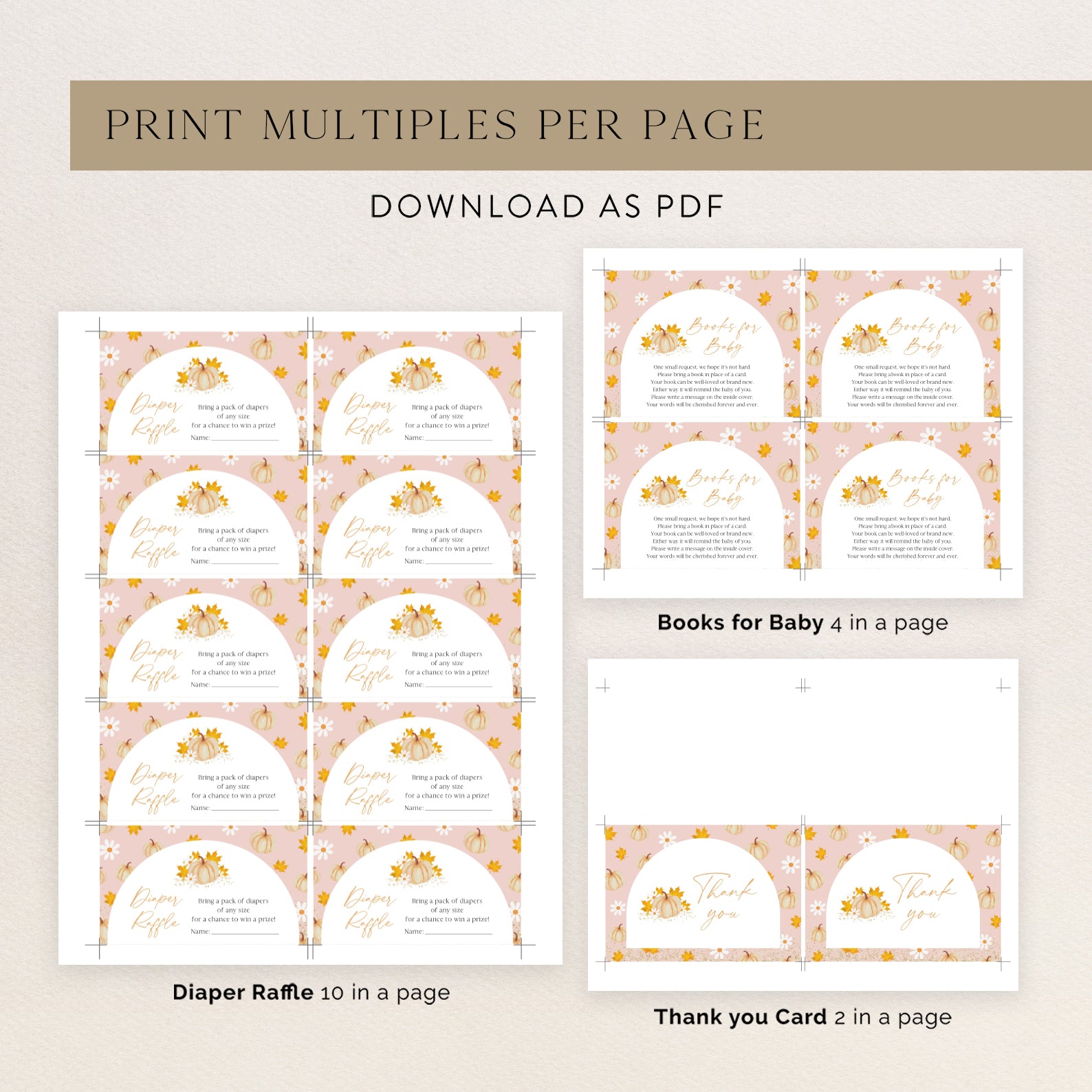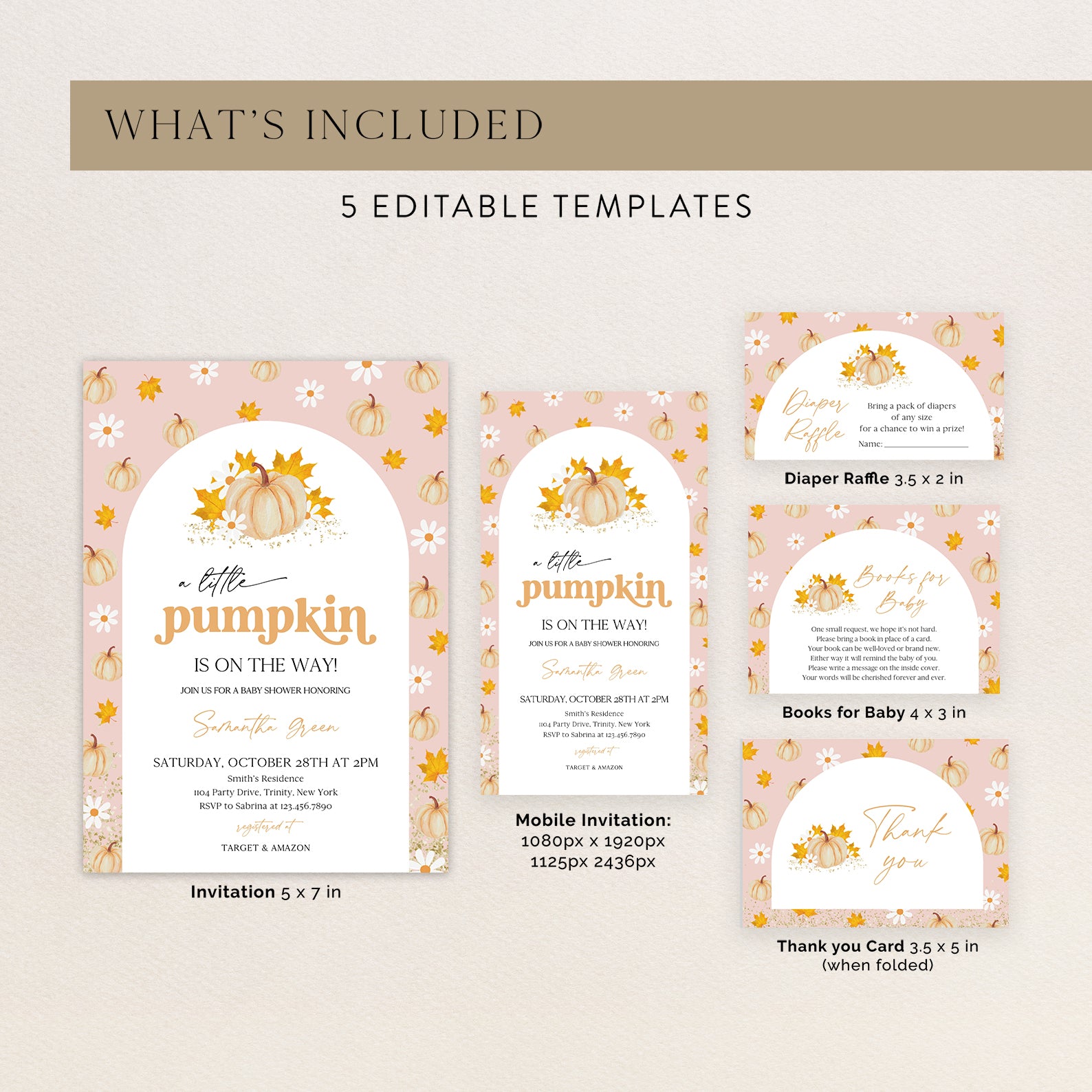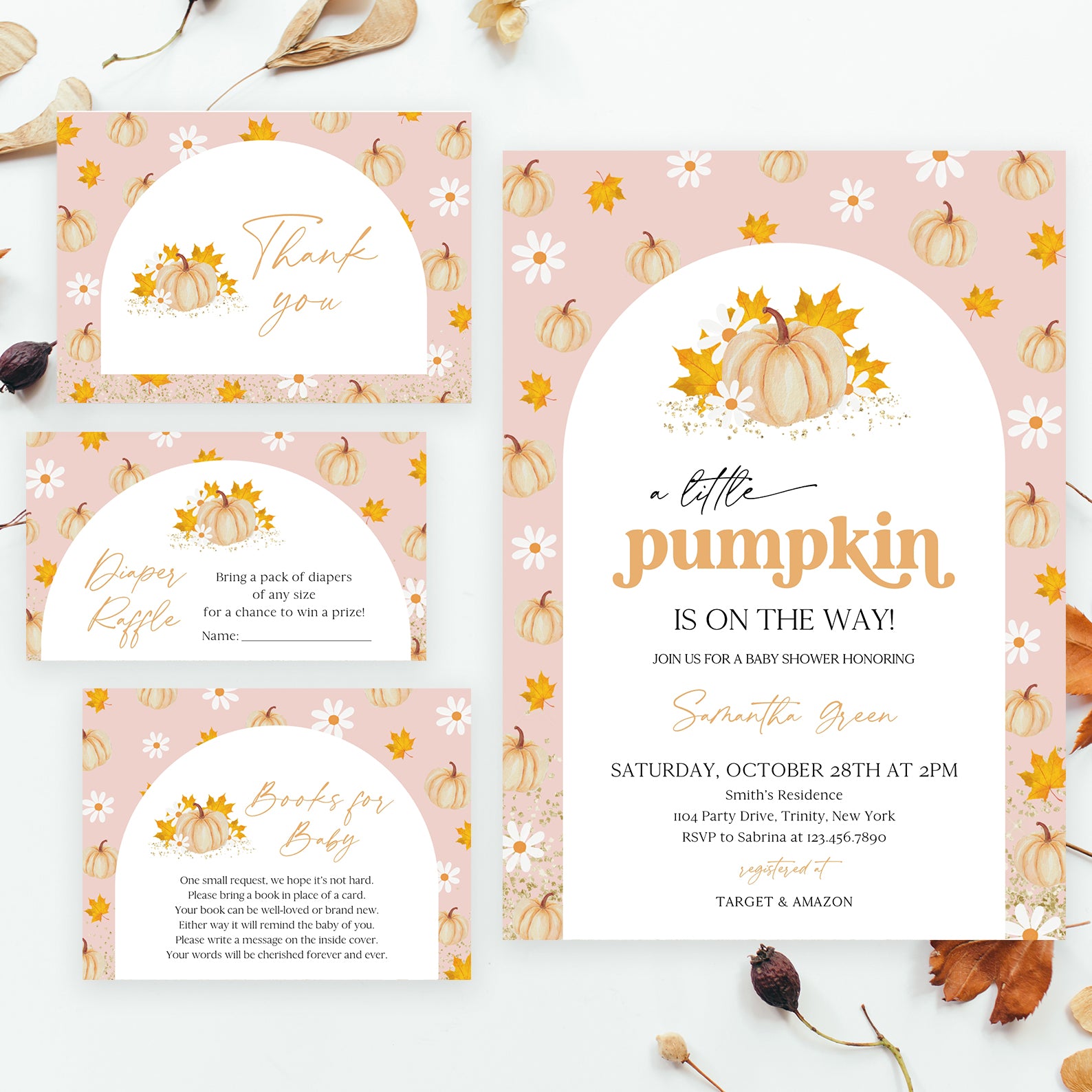 Get ready for fall with our adorable baby shower invitation bundle! This set includes a digital invitation, mobile invite, diaper raffle, books for baby card, and thank you card. Featuring a whimsical white arch and watercolor orange pumpkins on a pink background, it perfectly captures autumn’s charm and sets the stage for a cozy celebration.
