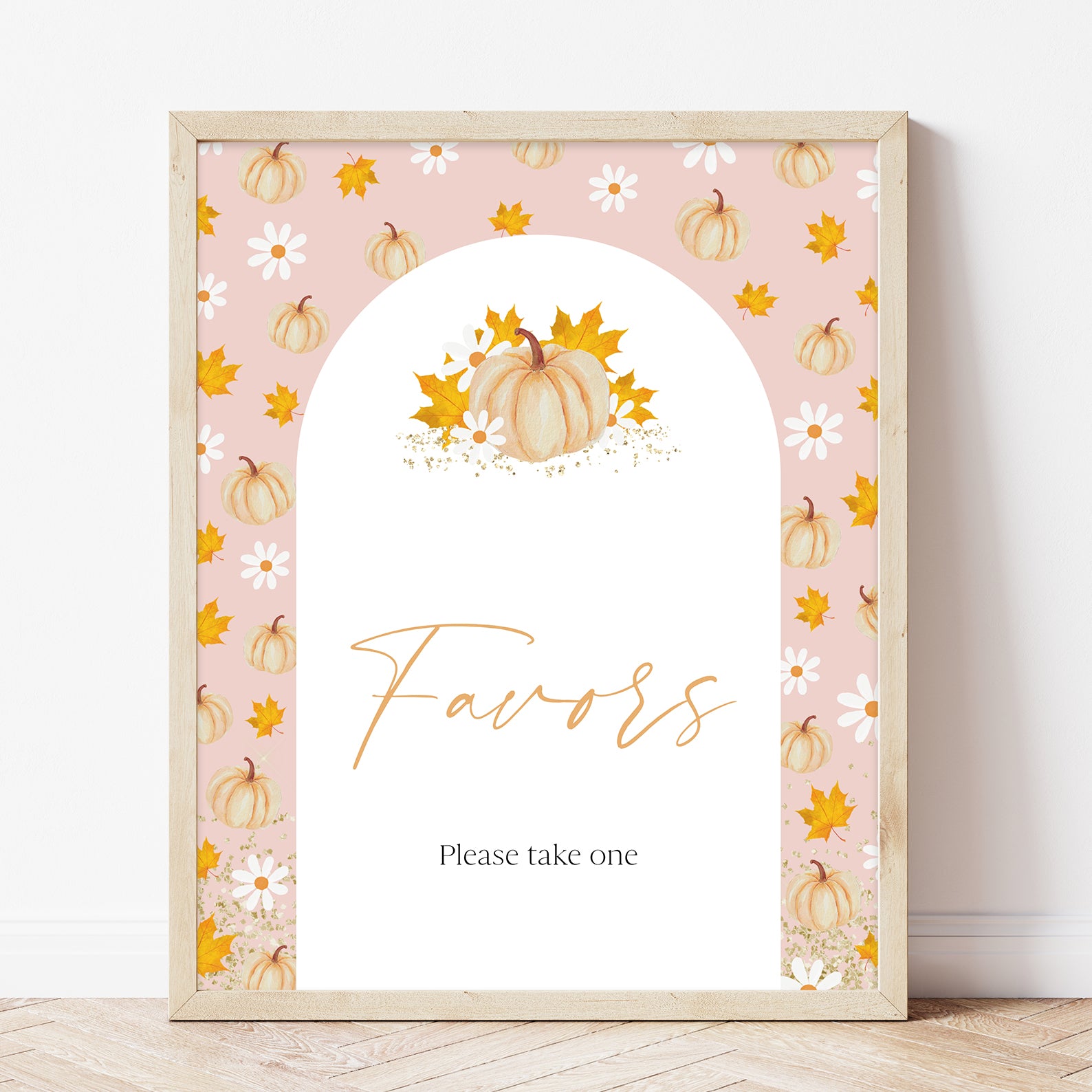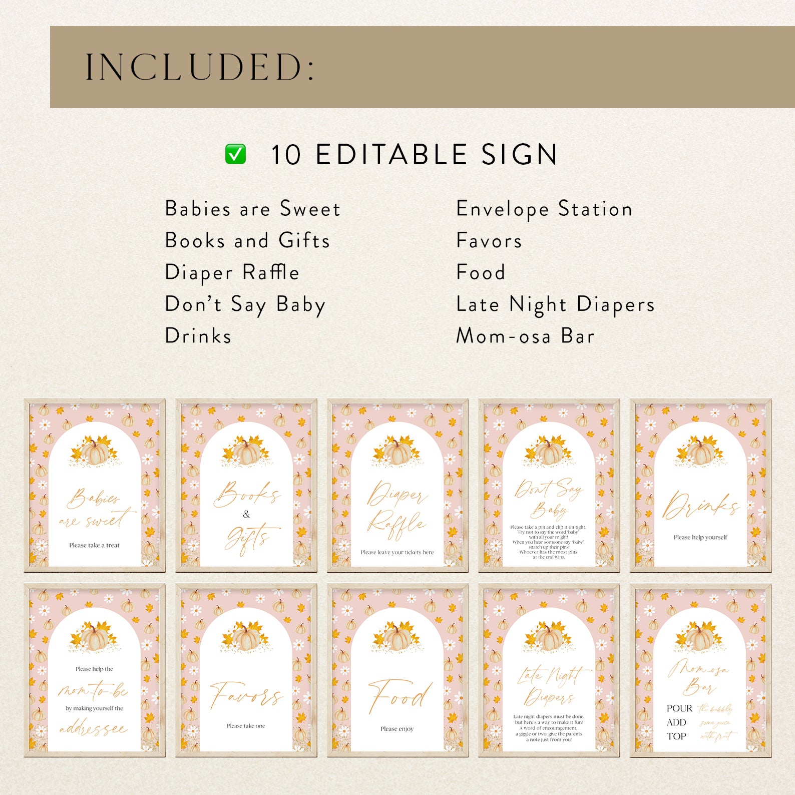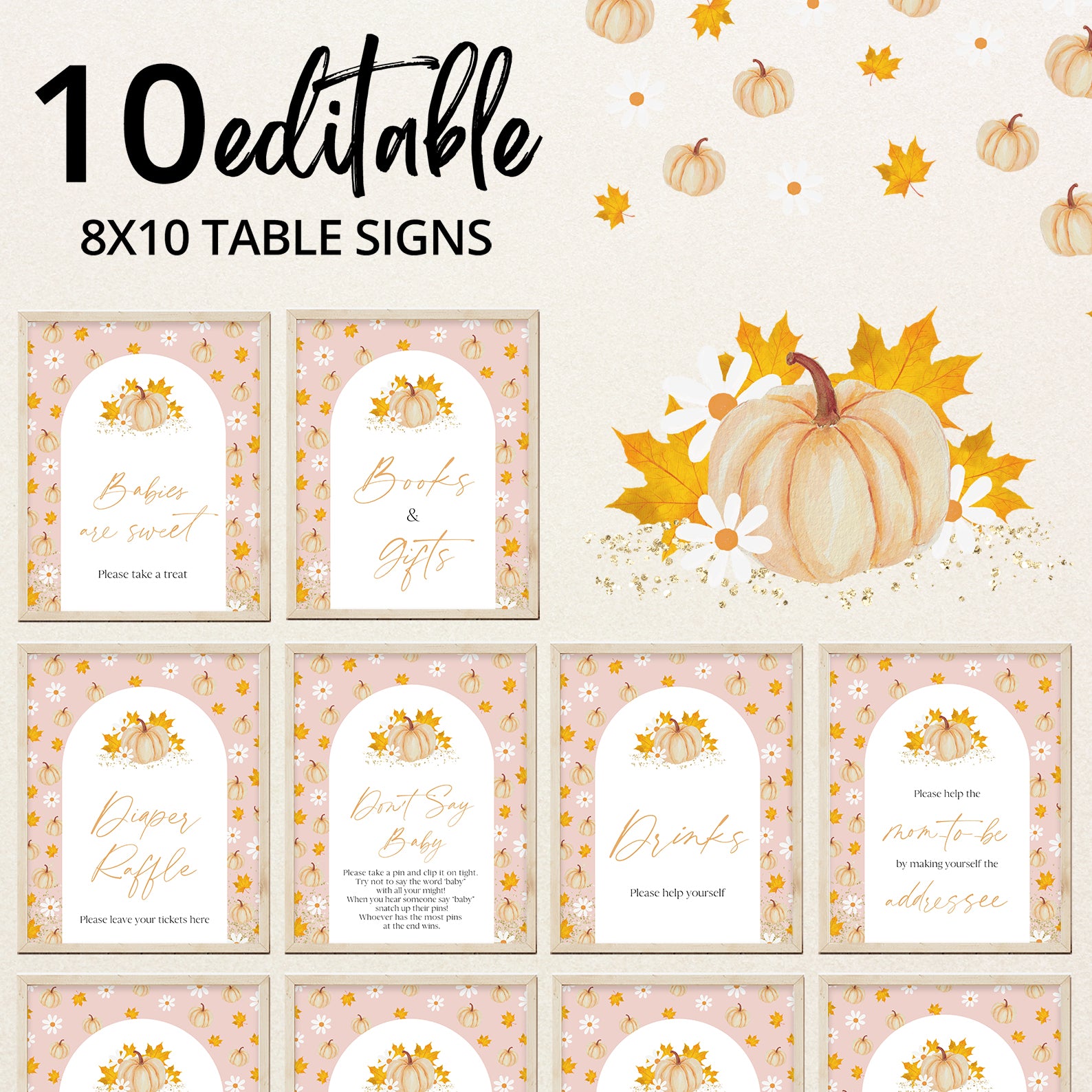 Add a festive touch to your fall baby shower with this set of 10 editable table signs! Each sign features a soft pink background, a white arched frame, and charming watercolor orange pumpkins with delicate autumn foliage. Perfectly coordinated for your autumn-themed celebration, these signs include: Babies Are Sweet, Books and Gifts, Diaper Raffle, Don’t Say Baby, Drinks, Envelope Station, Favors, Food, Late Night Diapers, and Mom-osa Bar.