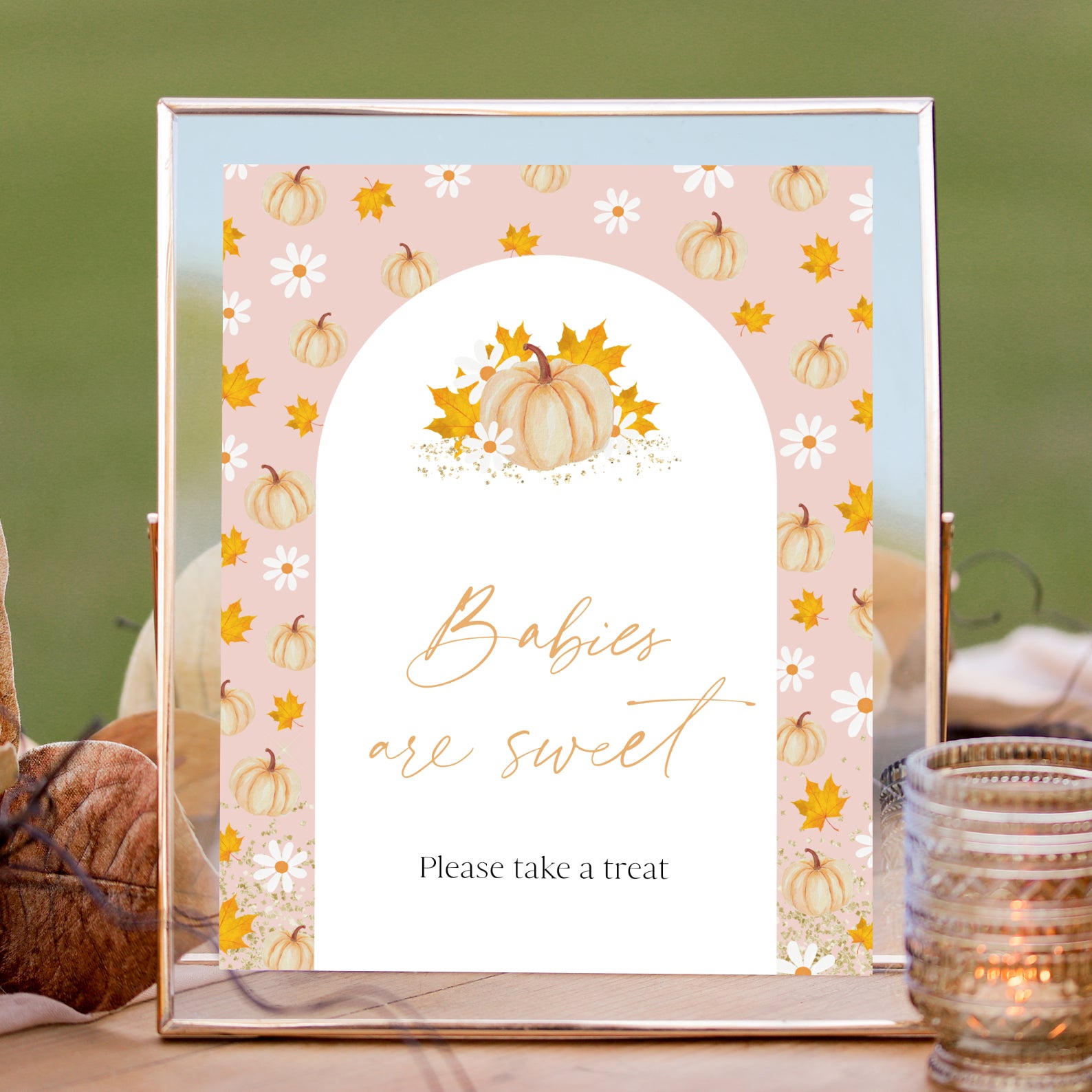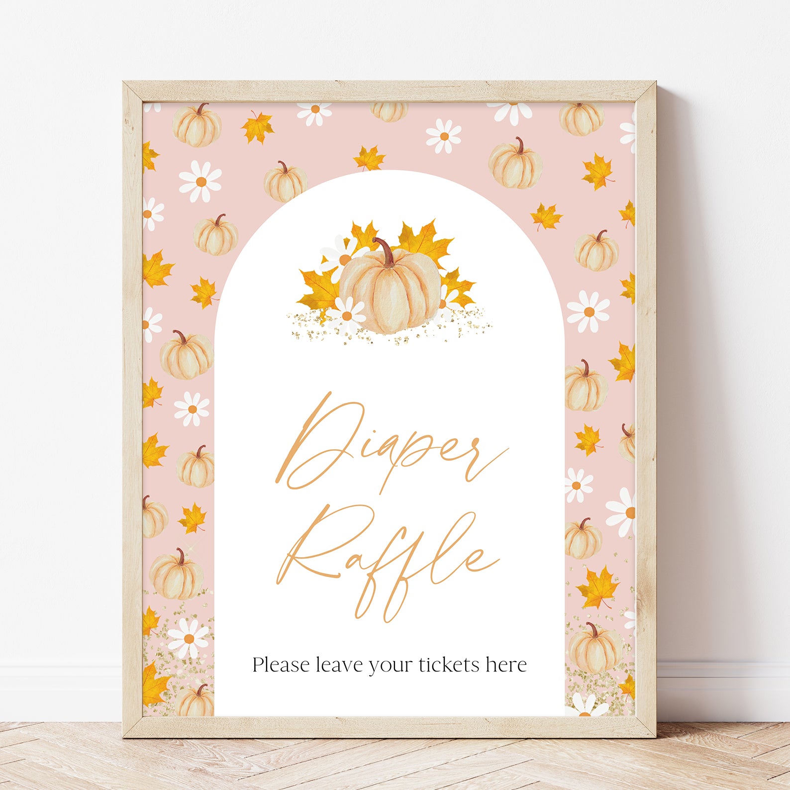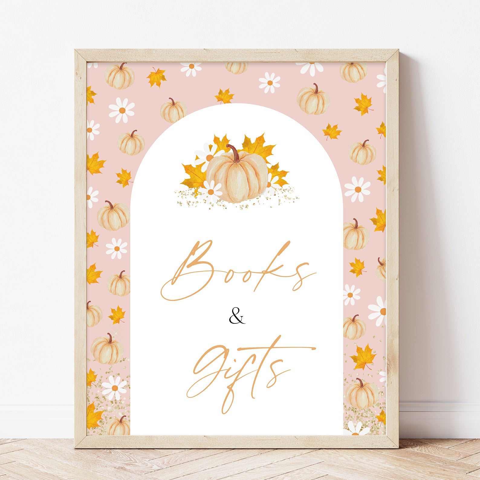 Add a festive touch to your fall baby shower with this set of 10 editable table signs! Each sign features a soft pink background, a white arched frame, and charming watercolor orange pumpkins with delicate autumn foliage. Perfectly coordinated for your autumn-themed celebration, these signs include: Babies Are Sweet, Books and Gifts, Diaper Raffle, Don’t Say Baby, Drinks, Envelope Station, Favors, Food, Late Night Diapers, and Mom-osa Bar.