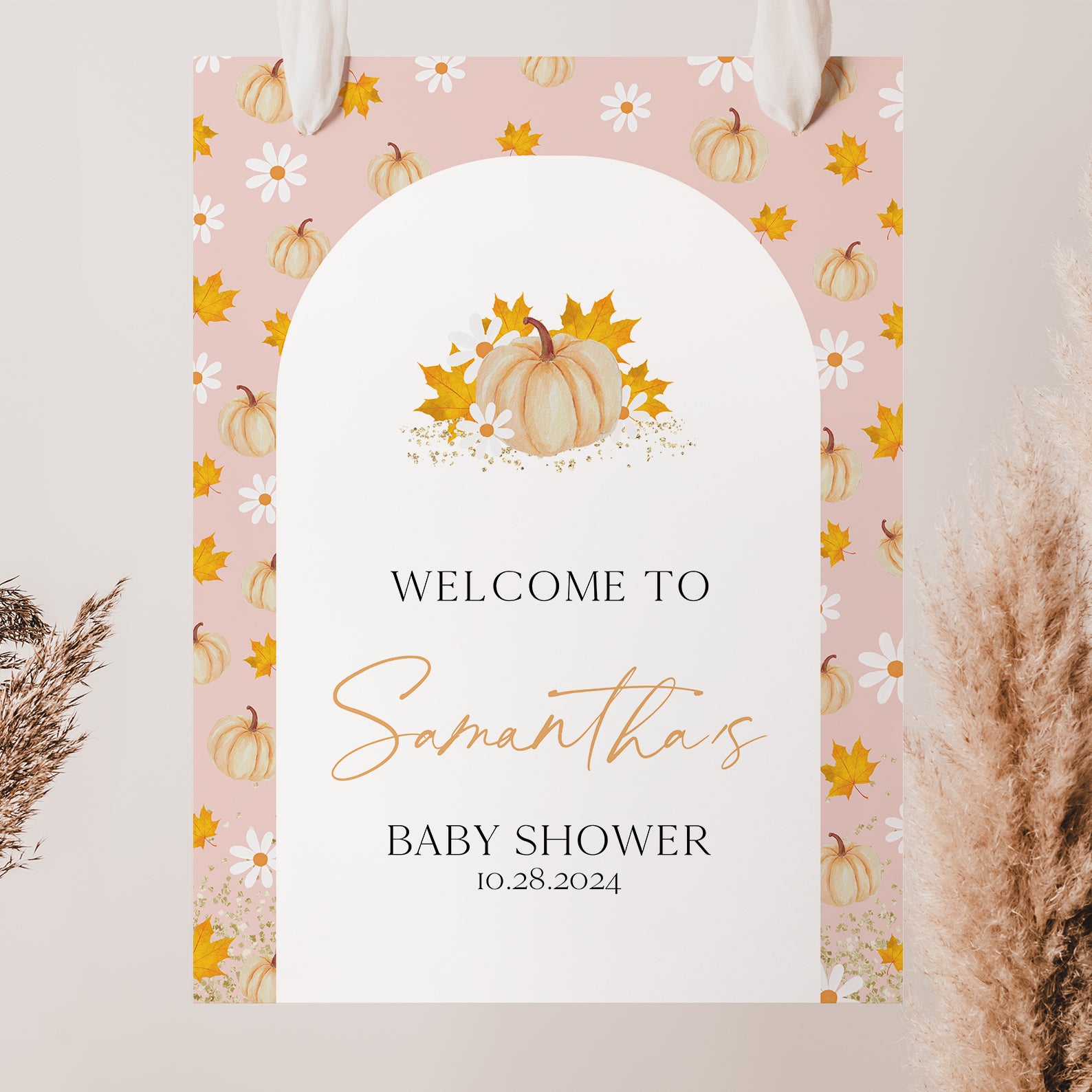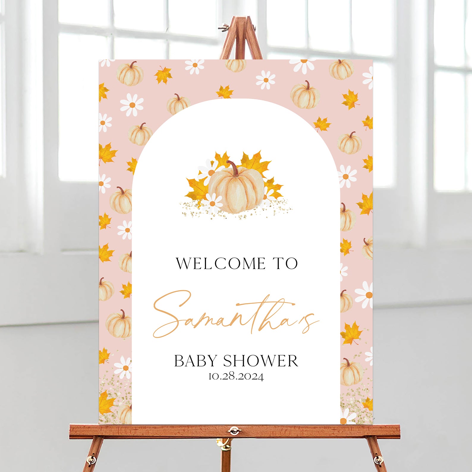 Welcome guests to your fall baby shower with our charming digital welcome sign! Designed with a whimsical white arch and a watercolor orange pumpkin pattern on a soft pink background, it beautifully captures autumn’s cozy vibe and adds a warm touch to your event