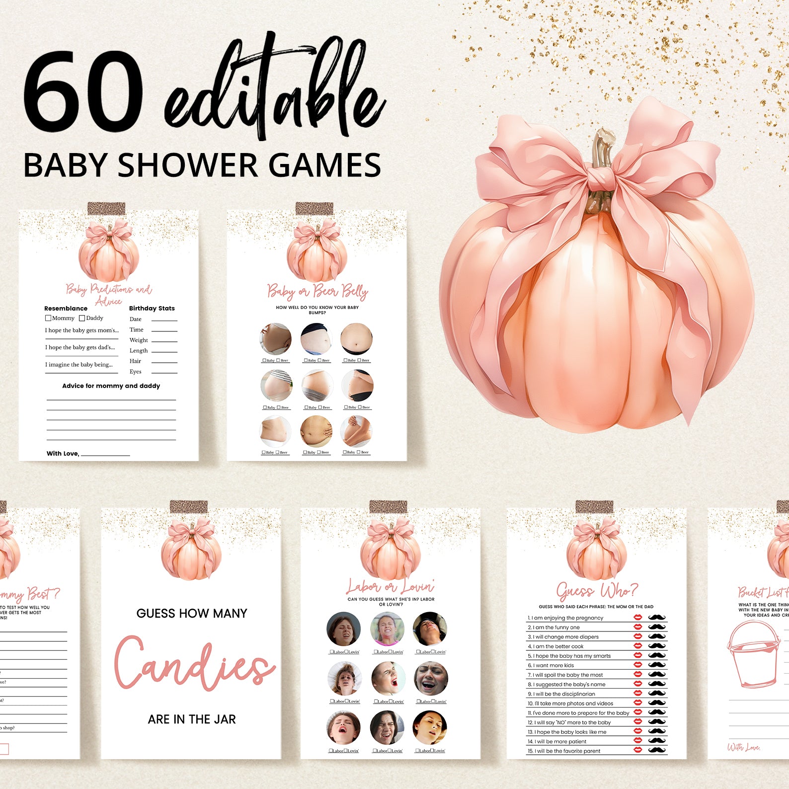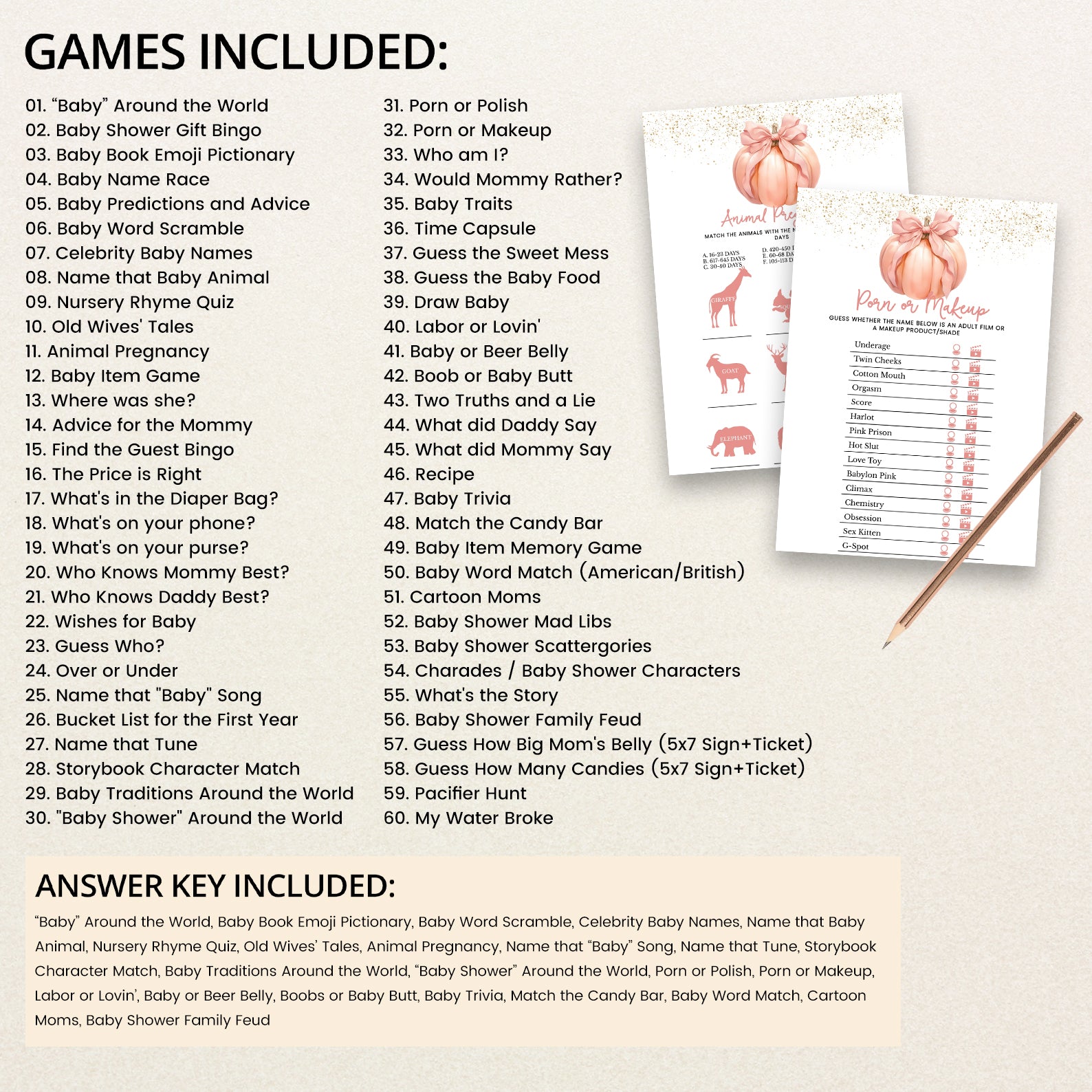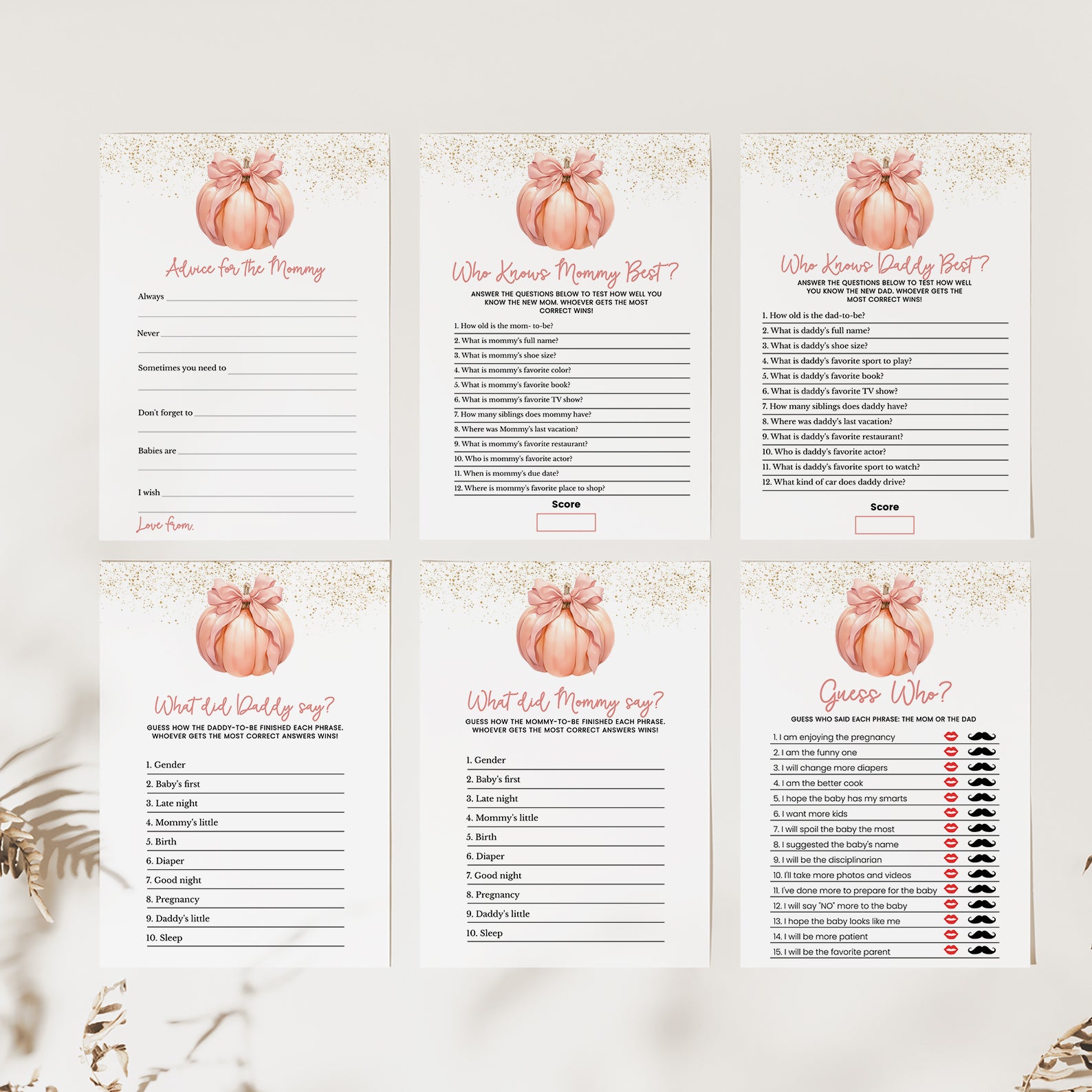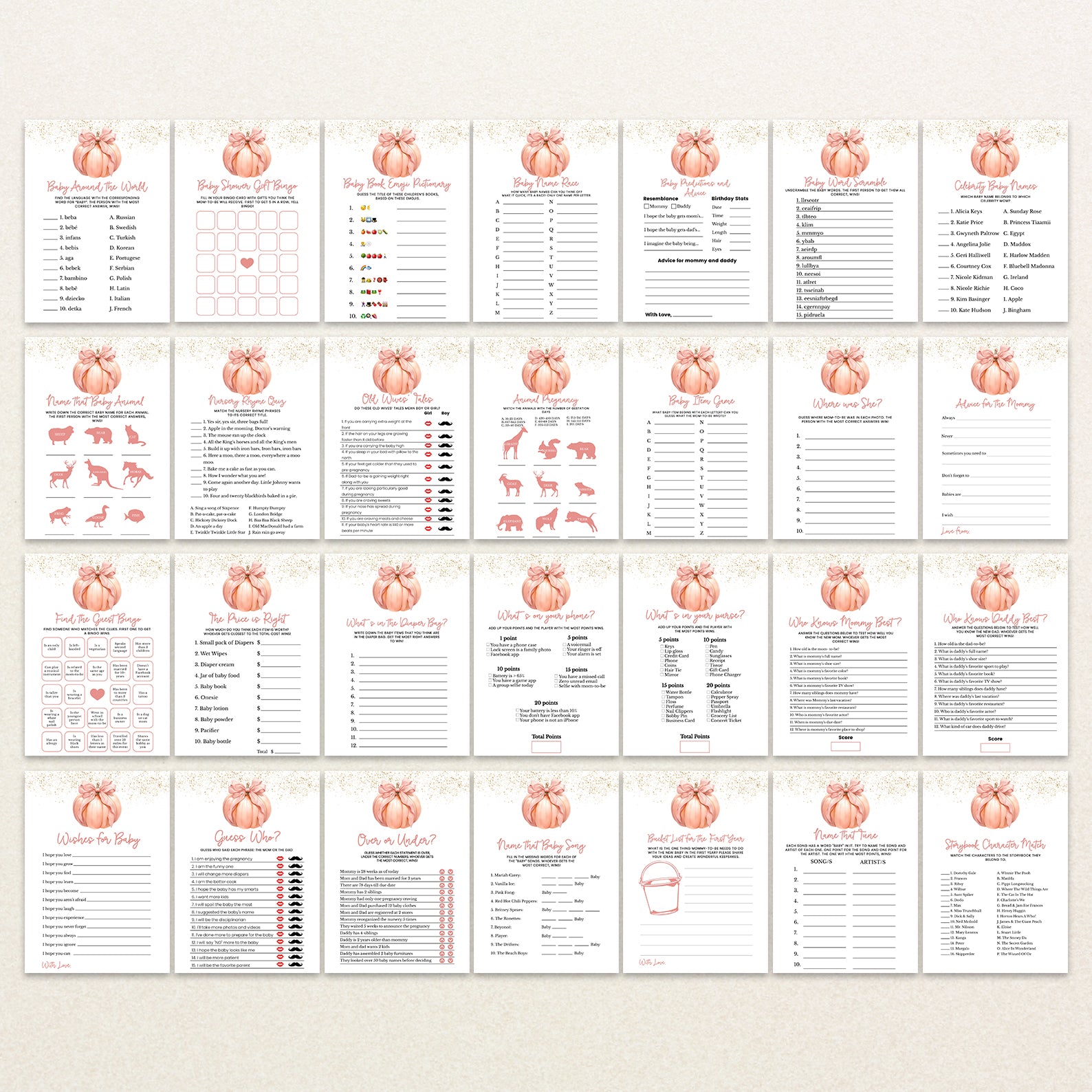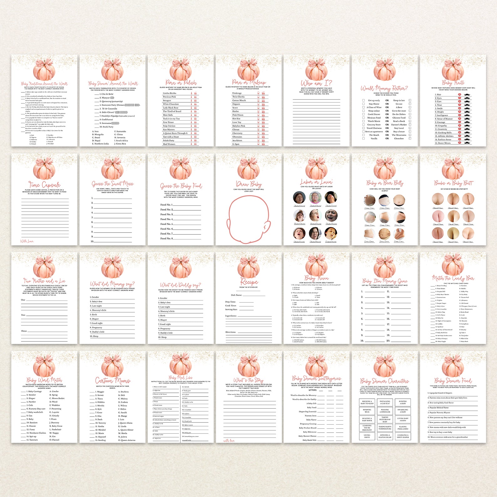 Add fun and festive flair to your autumn baby shower with this pink-themed game bundle! Featuring 60 editable baby shower games, each design highlights a soft peach pumpkin with a pink ribbon and touches of gold, perfectly matching your cozy fall celebration. From Baby Bingo to Who Knows Mommy Best, these games are easy to personalize and guaranteed to entertain your guests while celebrating your little pumpkin’s upcoming arrival.
