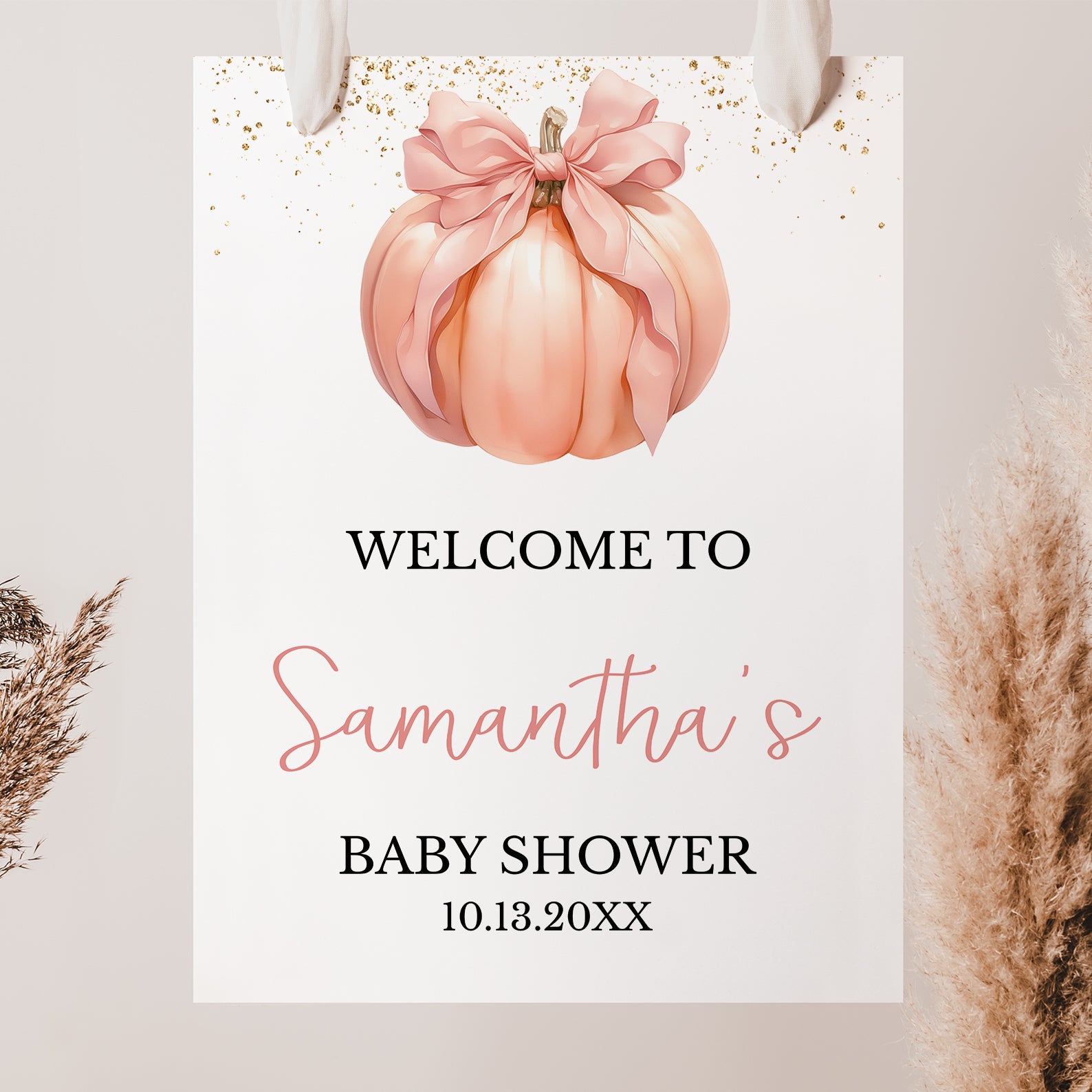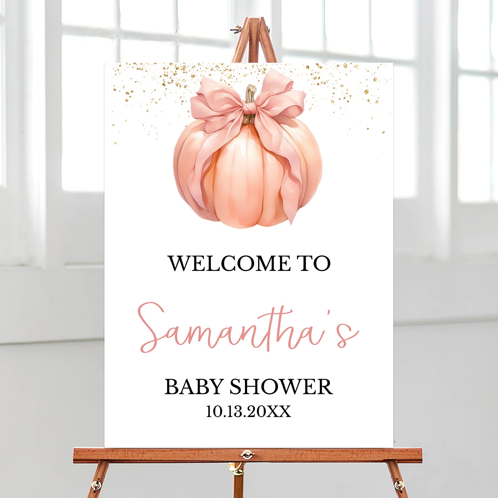 Greet your guests with autumn charm using this pink-themed fall baby shower welcome sign! Featuring a soft bone-white background, a peach-toned pumpkin adorned with a delicate pink ribbon, and shimmering gold accents at the top, this sign sets a sweet and elegant tone for your celebration. Perfect for a “little pumpkin is on the way” party, it's an eye-catching way to welcome loved ones in style.