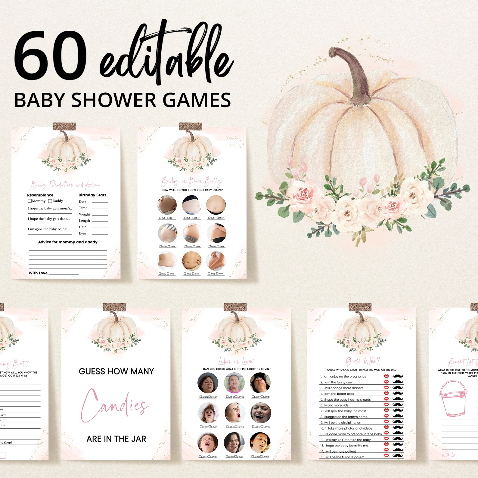 Bring the fun with 60 editable baby shower games, each designed with blush pumpkins, romantic watercolor roses, leafy accents, and shimmering gold details. From classics like “Who Knows Mommy Best” to interactive icebreakers, this bundle blends entertainment with a soft autumn aesthetic. A perfect match for your fall celebration, these games will have guests laughing, bonding, and enjoying every moment.