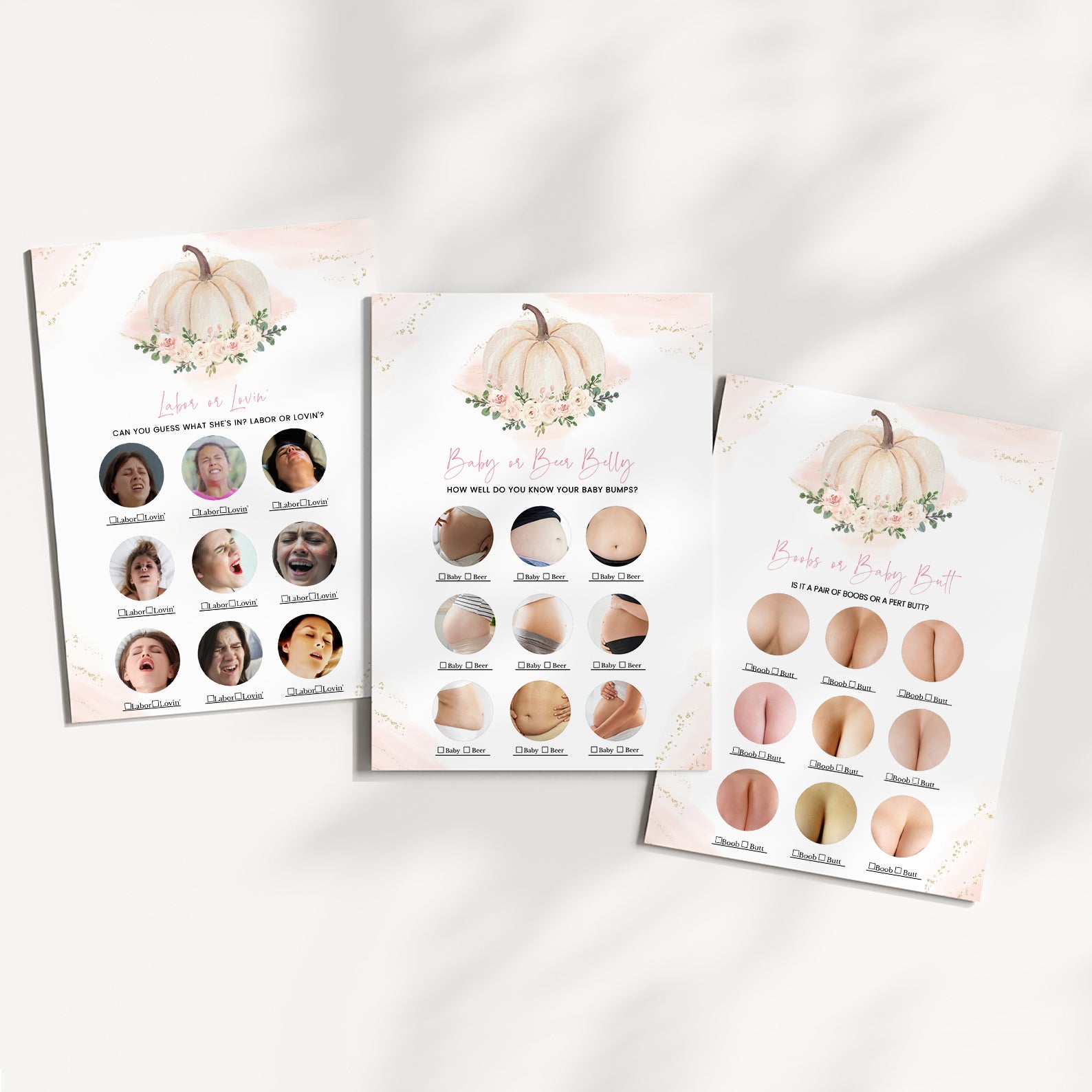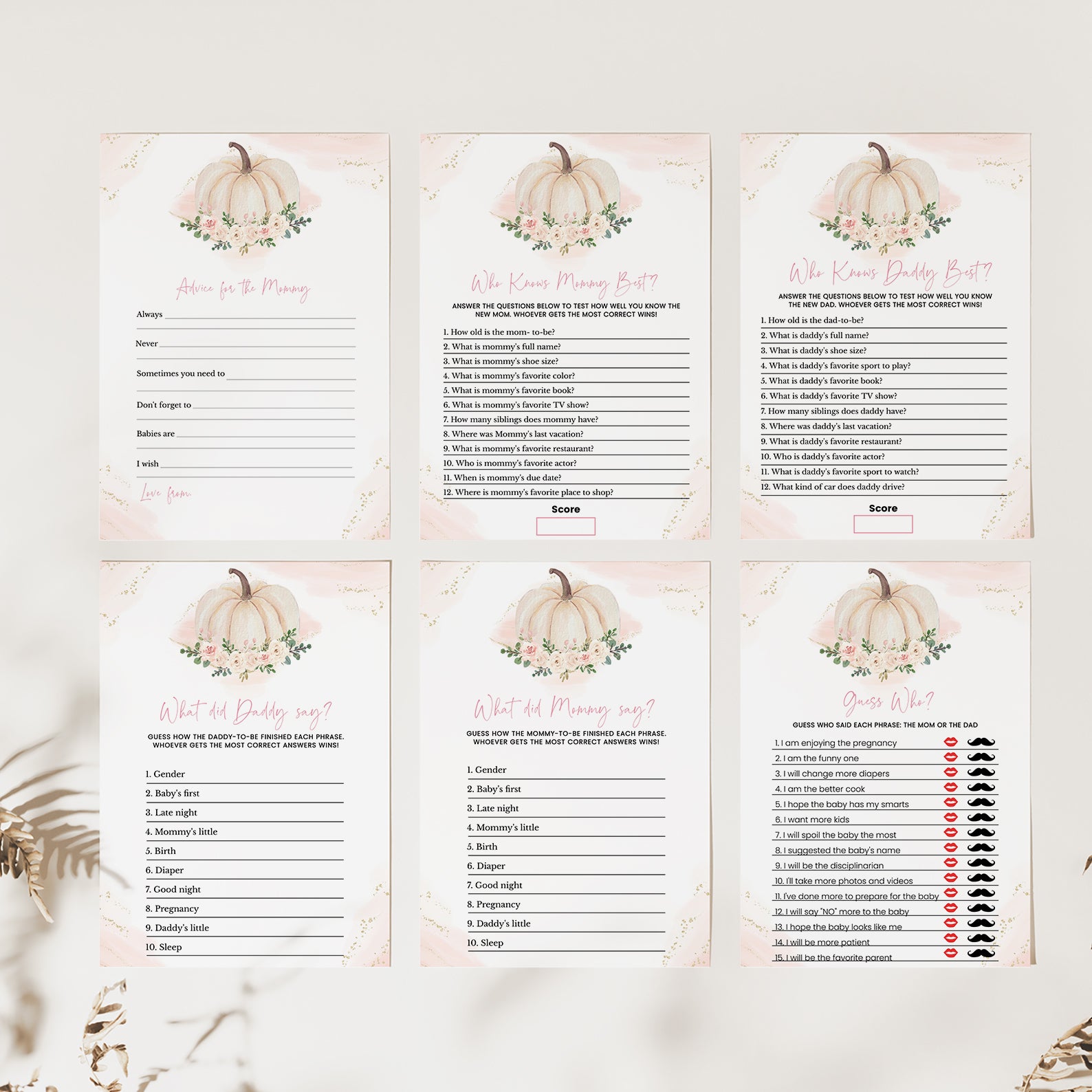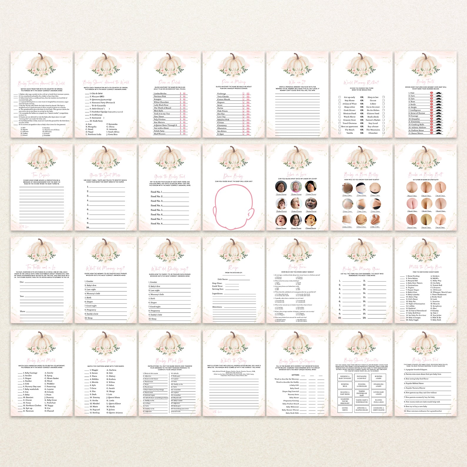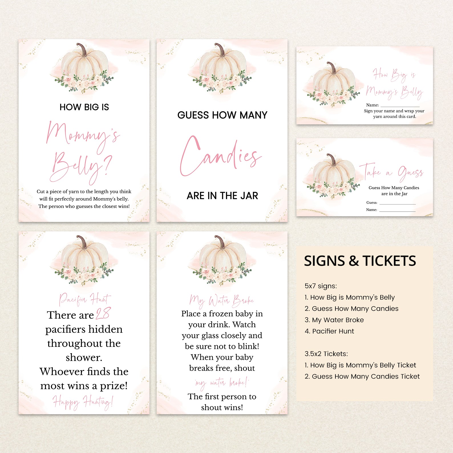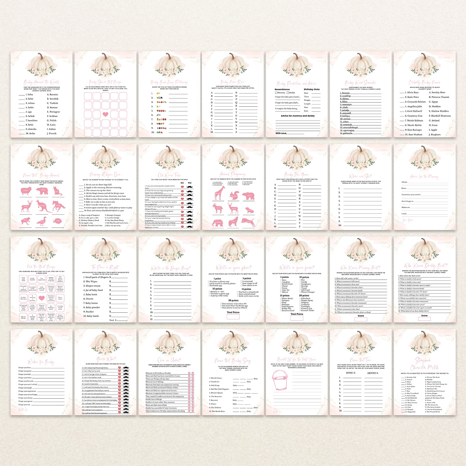 - Purchase this A Little Pumpkin Pink Fall Baby Shower Game Bundle with Roses & Gold template