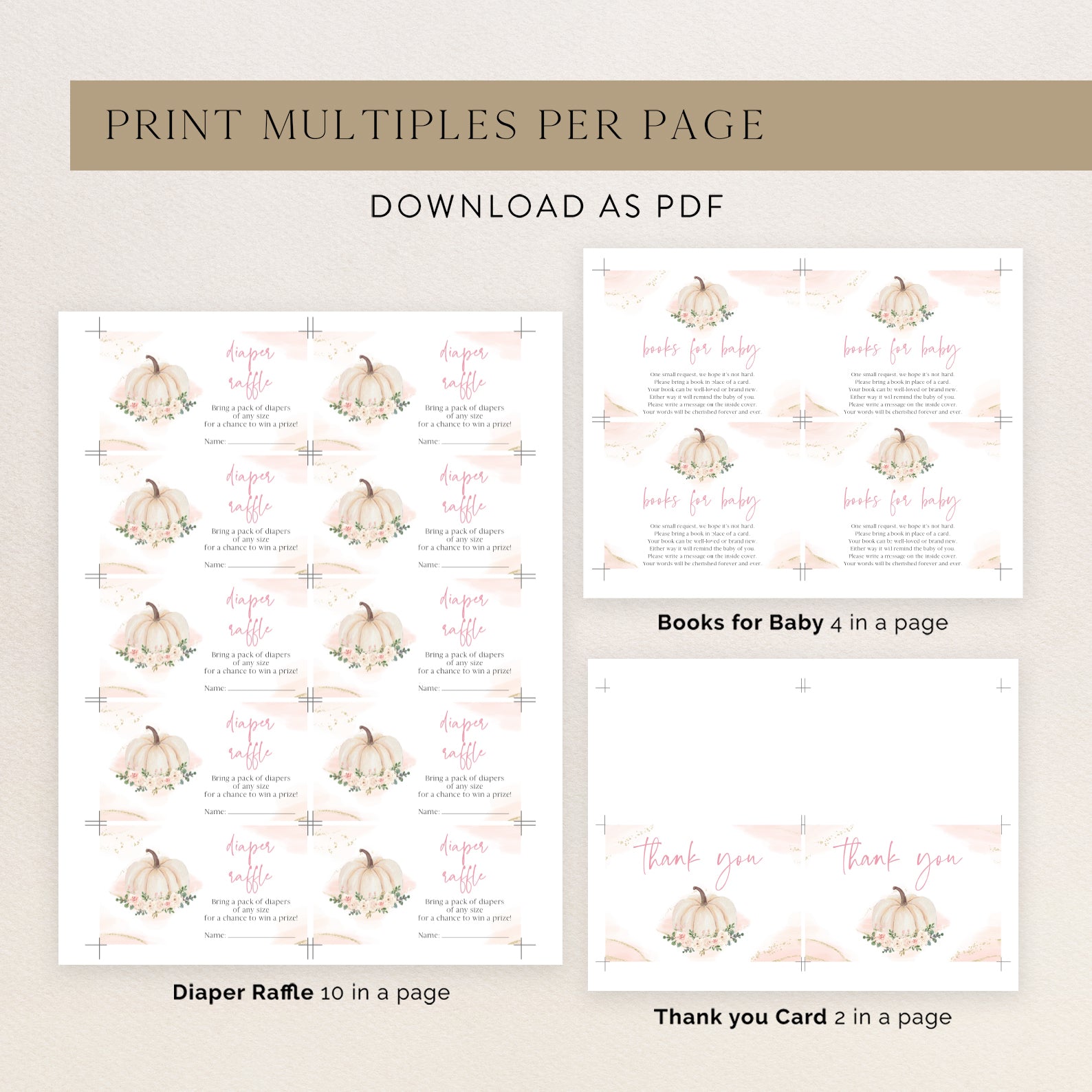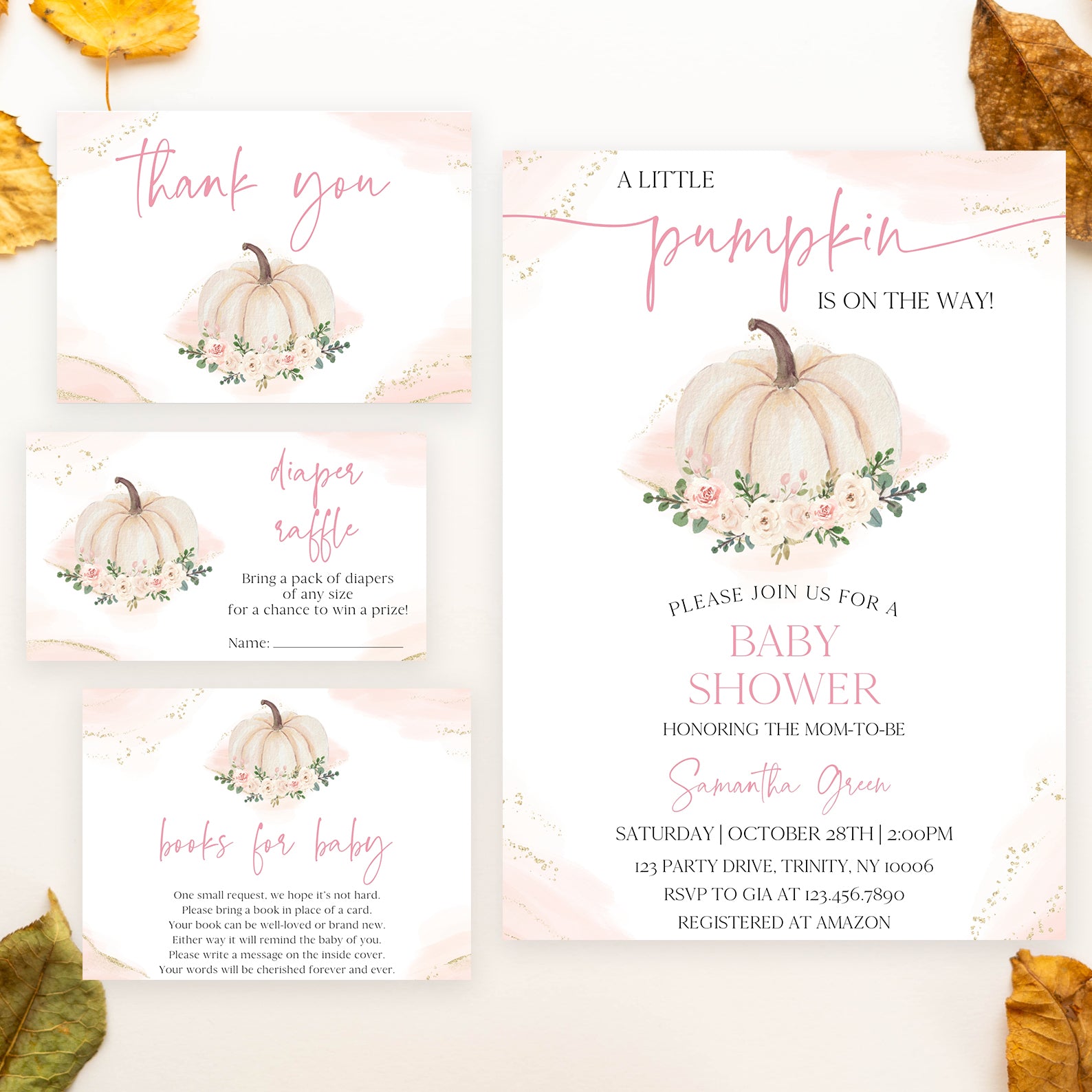 Welcome your little one with our 'A Little Pumpkin' Fall Baby Shower Bundle. This set includes a digital invitation, mobile invite, diaper raffle, books for baby, and thank you card, all featuring whimsical watercolor pumpkins, soft roses, green leaves, and gold sparkles. Perfect for a pink-themed autumn celebration!