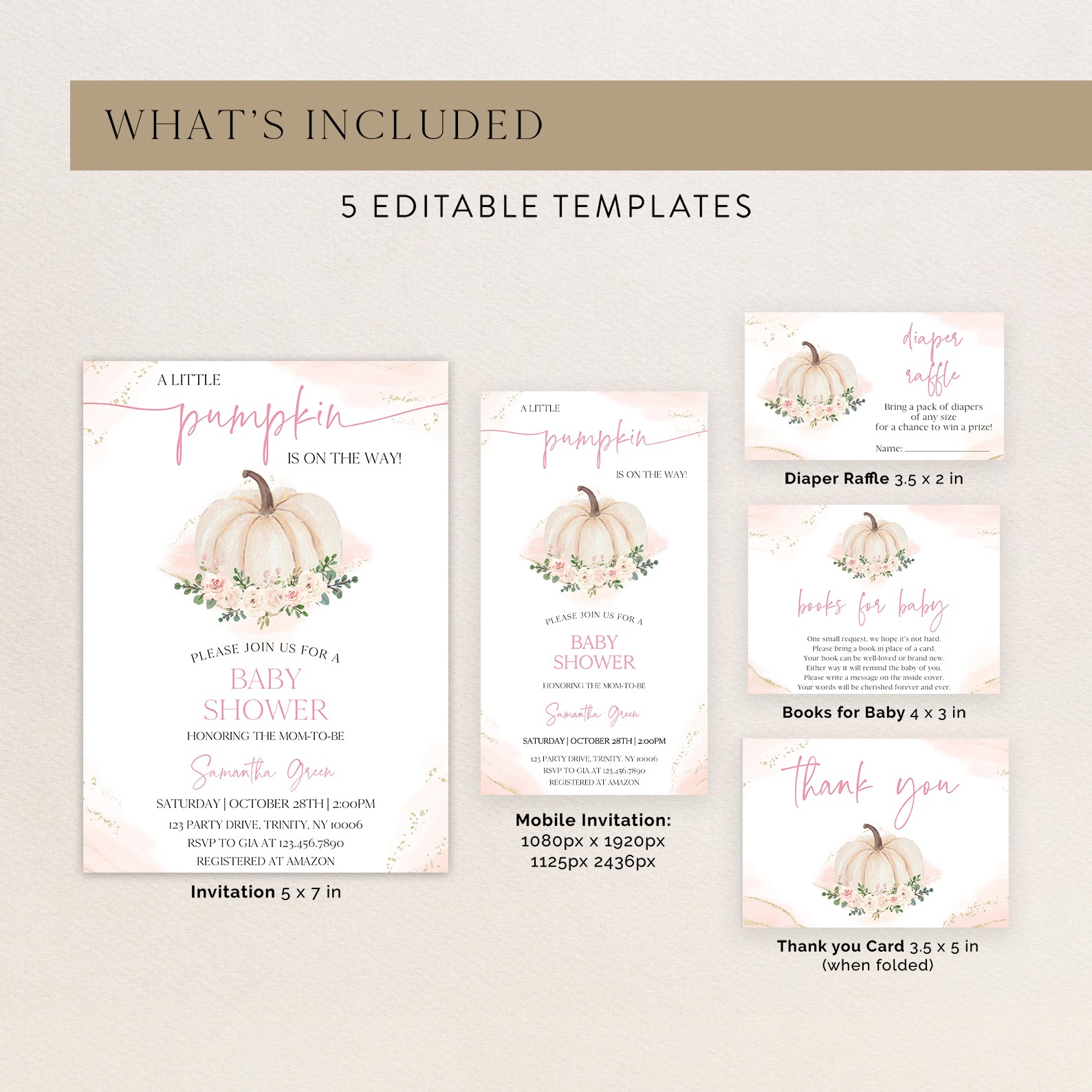 - Purchase this A Little Pumpkin Pink Fall Baby Shower Invite Bundle with Roses & Gold template