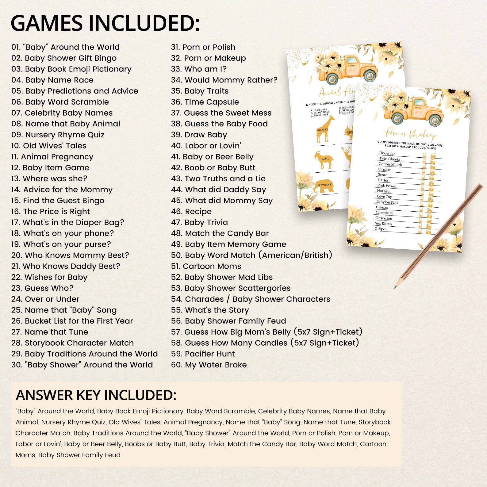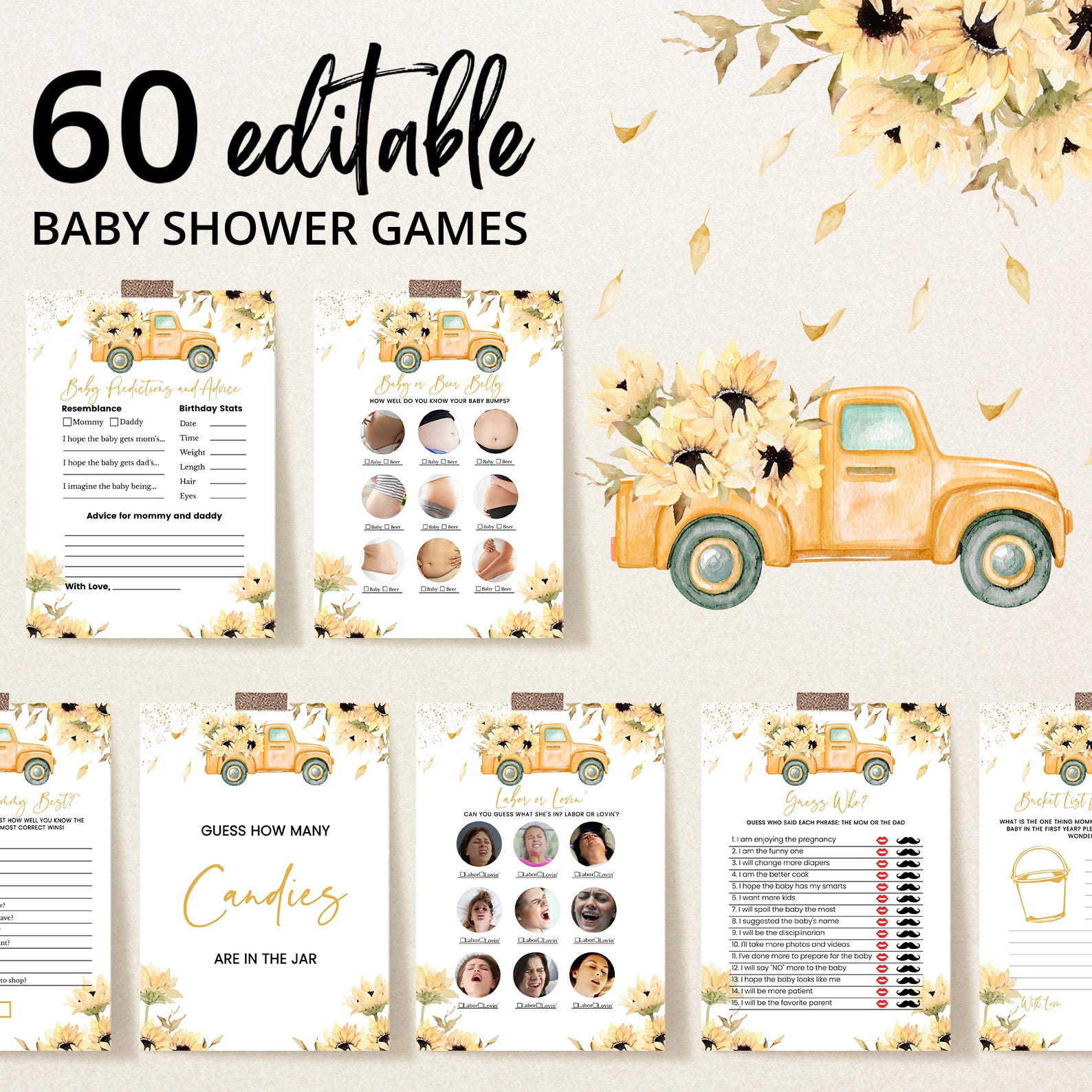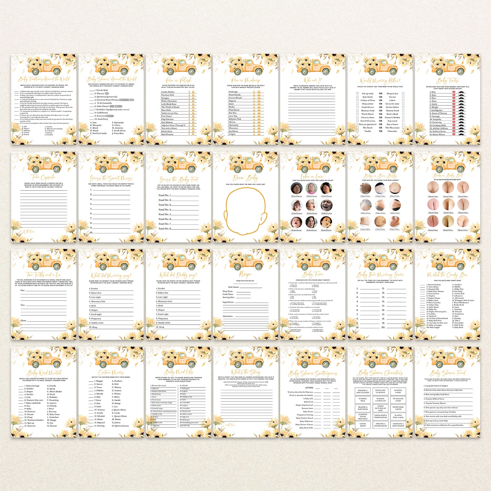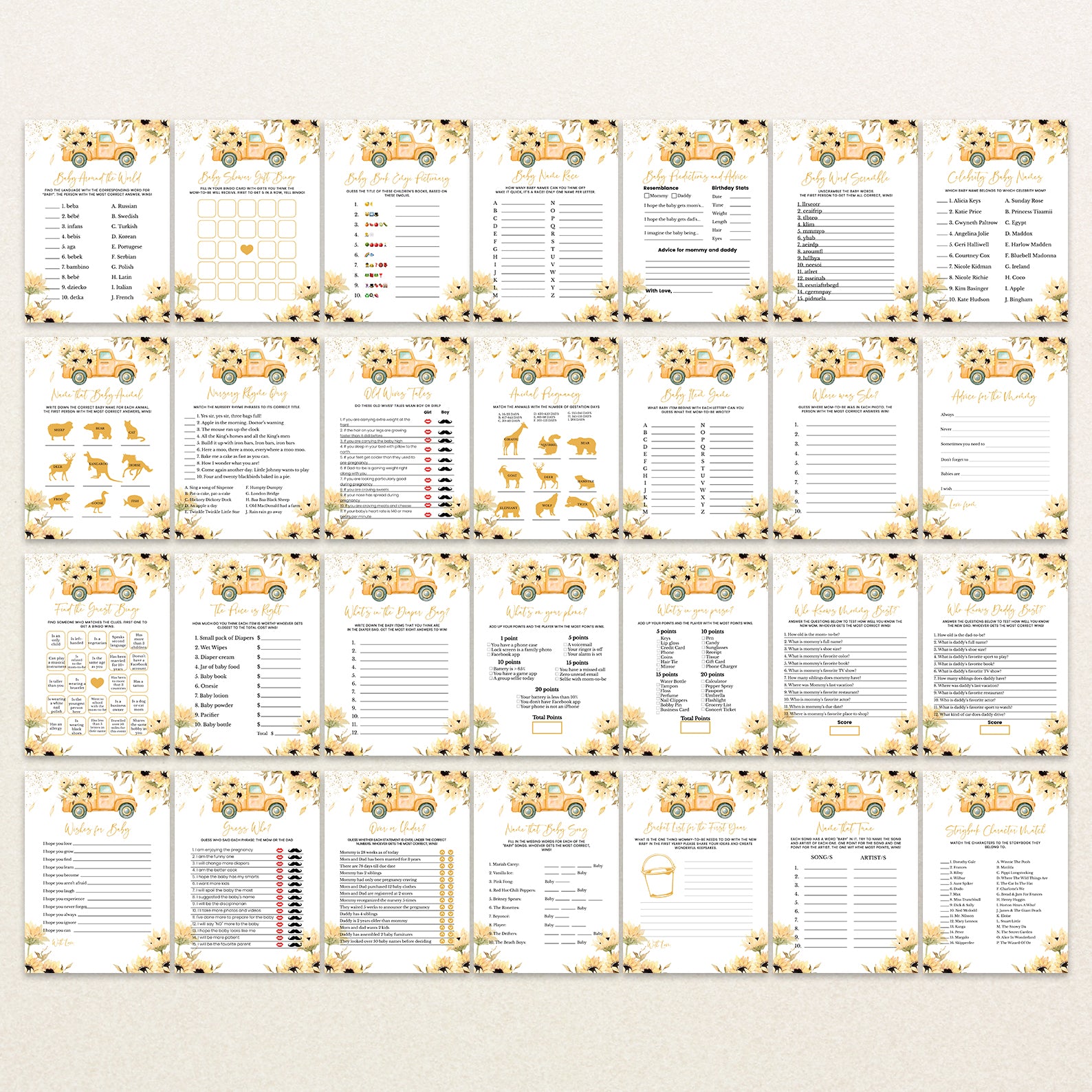 Add laughter and fun to your baby shower with this sunflower-themed game bundle featuring 60 editable baby shower games! Designed with a sunny yellow palette, playful gold accents, and watercolor sunflowers, each game coordinates perfectly with a cozy fall celebration. From crowd-pleasers like Baby Bingo and Who Knows Mommy Best to creative games like Don’t Say Baby and Nursery Rhyme Quiz, this bundle has everything you need to entertain your guests in style.