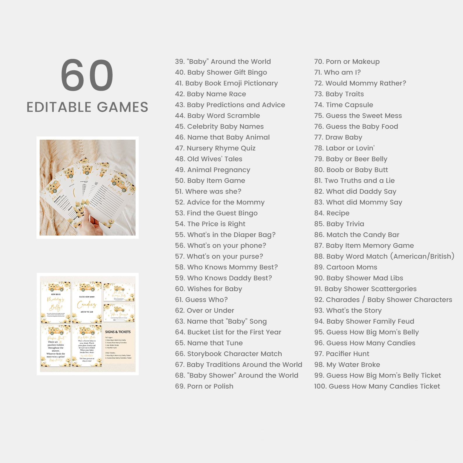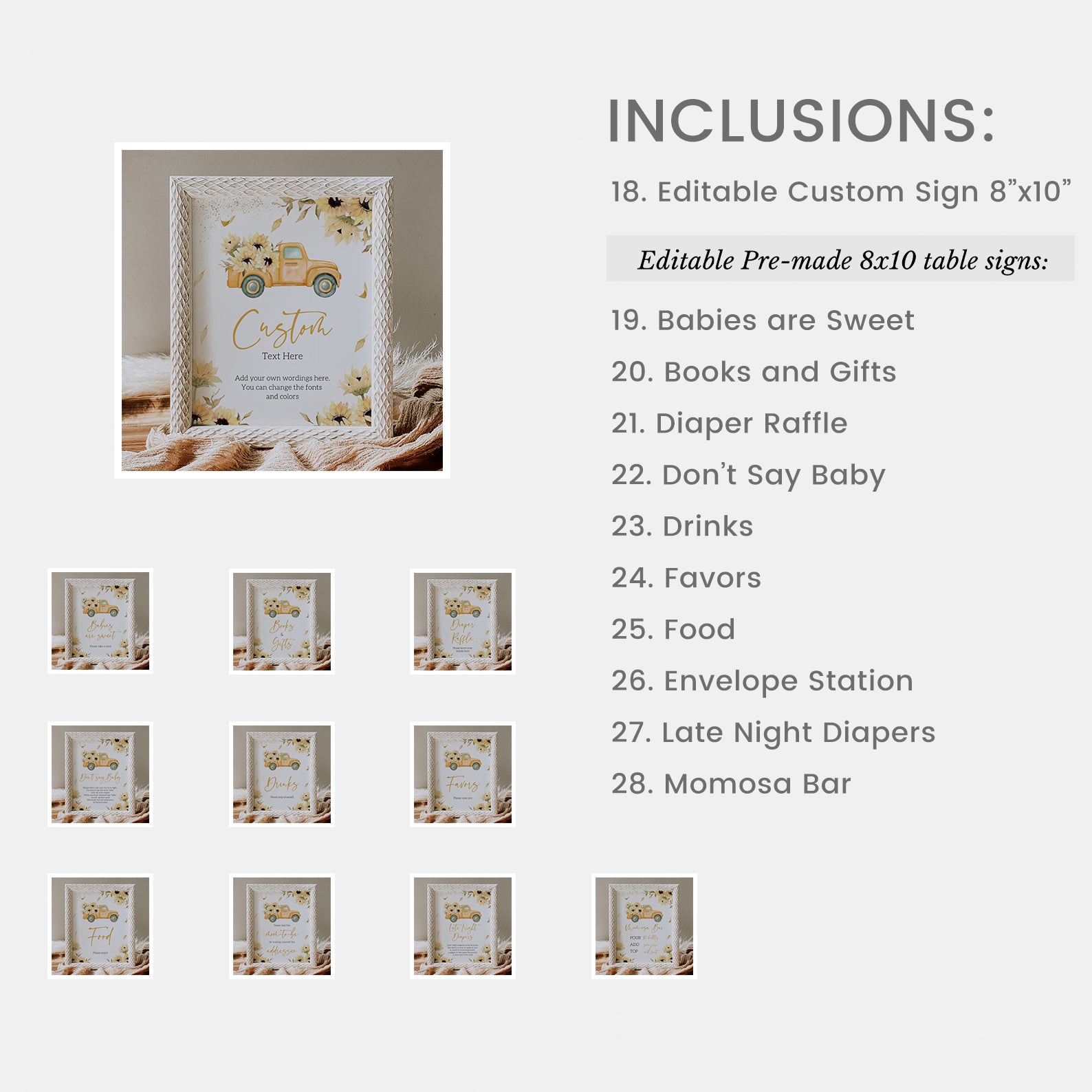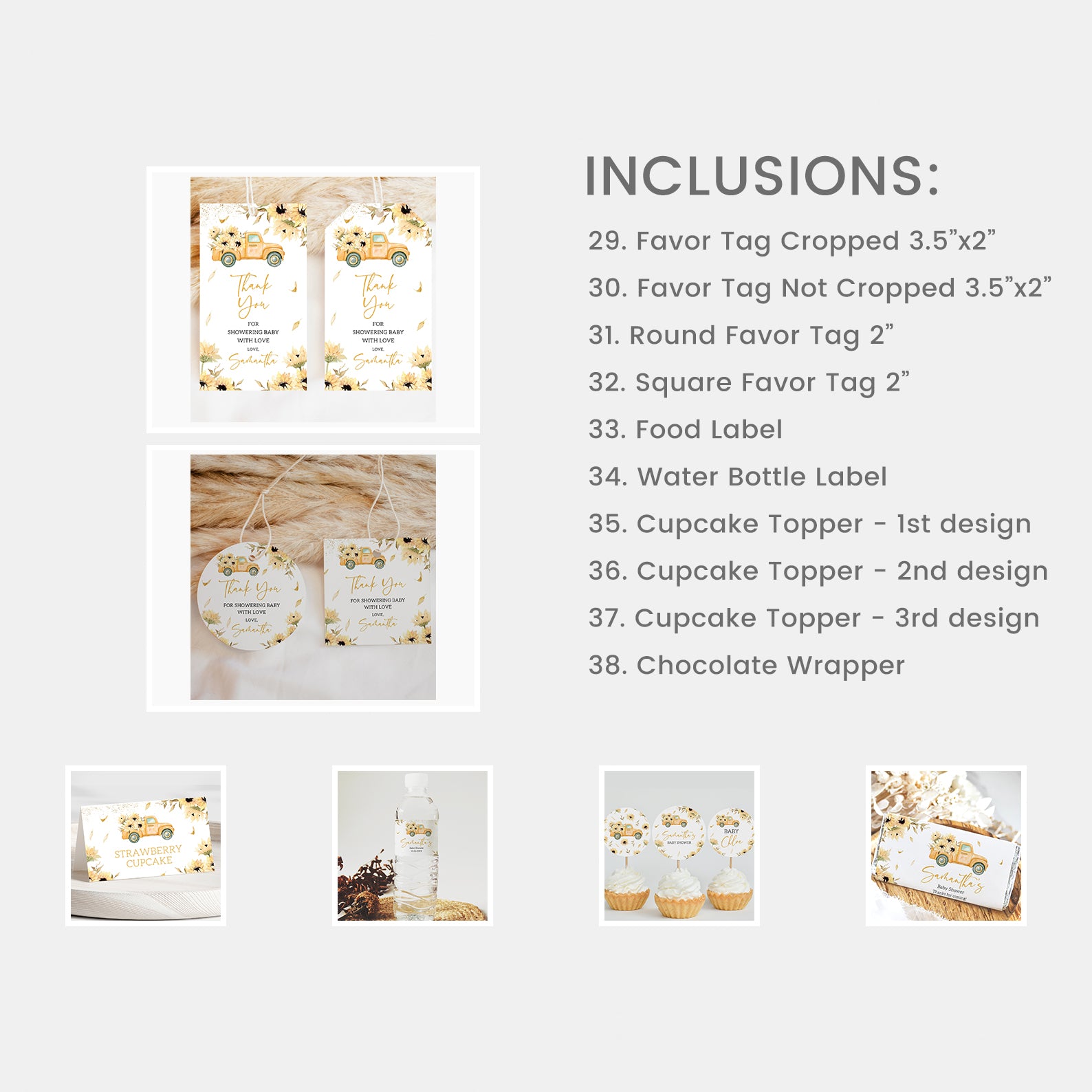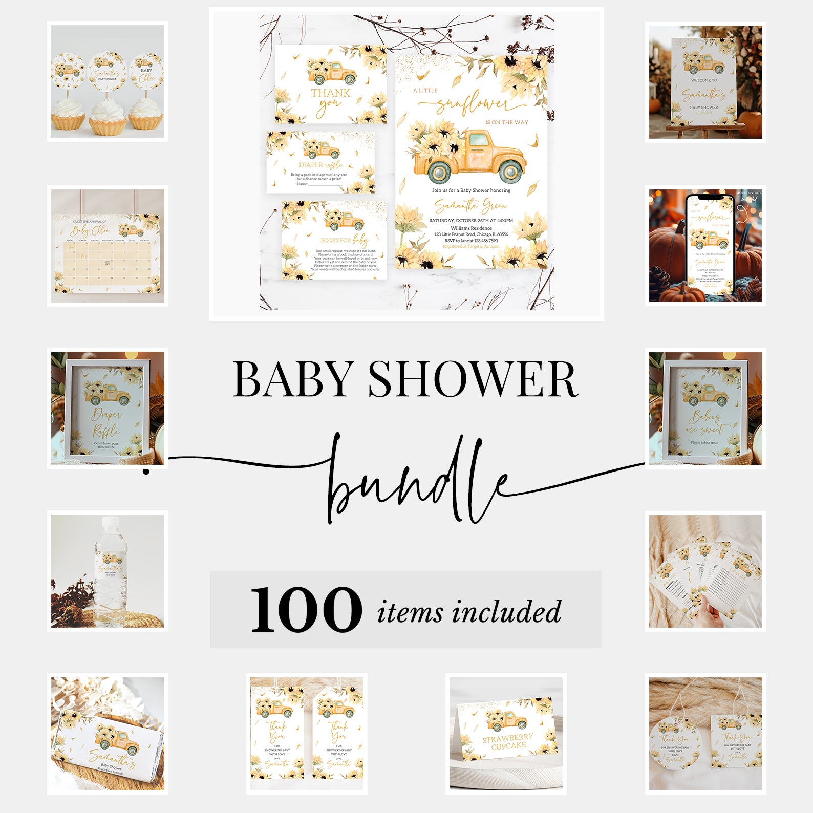 Celebrate your little one with this all-in-one fall baby shower mega bundle featuring 100 matching items! Designed in a sunny yellow theme with gold accents and cheerful watercolor sunflowers, this bundle includes everything you need from invitations (with back design and mobile version), diaper raffle cards, books for baby, and thank you cards to welcome signs, table signs, favor tags, food and drink labels, cupcake toppers, chocolate wrappers, and 60 editable baby shower games. Perfectly coordinated for a warm and joyful sunflower-themed celebration!