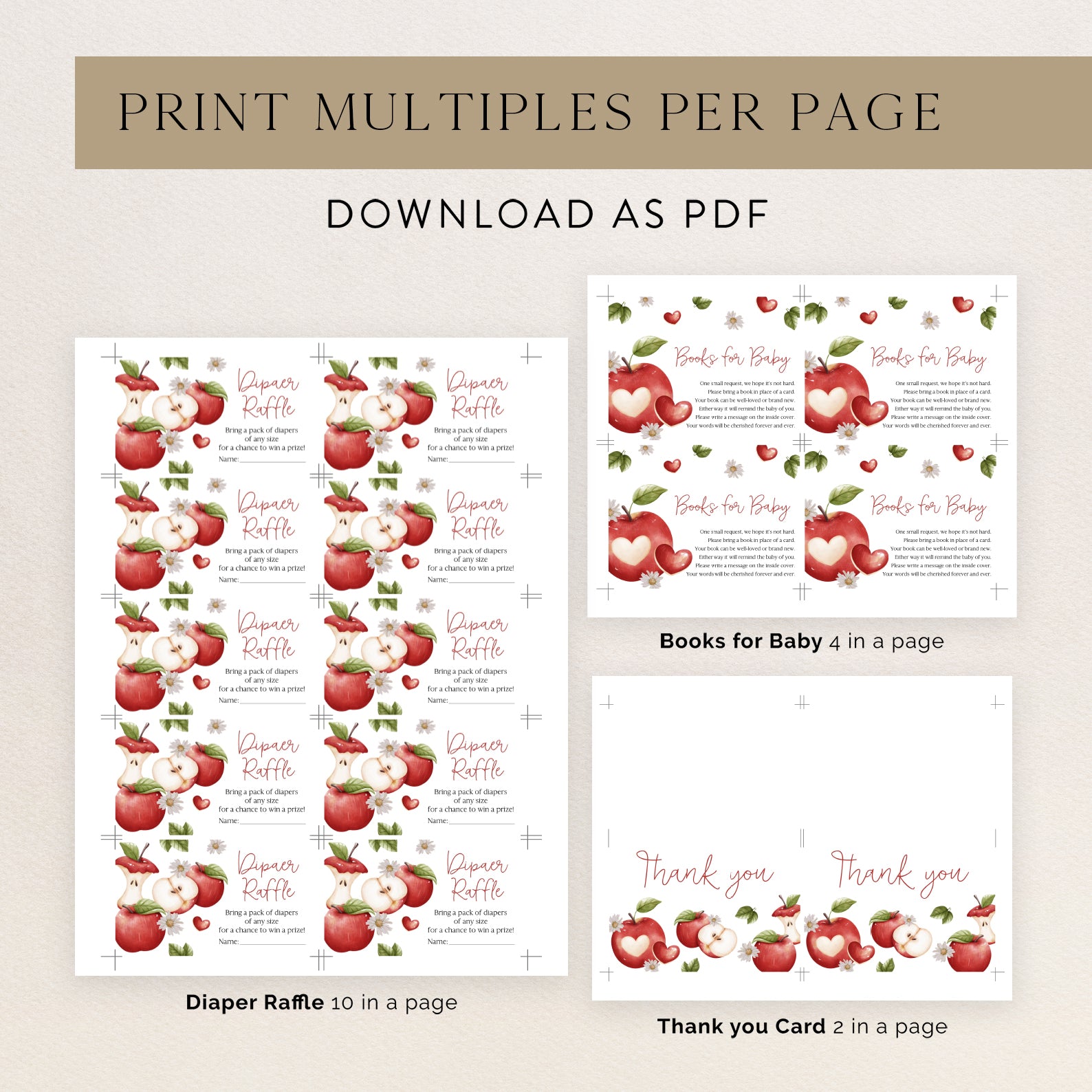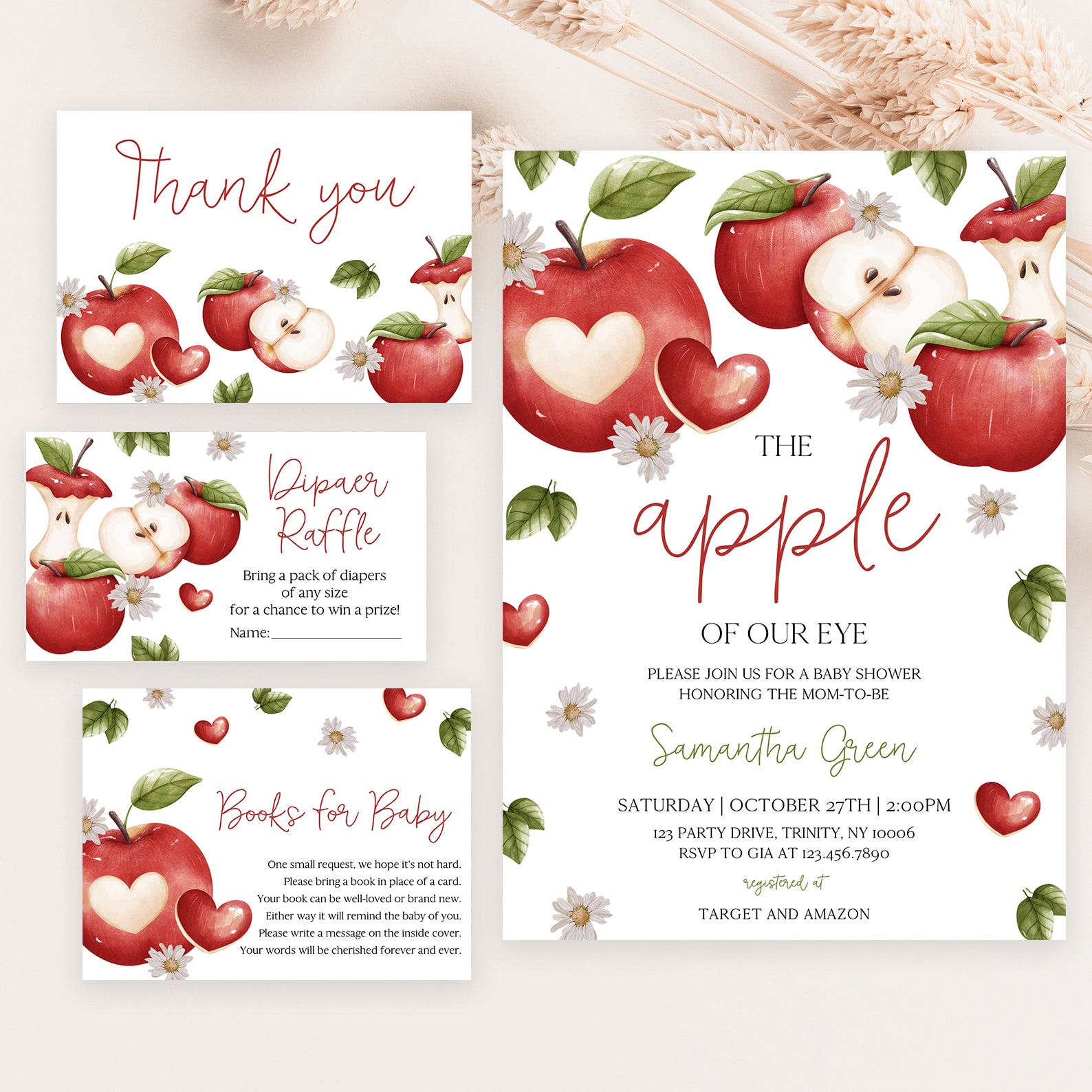 Celebrate your little one's arrival with our "Apple of Our Eye" fall baby shower invitation bundle. Featuring vibrant red apples, white daisies, and falling autumn leaves, this set includes an invitation, mobile invite, diaper raffle, books for baby card, and thank you card. Capture the essence of fall and create a memorable event with this charming, customizable design.