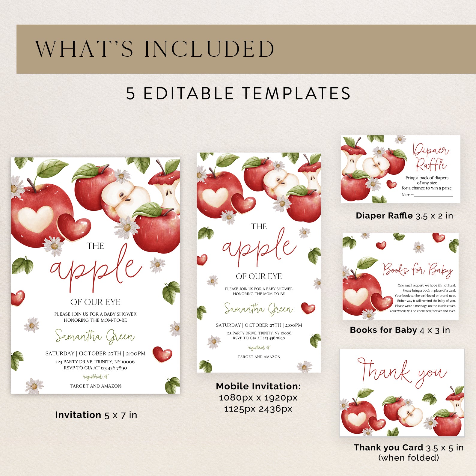- Purchase this Apple of Our Eye Fall Baby Shower Invite Bundle with Daisies & Leaves template