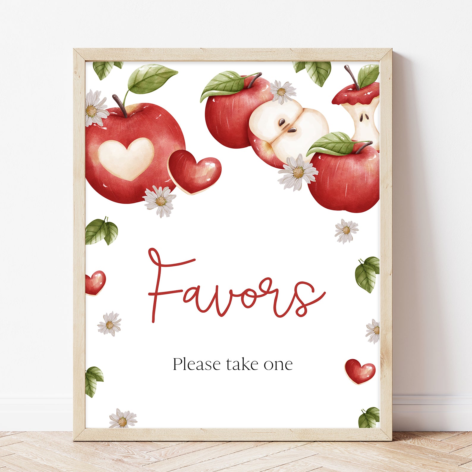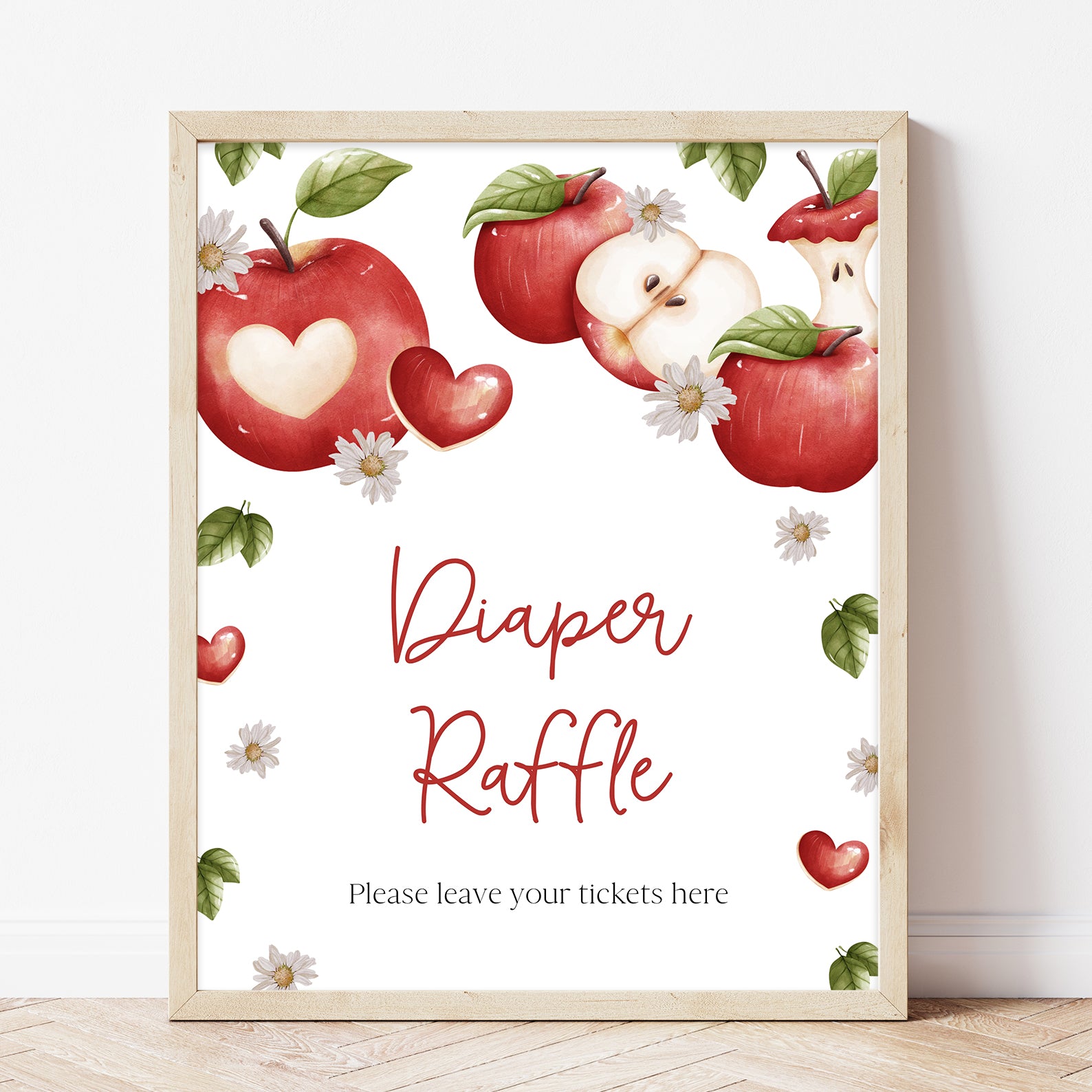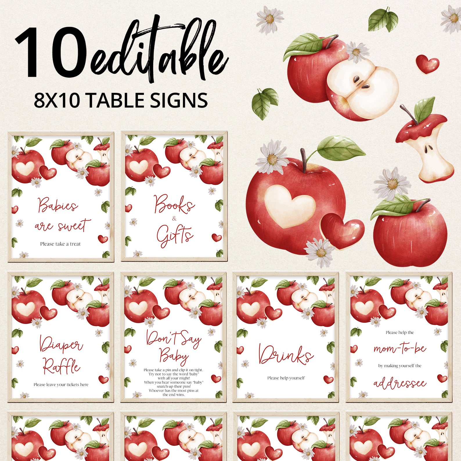 Add a fresh, seasonal touch to your baby shower with this set of 10 editable table signs, designed to match the charming “Apple of Our Eye” theme. Each sign features vibrant red apples paired with dainty white daisies, surrounded by softly falling autumn leaves in warm tones. The cozy, rustic design is perfect for fall celebrations and includes: Babies Are Sweet, Books and Gifts, Diaper Raffle, Don’t Say Baby, Drinks, Envelope Station, Favors, Food, Late Night Diapers, and Mom-osa Bar.