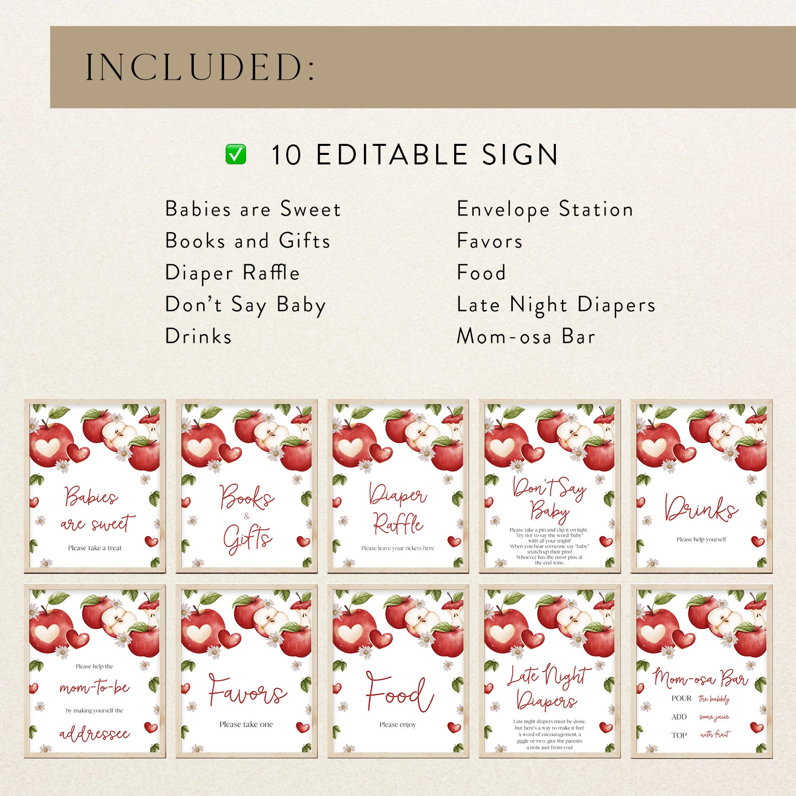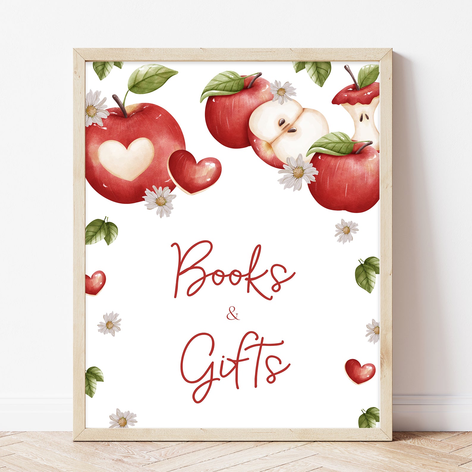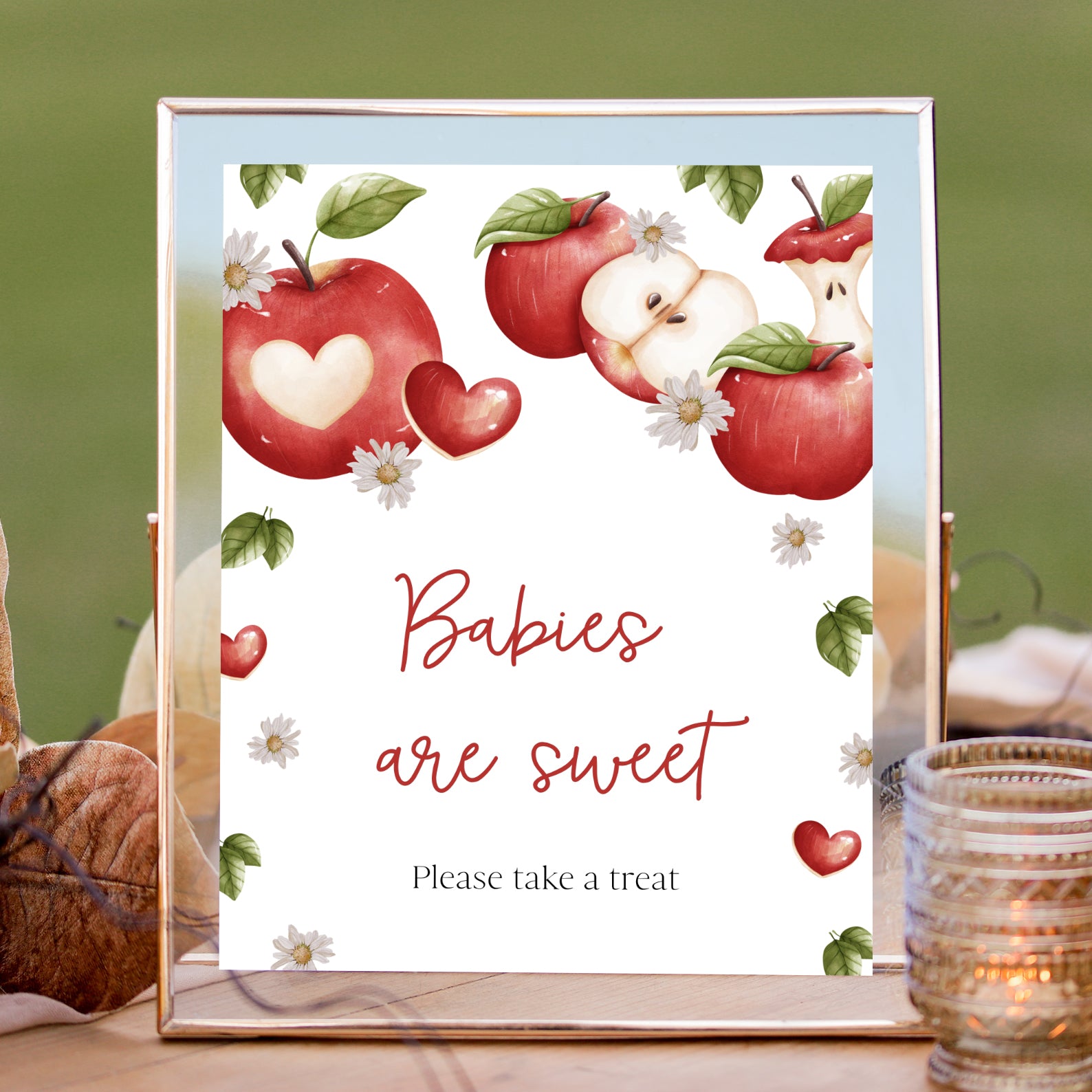 Add a fresh, seasonal touch to your baby shower with this set of 10 editable table signs, designed to match the charming “Apple of Our Eye” theme. Each sign features vibrant red apples paired with dainty white daisies, surrounded by softly falling autumn leaves in warm tones. The cozy, rustic design is perfect for fall celebrations and includes: Babies Are Sweet, Books and Gifts, Diaper Raffle, Don’t Say Baby, Drinks, Envelope Station, Favors, Food, Late Night Diapers, and Mom-osa Bar.