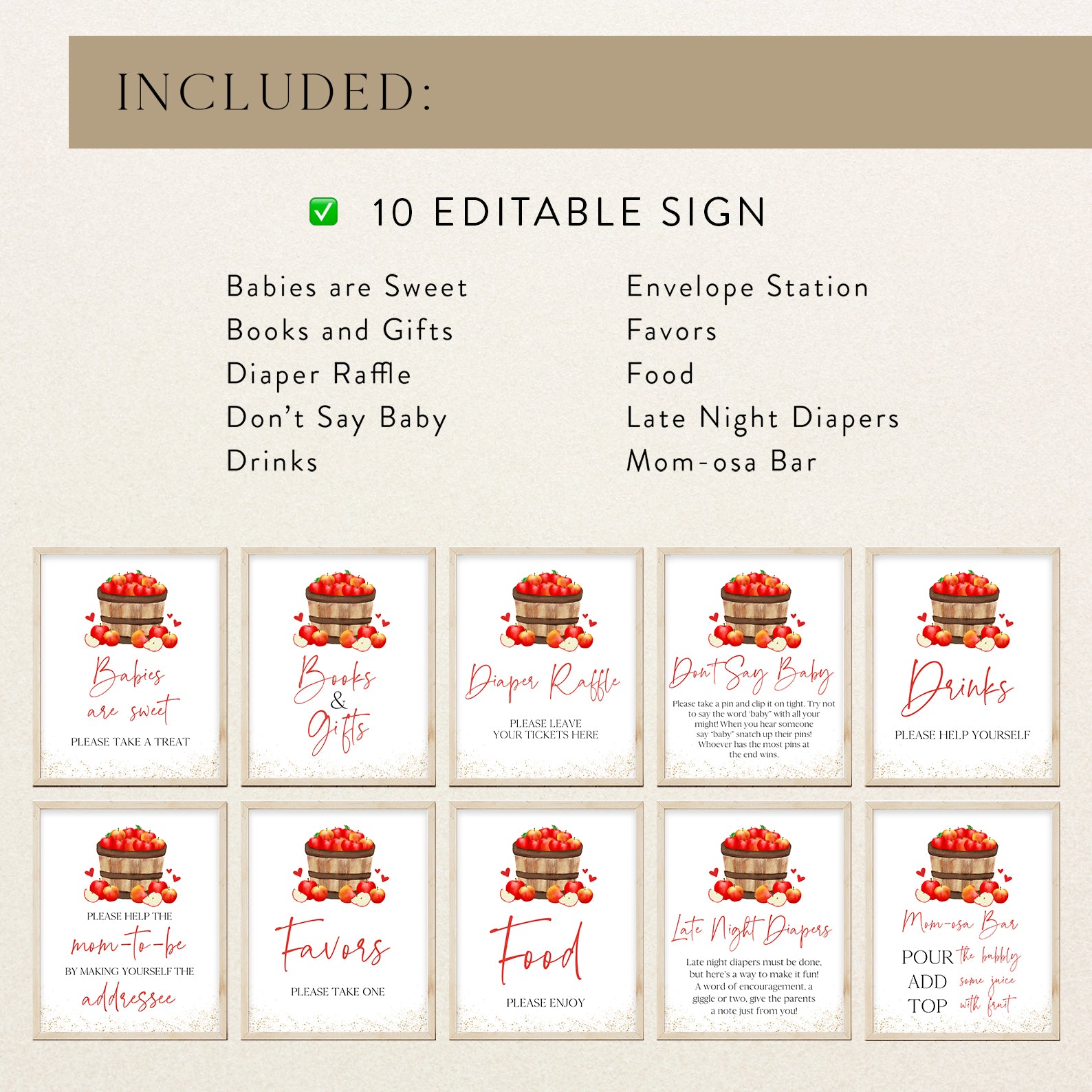 Add a charming touch to your fall baby shower with our editable table sign set, featuring ten coordinated designs. Each sign showcases a rustic wood barrel with soft watercolor apples and gold-accented leaves, bringing seasonal warmth to your setup. From “Babies Are Sweet” to “Mom-osa Bar,” these signs are both practical and stylish. Perfect for guiding guests through your celebration while complementing your cozy, apple-themed décor.