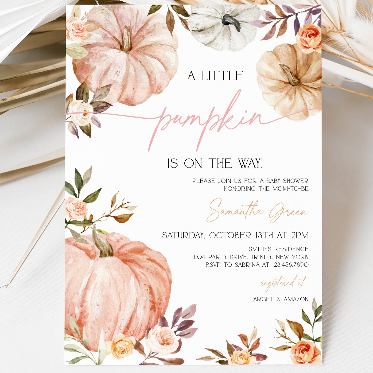 - Purchase this Autumn Baby Shower Digital Invite: Pumpkin & Floral Design template