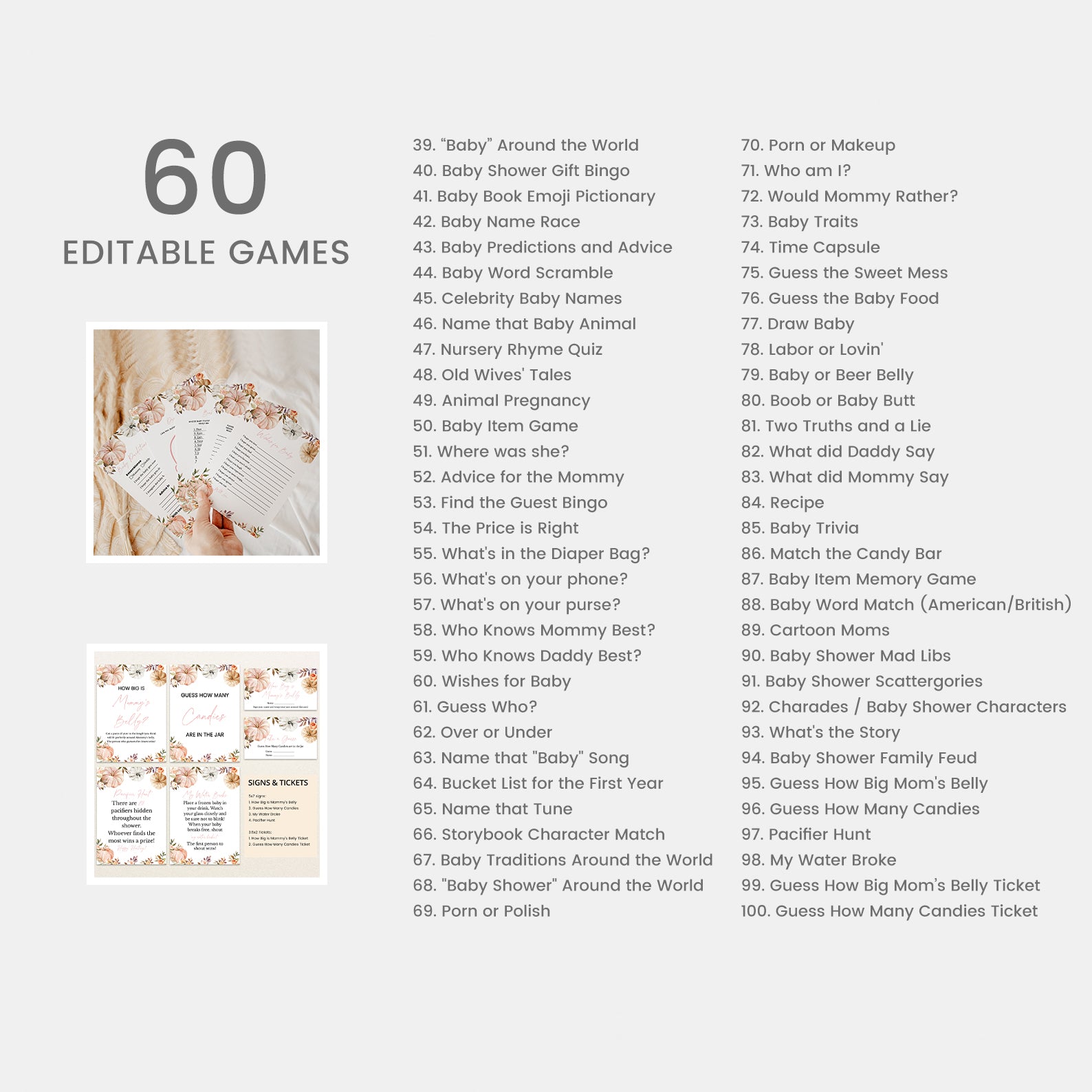 Celebrate your autumn baby shower in style with this all-in-one Mega Bundle featuring 100 beautifully coordinated digital items! From invitations and thank you cards to decor like welcome signs, table signs, favor tags, and themed food labels. Everything is adorned with soft watercolor pumpkins and pink-orange florals. Includes 60 editable games and matching party essentials like cupcake toppers and wrappers. Easy to personalize and perfect for hosting a cozy and unforgettable fall celebration!
