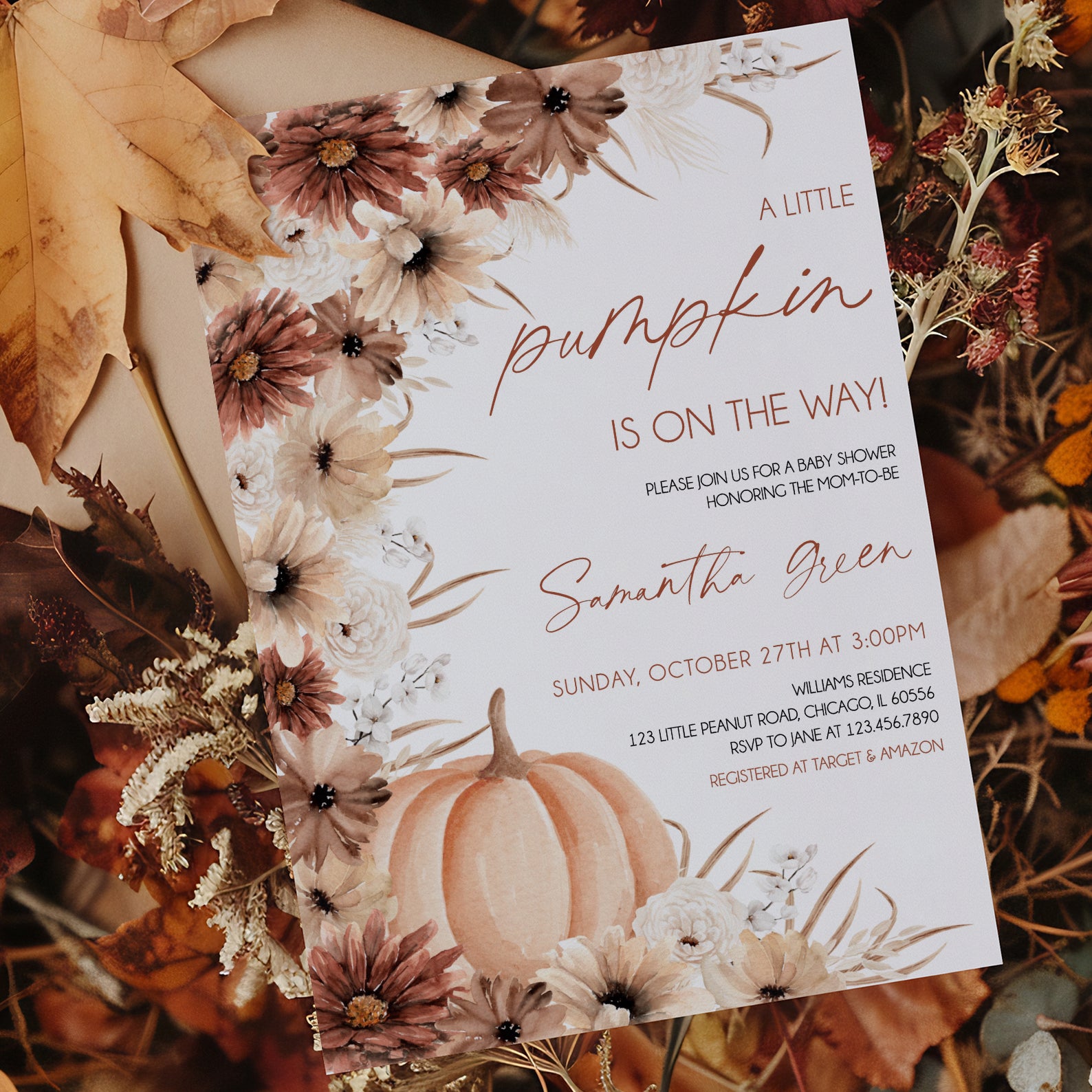 - Purchase this Autumn Baby Shower Invite with Aster Flowers & Pumpkin template