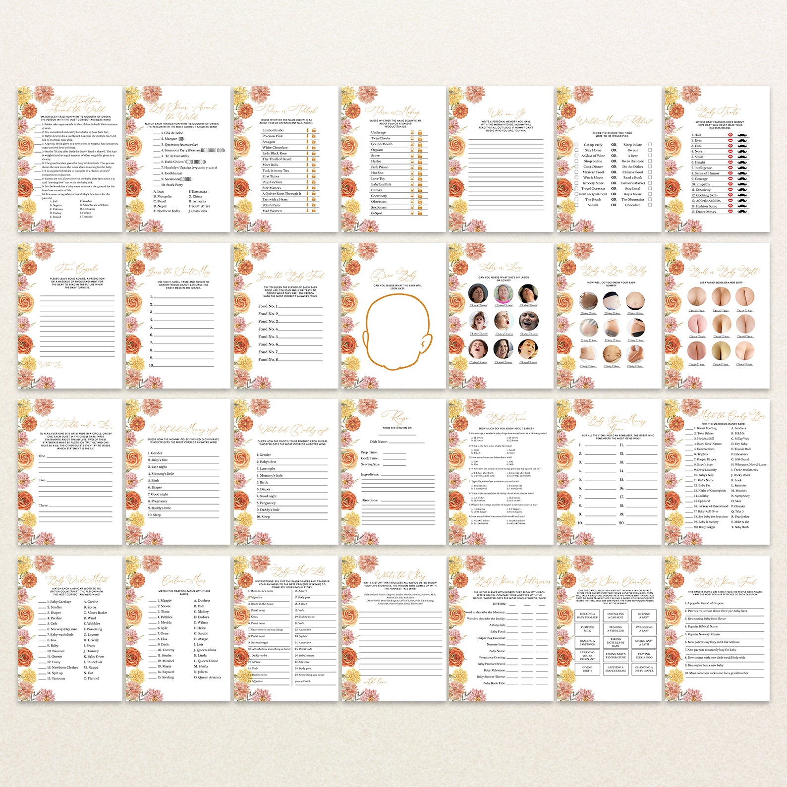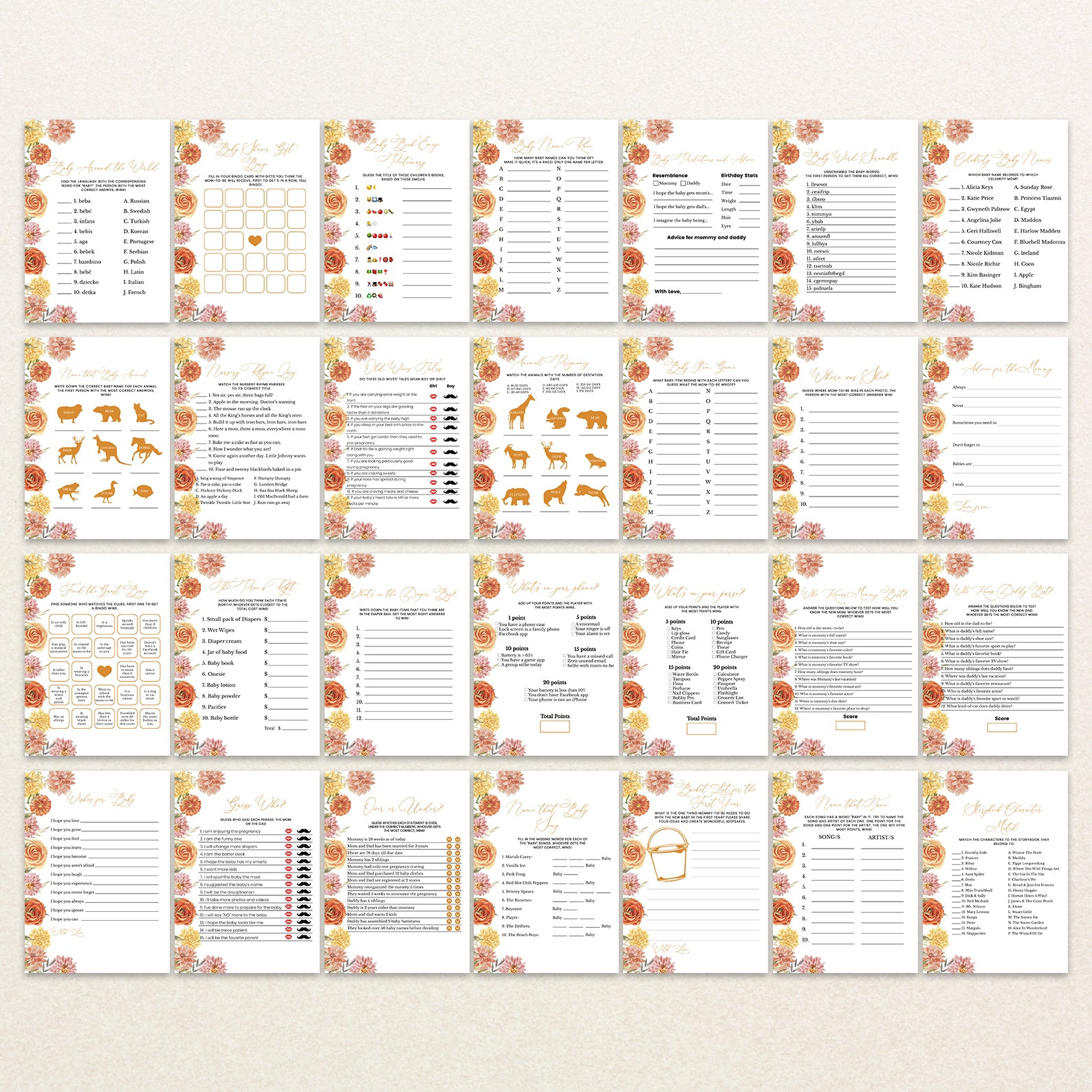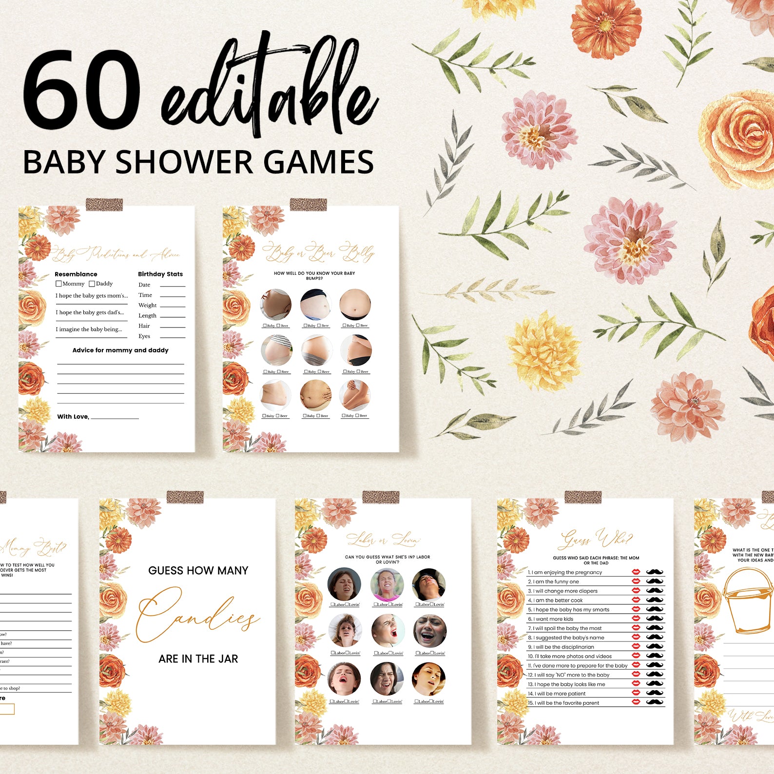 Add fun and floral flair to your baby shower with this beautiful bundle of 60 editable games, designed to match a “Baby in Bloom” fall theme. Each game features cascading orange, yellow, and pink blooms paired with soft green autumn leaves, creating a vibrant and elegant touch. From crowd favorites like Baby Bingo to fun icebreakers like Don’t Say Baby, this collection keeps guests entertained while complementing your seasonal celebration.