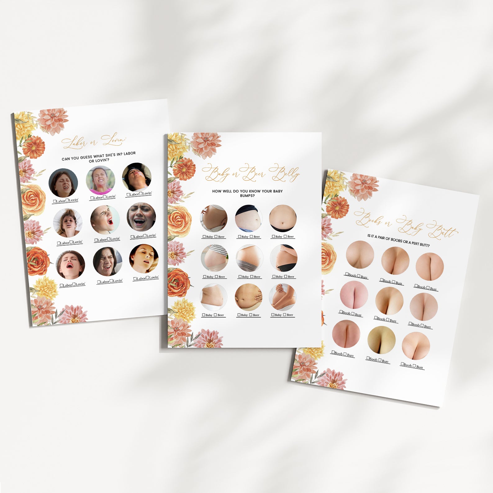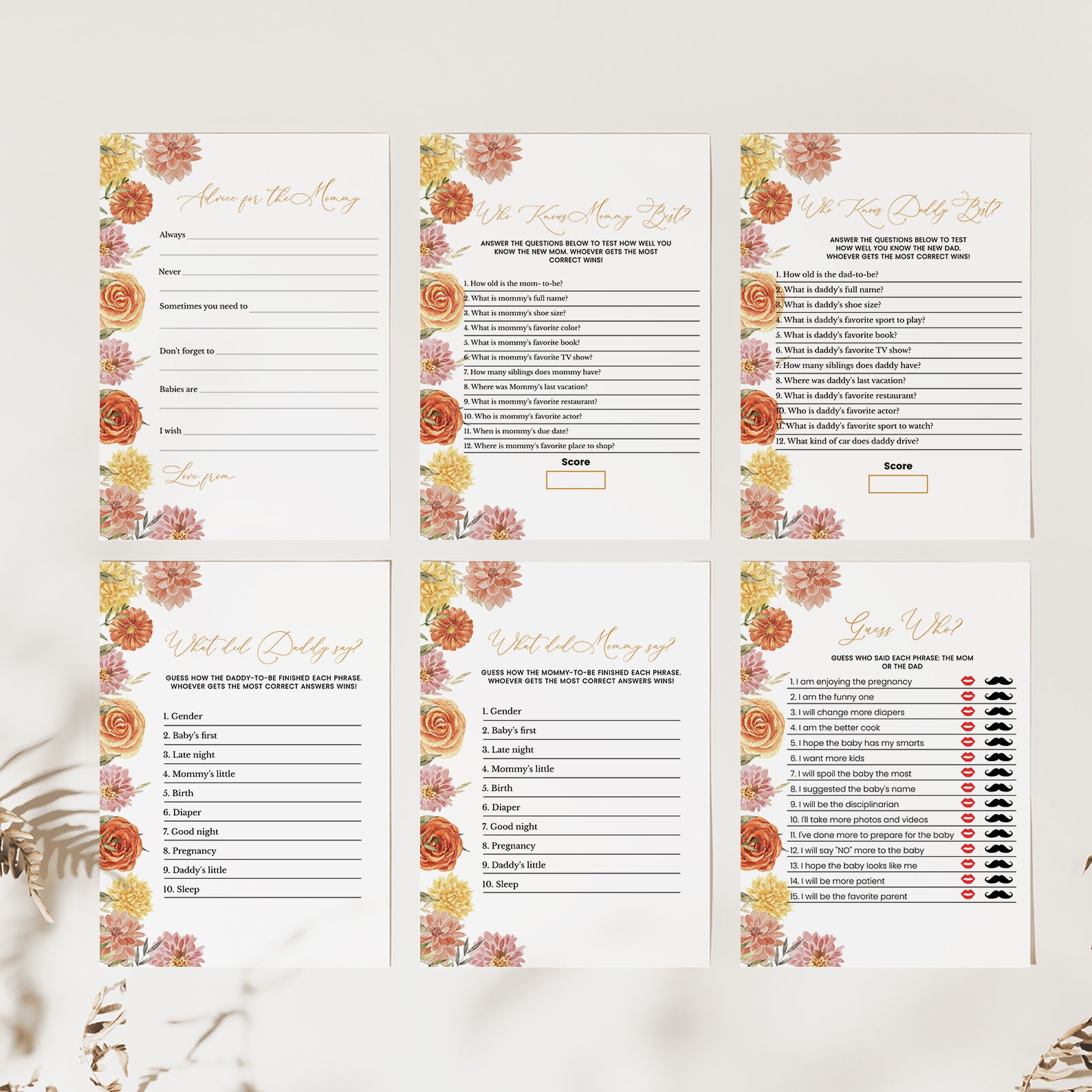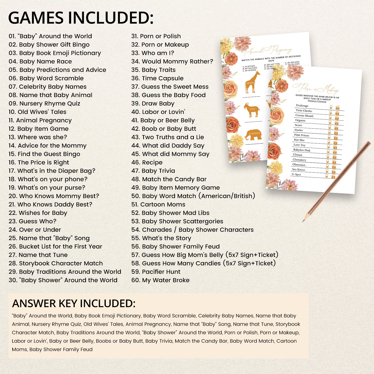 Add fun and floral flair to your baby shower with this beautiful bundle of 60 editable games, designed to match a “Baby in Bloom” fall theme. Each game features cascading orange, yellow, and pink blooms paired with soft green autumn leaves, creating a vibrant and elegant touch. From crowd favorites like Baby Bingo to fun icebreakers like Don’t Say Baby, this collection keeps guests entertained while complementing your seasonal celebration.