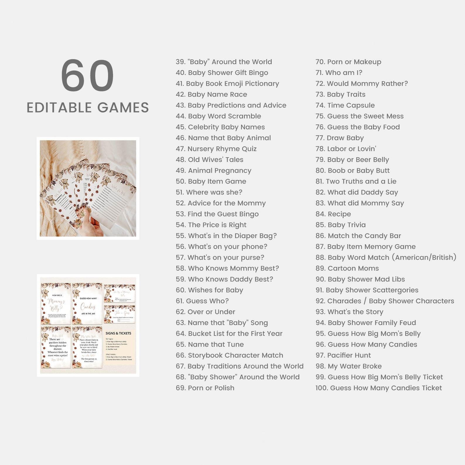 Celebrate the upcoming arrival of your little one with this comprehensive Fall Baby Shower Mega Bundle, featuring 100 editable items to create a cohesive and charming event. Highlighted by an adorable teddy bear clutching whimsical brown balloons, the design is enriched with vibrant autumn flowers and a scattering of pumpkins, leaves, and blooms. From invitations and thank you cards to favor tags and editable games, every piece brings seasonal warmth and festive elegance to your special celebration.