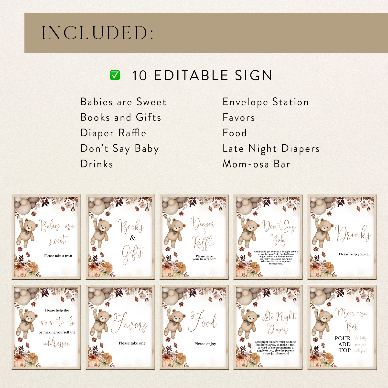 Set a warm and inviting atmosphere with this set of ten editable table signs, perfectly designed to complement your fall baby shower. Each sign features charming autumn elements like vibrant pumpkins, colorful leaves, and cozy florals, paired with playful fonts. Labels include “Babies Are Sweet,” “Diaper Raffle,” and “Mom-osa Bar,” guiding your guests seamlessly while adding seasonal charm and festive flair to your celebration.