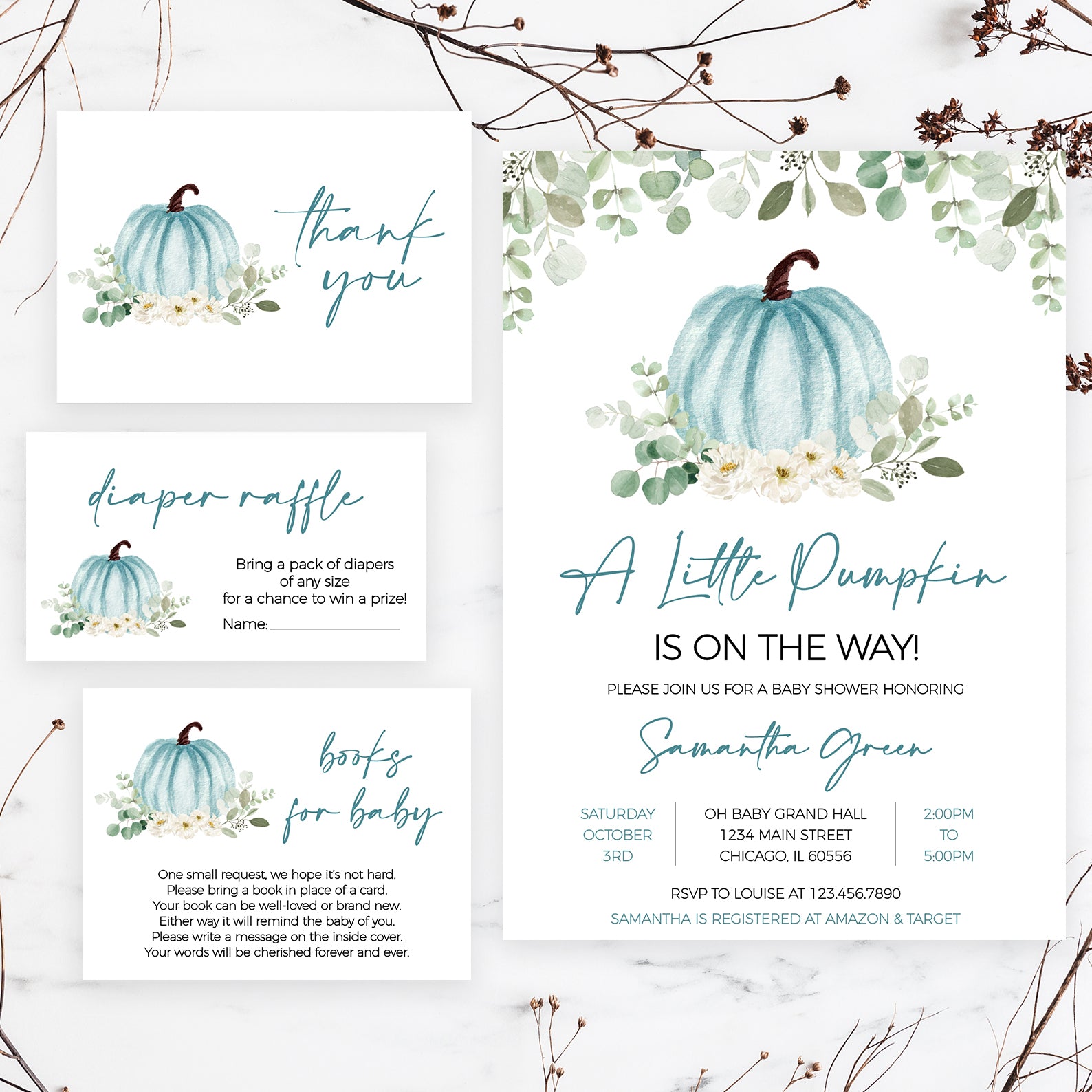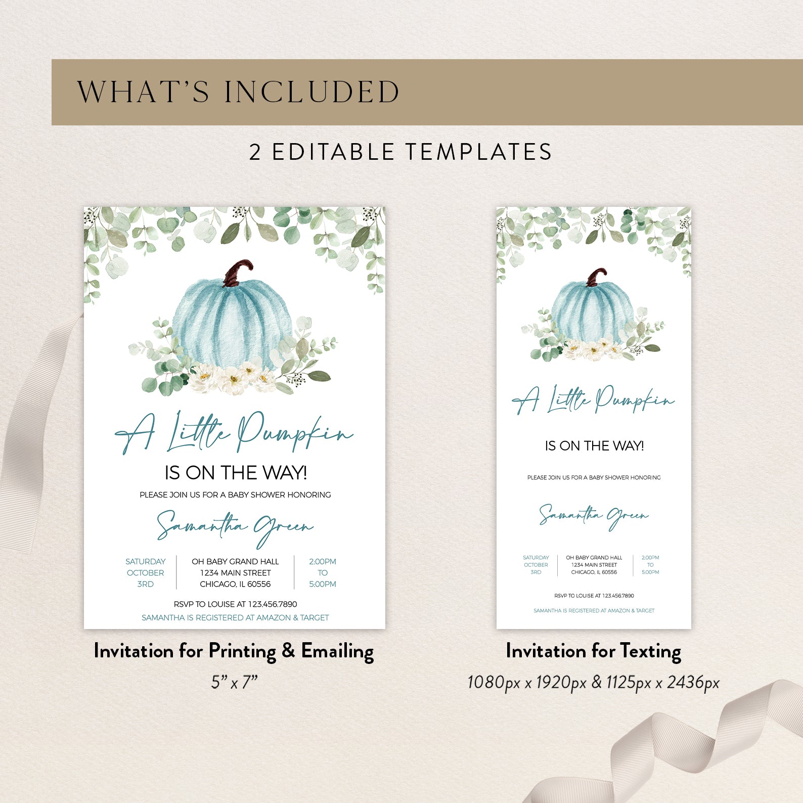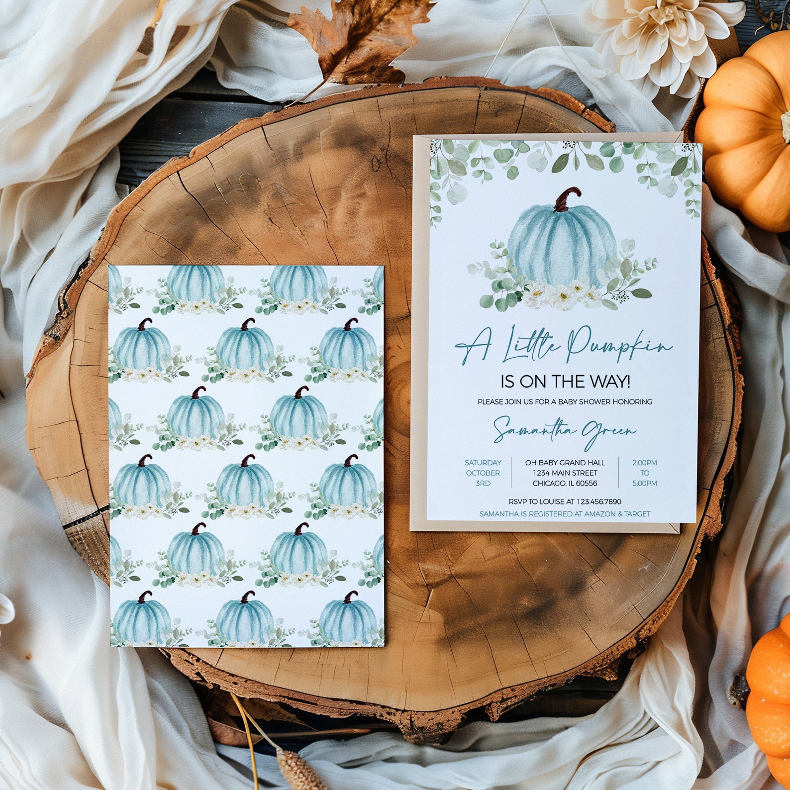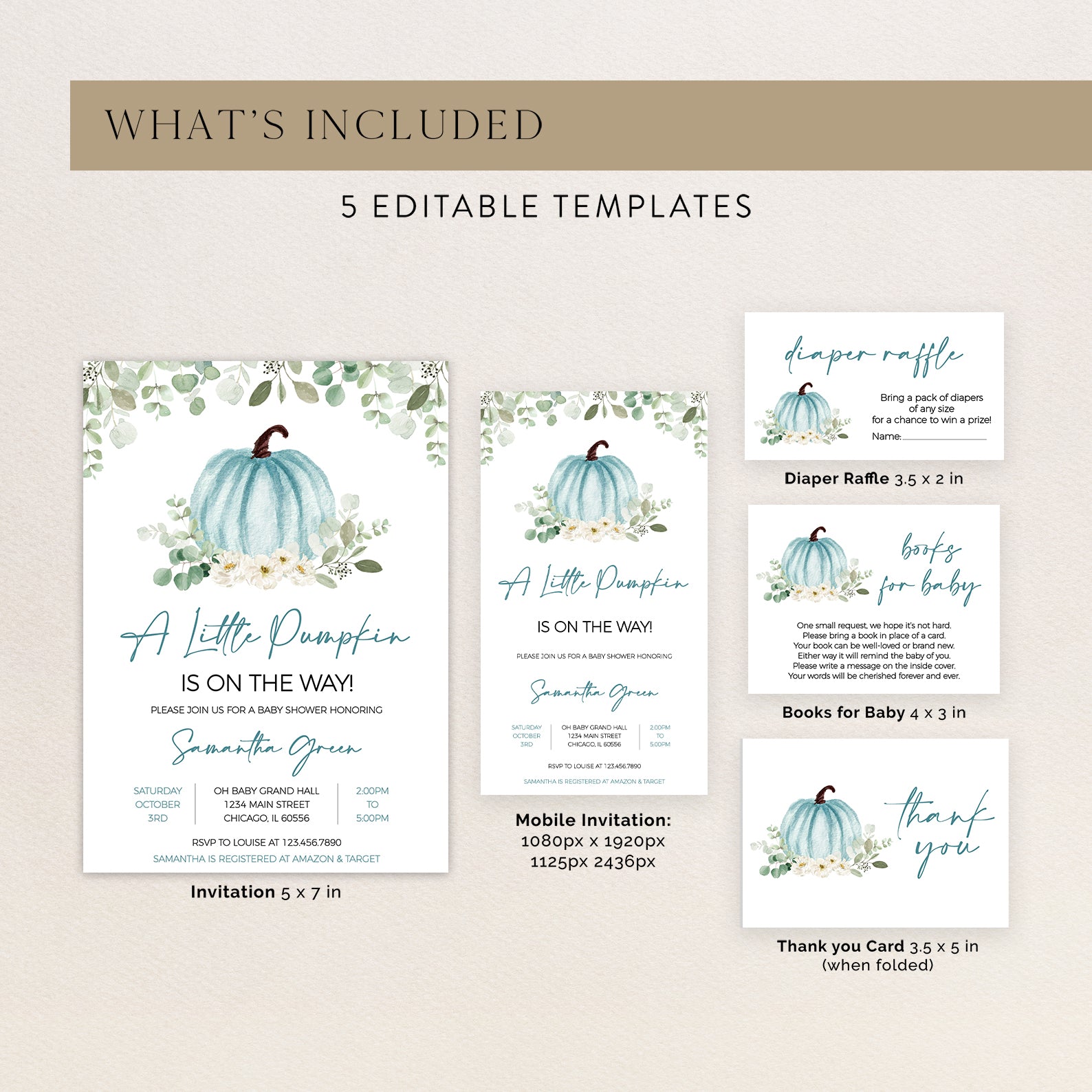 - Purchase this Blue-Green Little Pumpkin Baby Shower Invite Bundle Fall Theme template
