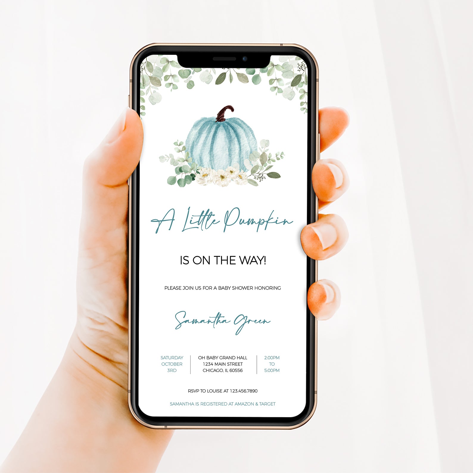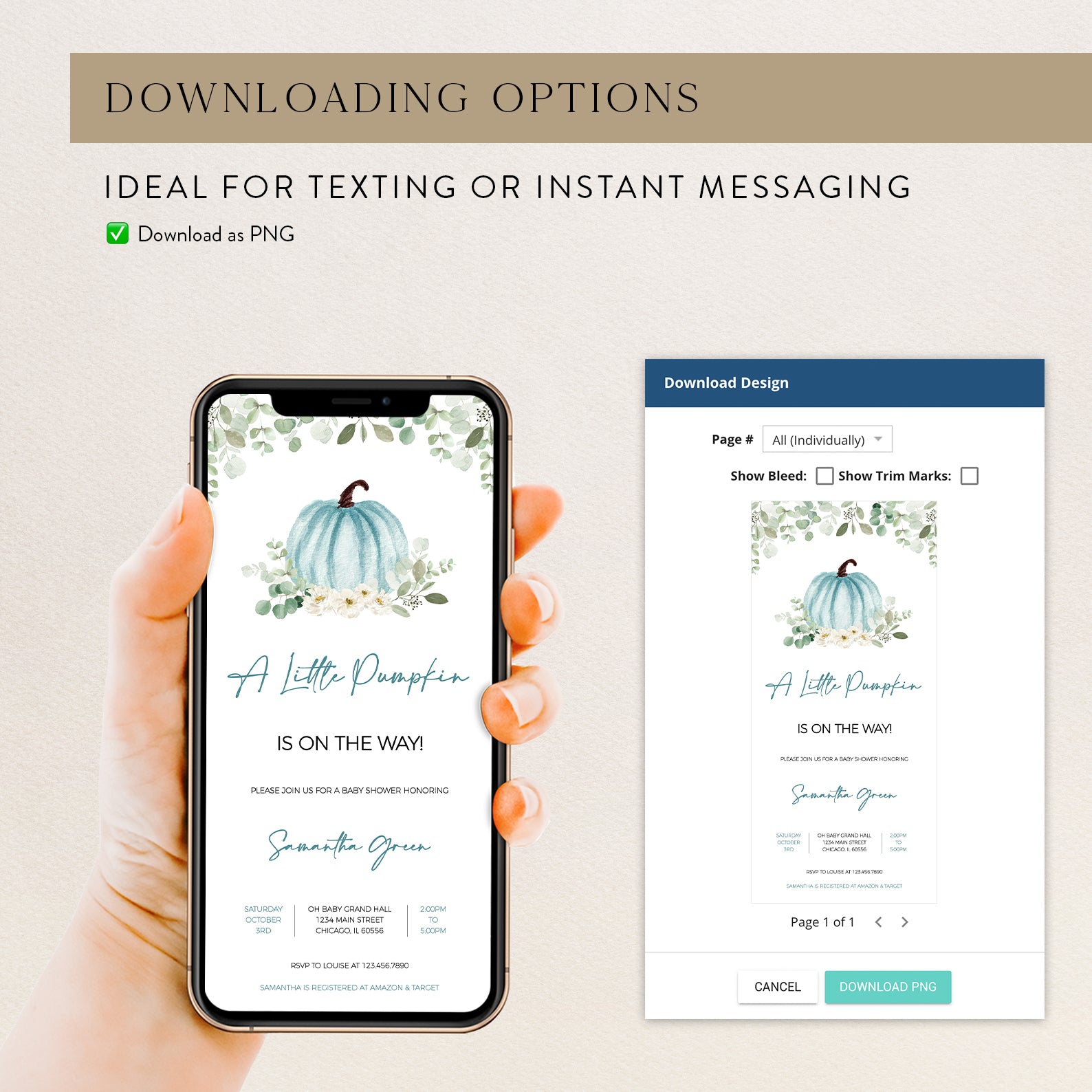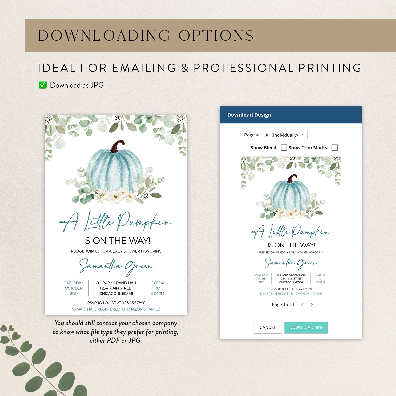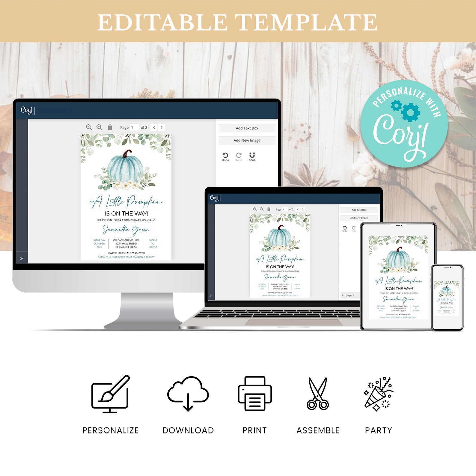 - Purchase this Blue-Green Little Pumpkin Baby Shower Invite Bundle Fall Theme template