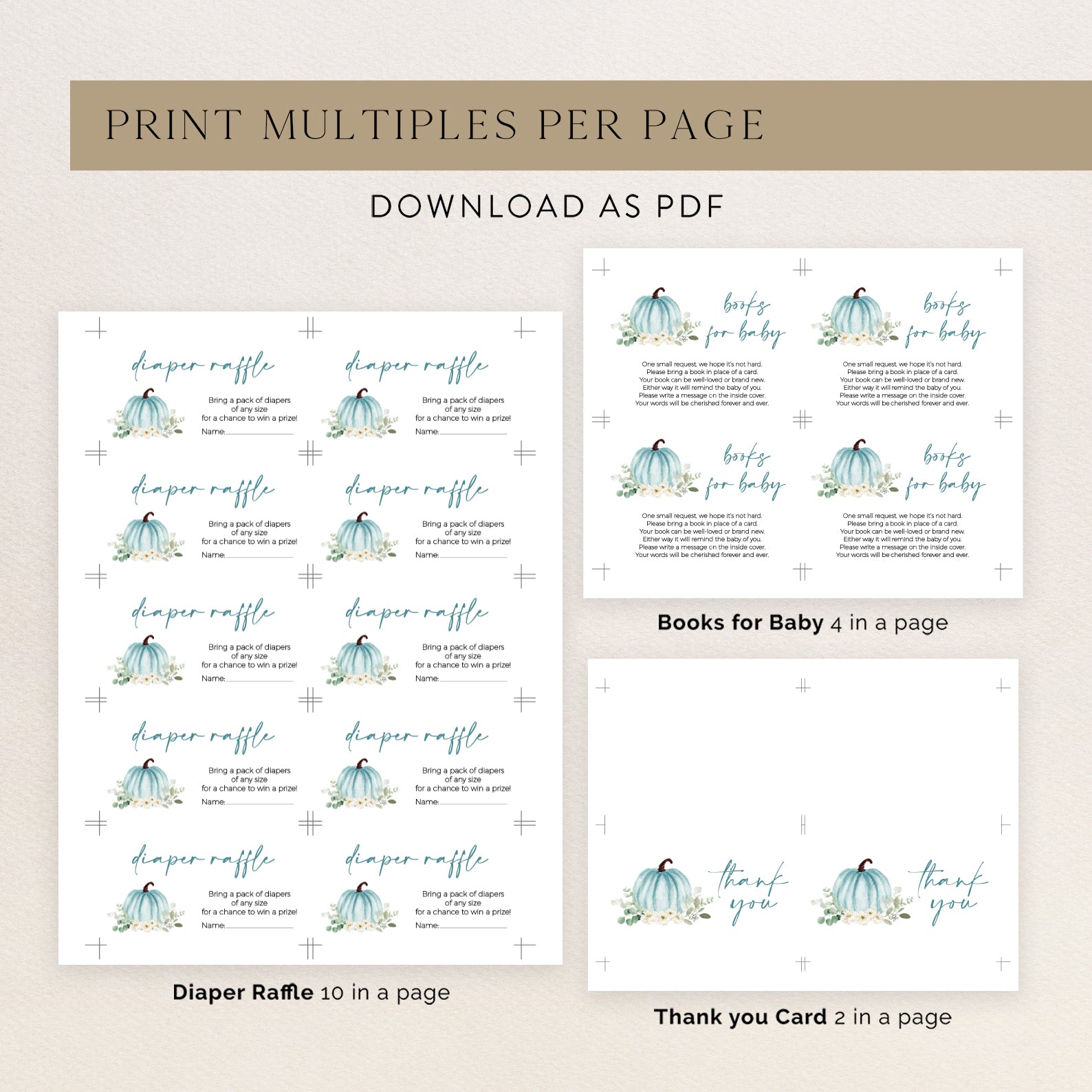 Welcome your little one with our Fall Baby Shower Invitation Bundle, featuring a blue-green pumpkin adorned with green leaves and a delicate white flower. This cozy autumn design includes an invitation, mobile invite, diaper raffle, books for baby card, and thank you card—perfect for adding a touch of seasonal charm to your celebration.