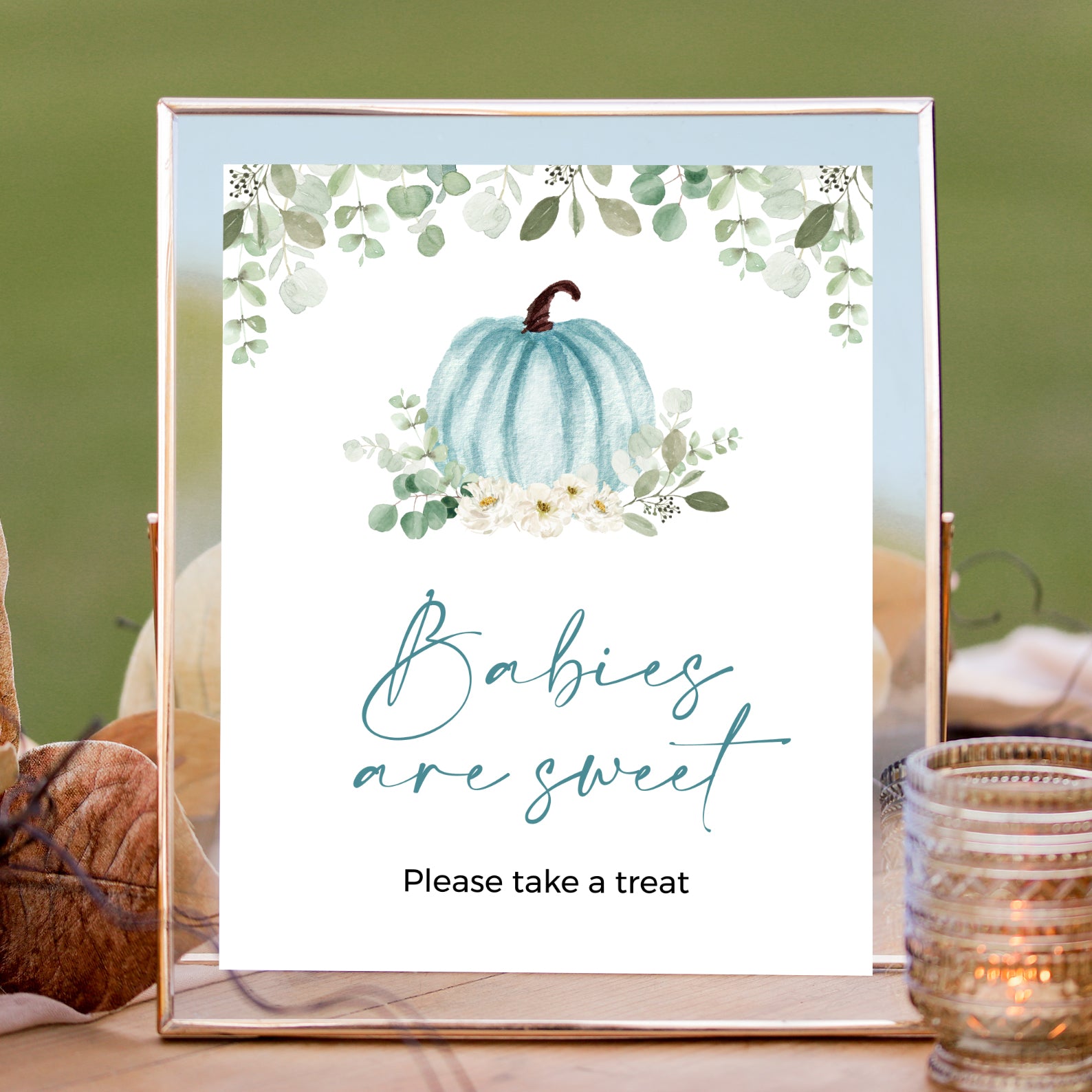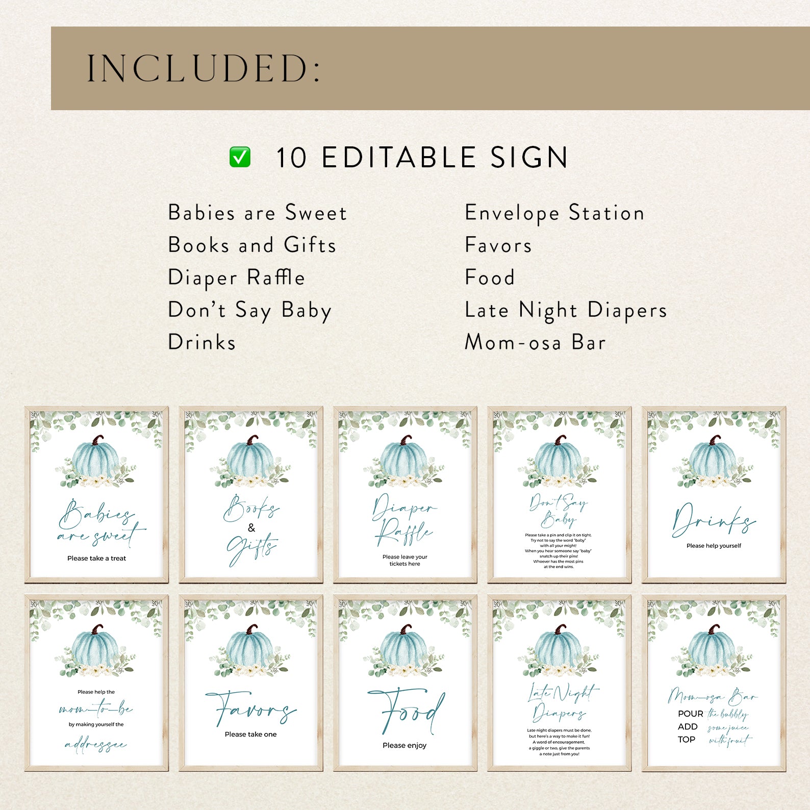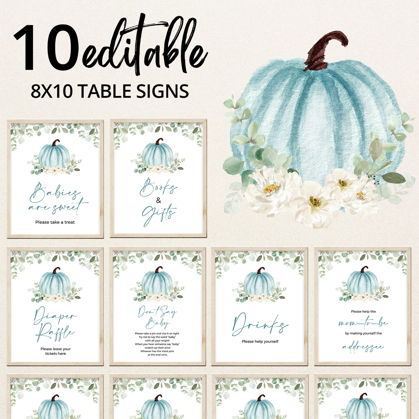 Elevate your autumn baby shower with this charming set of 10 editable table signs. Each sign features a soft blue-green pumpkin with trailing greenery and delicate white florals, perfectly complementing a cozy fall setup. With labels like “Drinks,” “Food,” “Babies Are Sweet,” and more, this bundle adds both function and seasonal flair to your celebration décor.