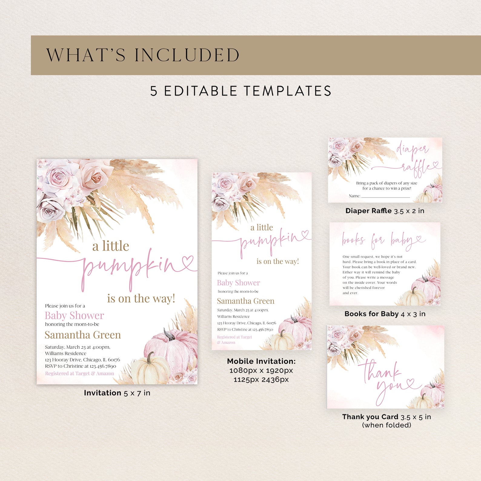 - Purchase this Boho Fall Baby Shower Invite Bundle: A Little Pumpkin with Pink Roses template