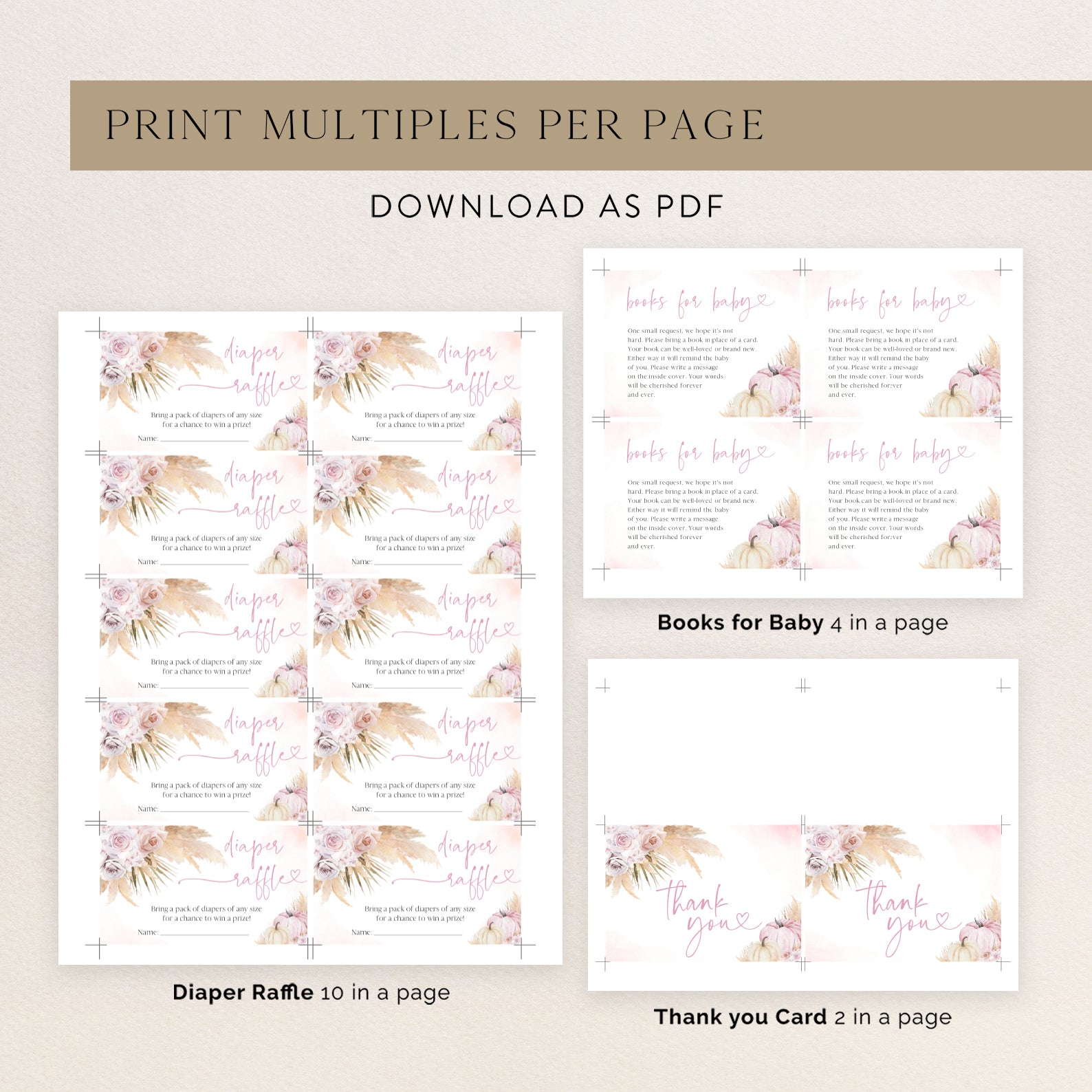 Celebrate your little pumpkin with our Boho-themed fall baby shower invitation bundle. Featuring a digital invitation, mobile invite, diaper raffle, books for baby card, and thank you card, this set highlights delicate pink roses, pampas grass, and autumn pumpkins. Perfect for adding a touch of warmth and charm to your fall gathering.