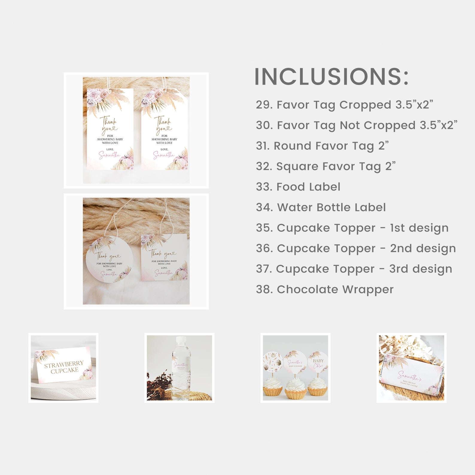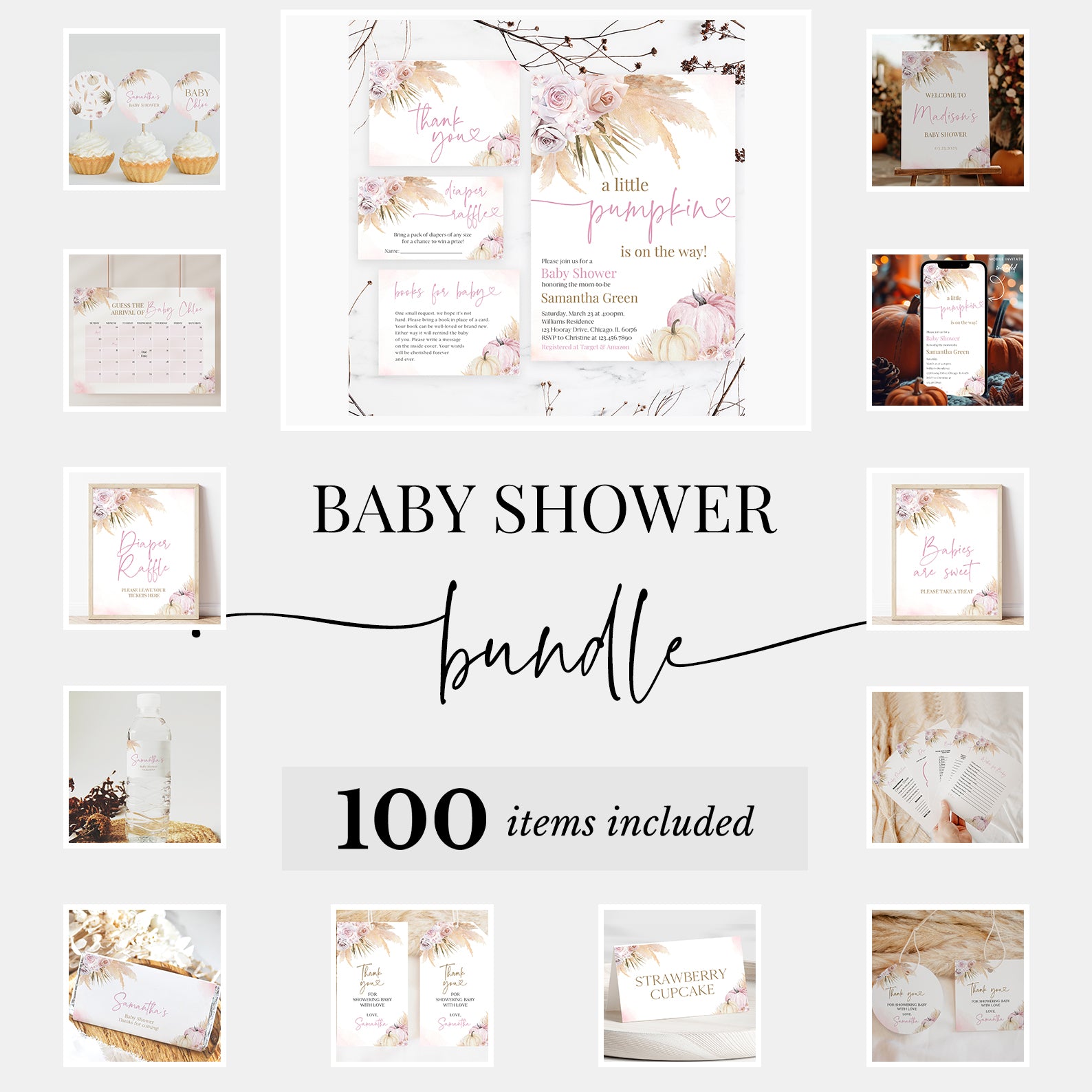 Create a picture-perfect baby shower with this 100-piece editable mega bundle, all featuring a stunning boho fall theme. With watercolor pumpkins, soft blush roses, and pampas grass accents, every item from invitations to favor tags and cupcake toppers adds a warm, cohesive touch to your celebration. Whether you’re hosting a small gathering or a grand event, this bundle ensures everything is beautifully coordinated from start to finish.