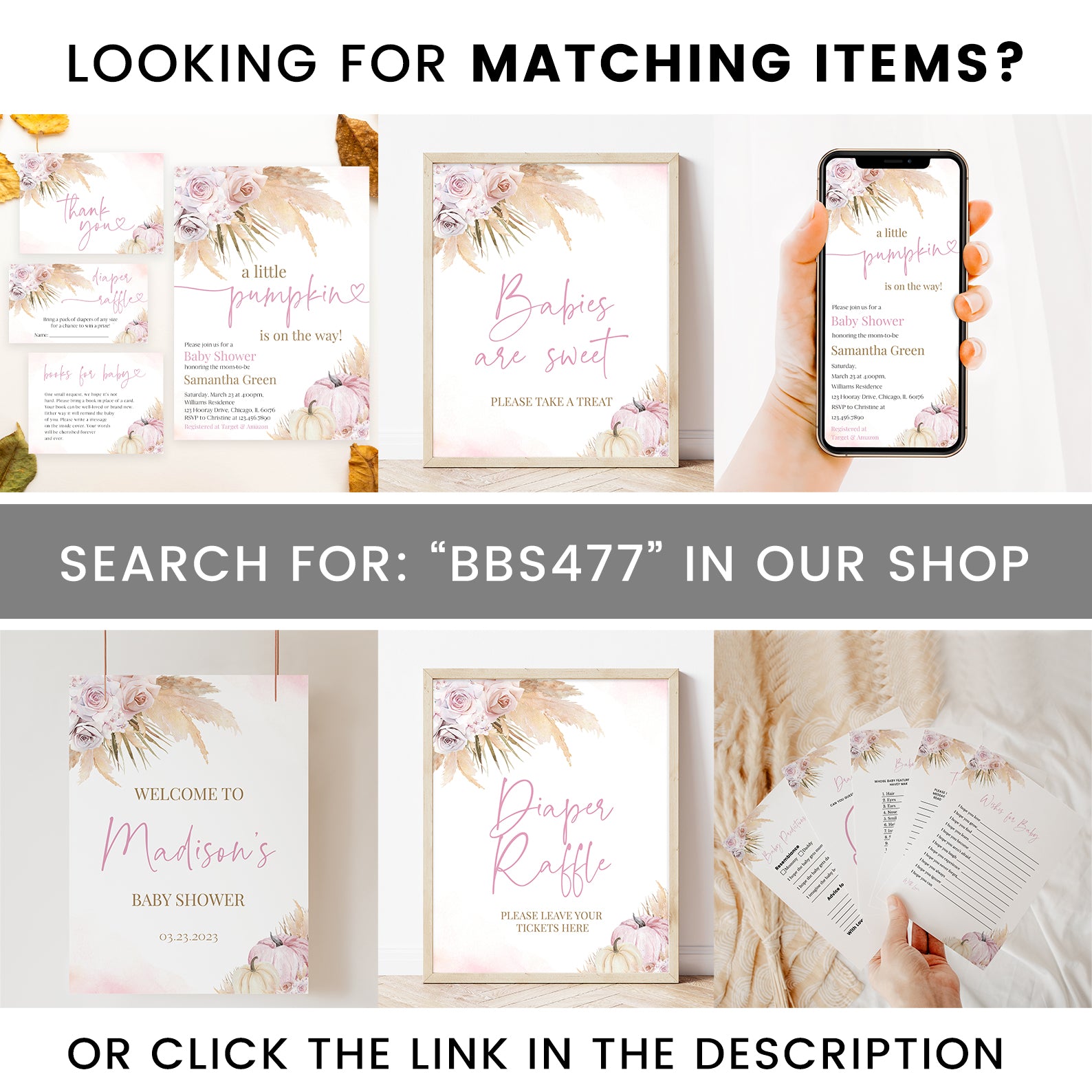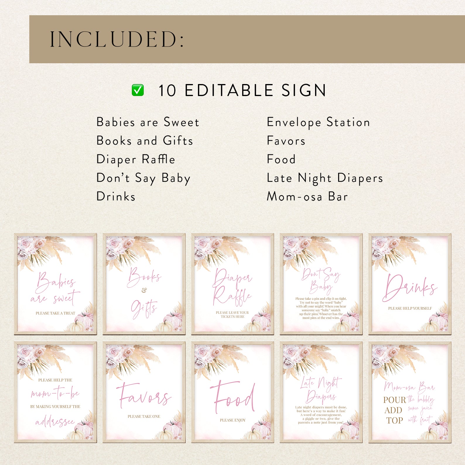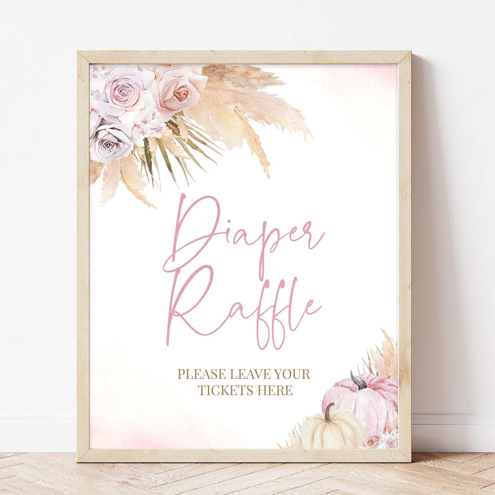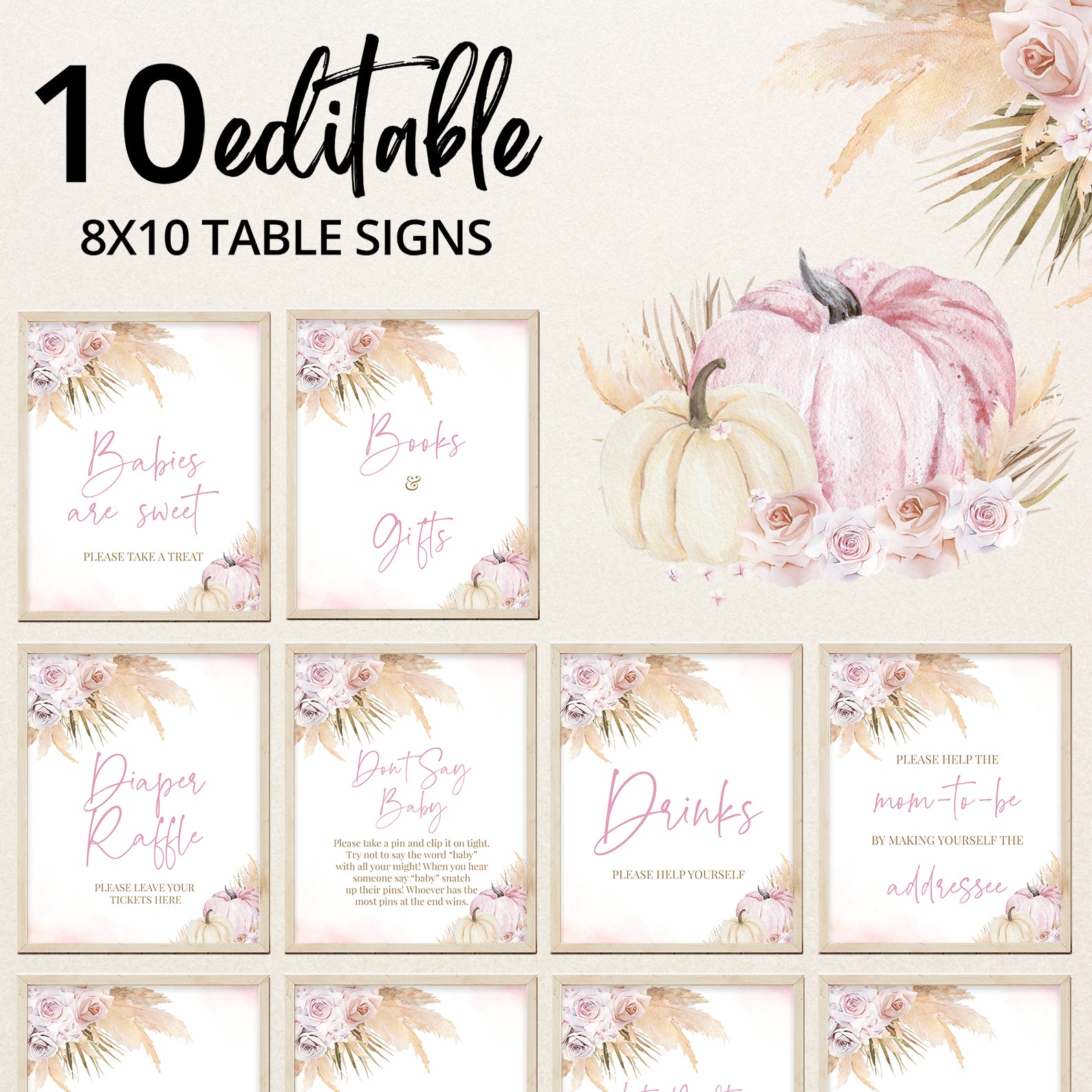 Elevate your fall baby shower with this set of ten editable boho-style table signs. Each design features soft pink roses, neutral pampas grass, and watercolor pumpkins for a chic seasonal look. Signs include favorites like “Mom-osa Bar,” “Diaper Raffle,” and “Books and Gifts,” adding a cohesive, stylish touch to every table. Perfect for guiding guests while complementing your warm, rustic baby shower décor.