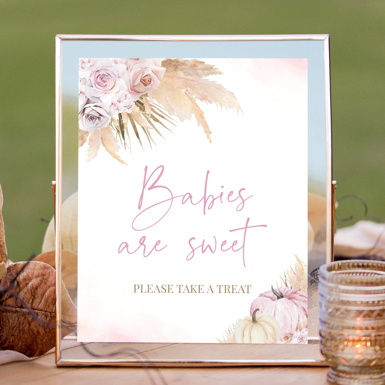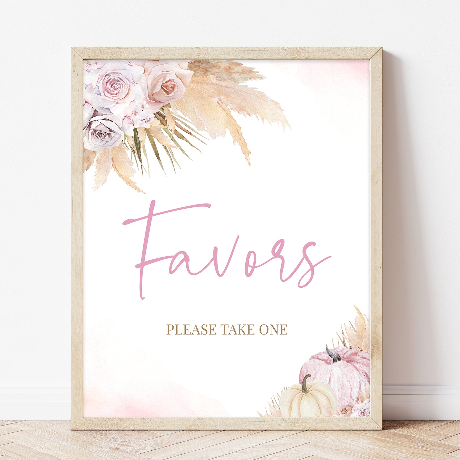 - Purchase this Boho Fall Baby Shower Table Sign: A Little Pumpkin with Pink Roses template