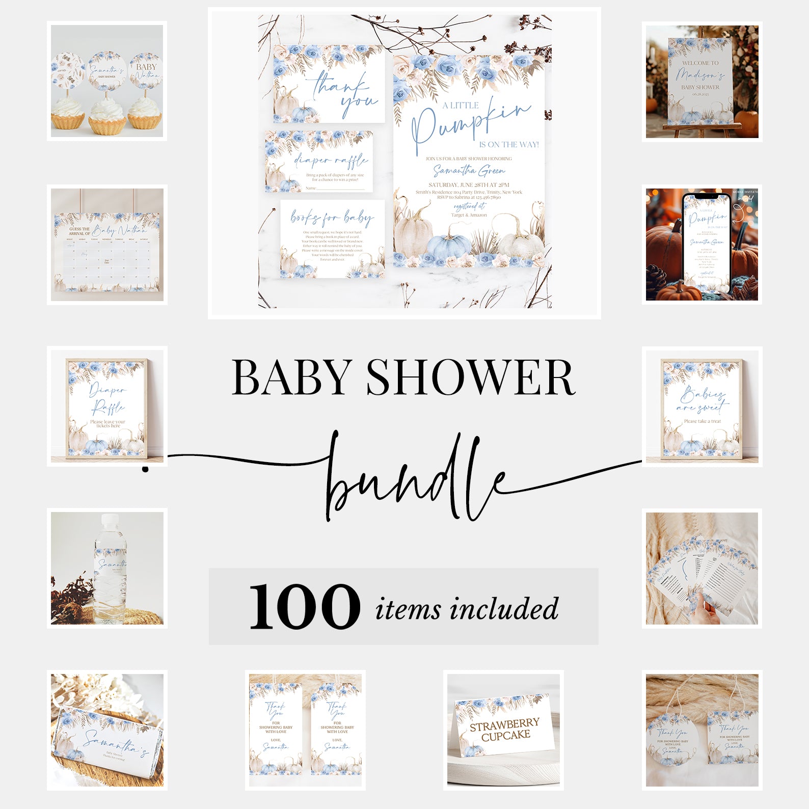 Plan the ultimate fall baby shower with this 100-piece digital bundle, thoughtfully designed in soft pink or blue with watercolor pumpkins, boho roses, and leafy accents. Includes invitations, signs, favor tags, cupcake toppers, bottle labels, 60 editable games, and more. Every piece complements your autumn theme, making it easy to host a cohesive and beautifully styled celebration that’s both charming and stress-free.